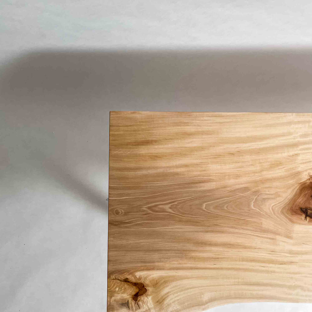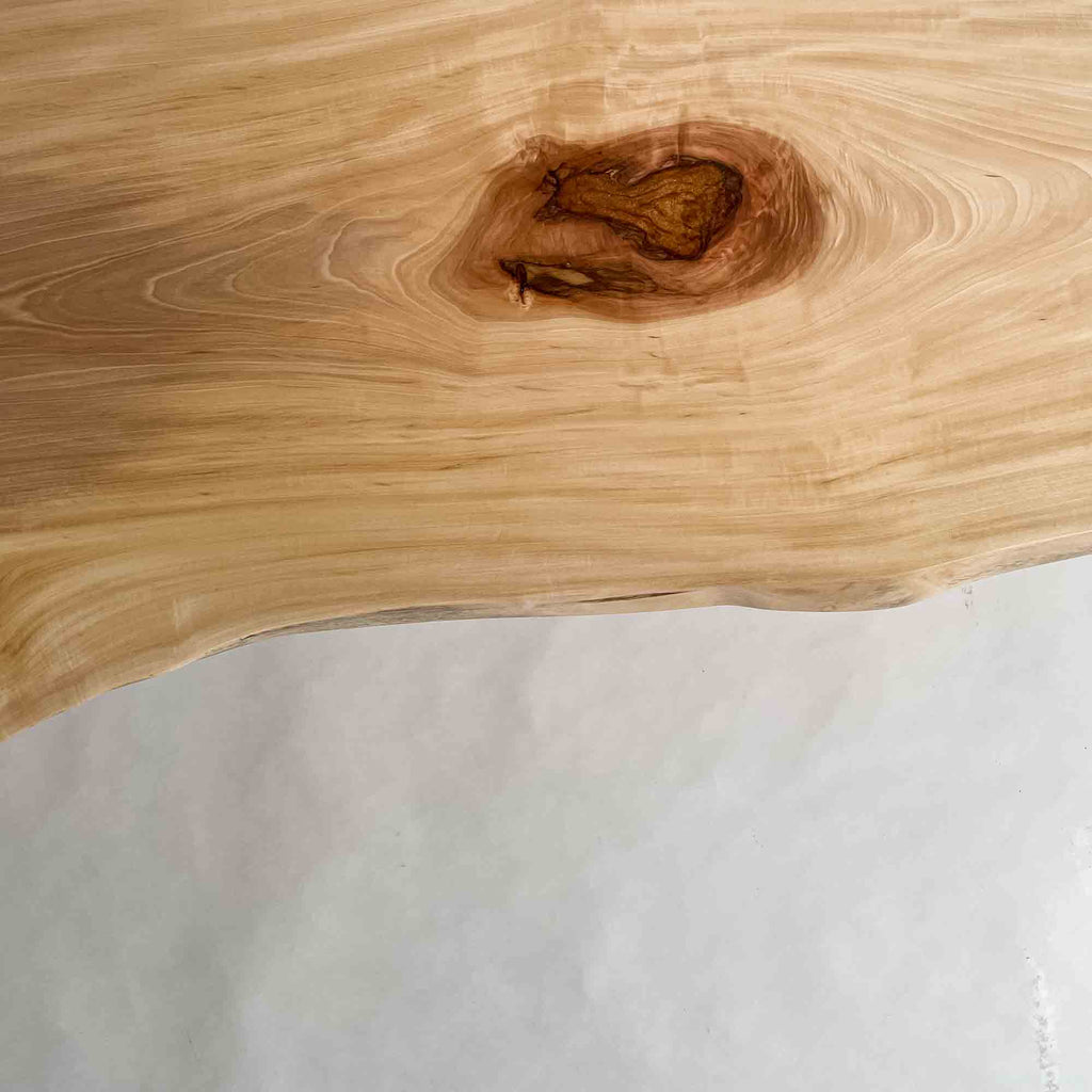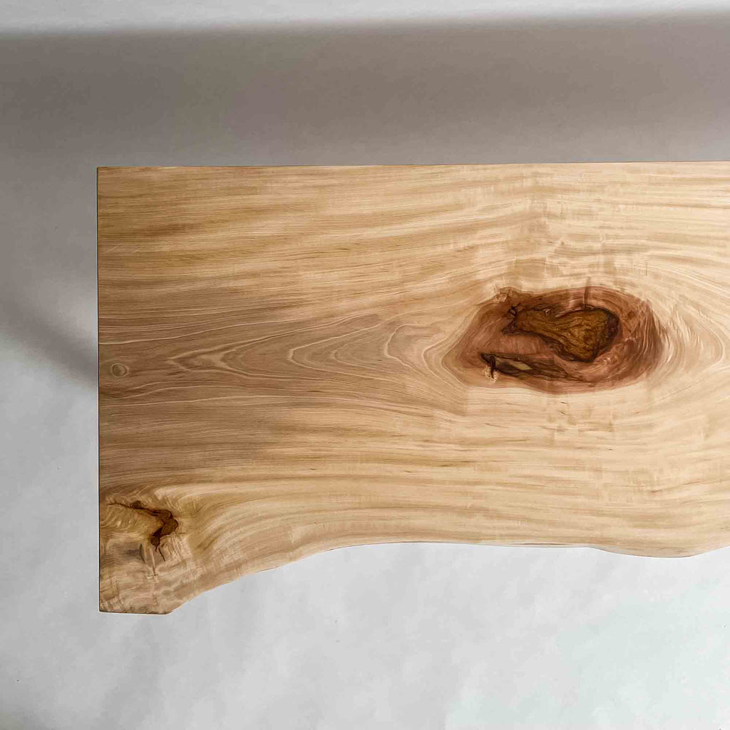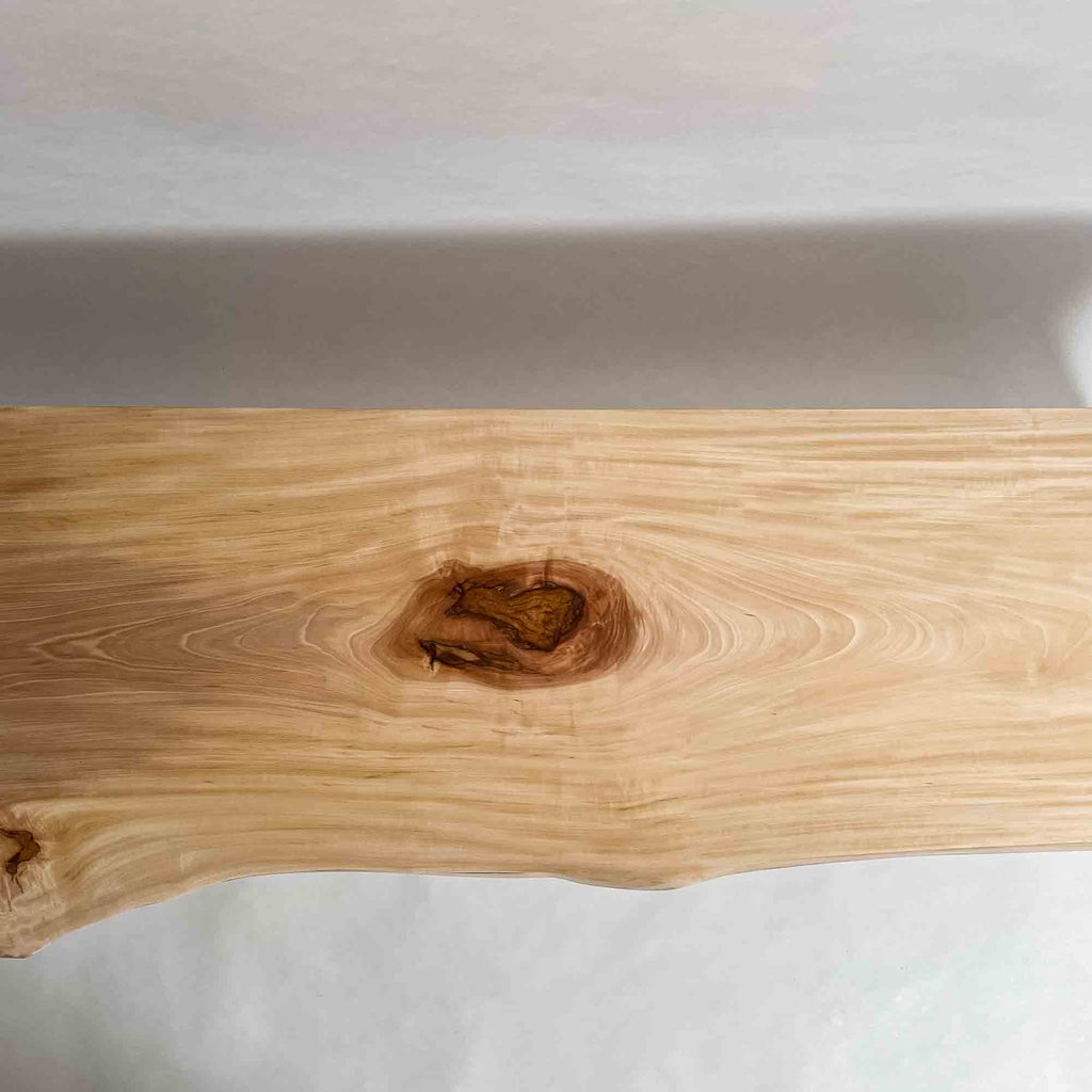 仕上がりの質感や印象にまで細やかに気を配り、使われる空間や暮らしを見据えた、やわらかな佇まいへと丁寧に仕上げる。 木が持つ節や皮、杢目の表情に寄り添い、その一つひとつを活かすことで、唯一無二の素材美を際立たせた一枚板づくりを行う。