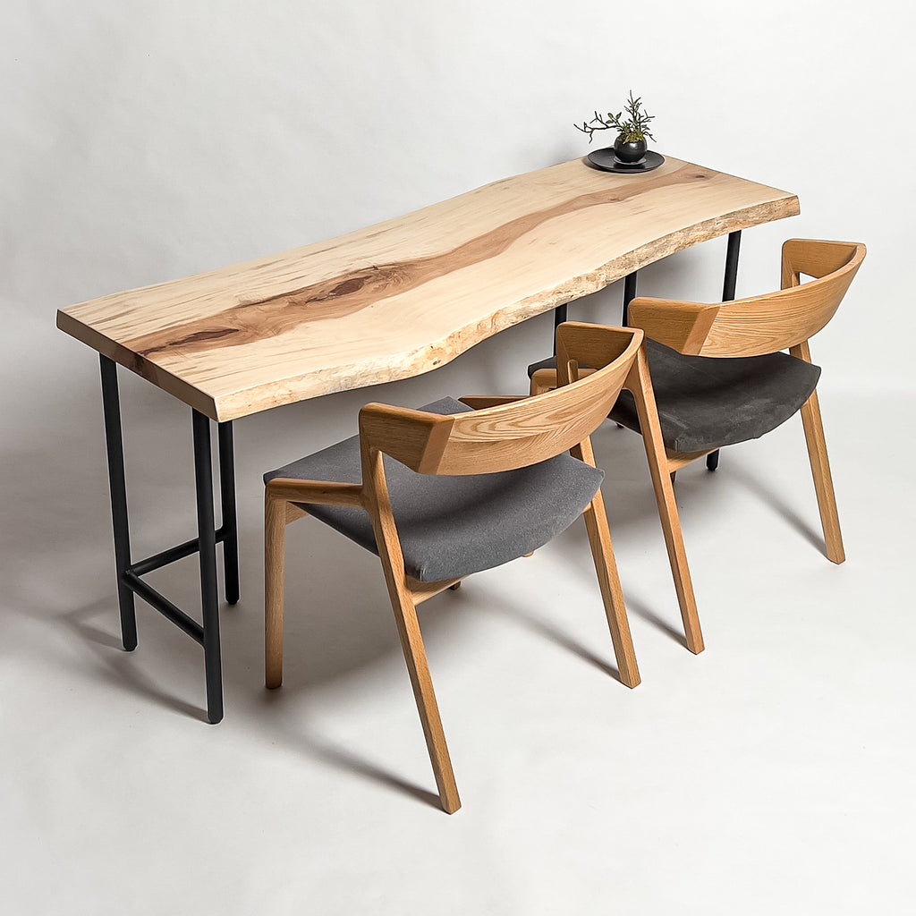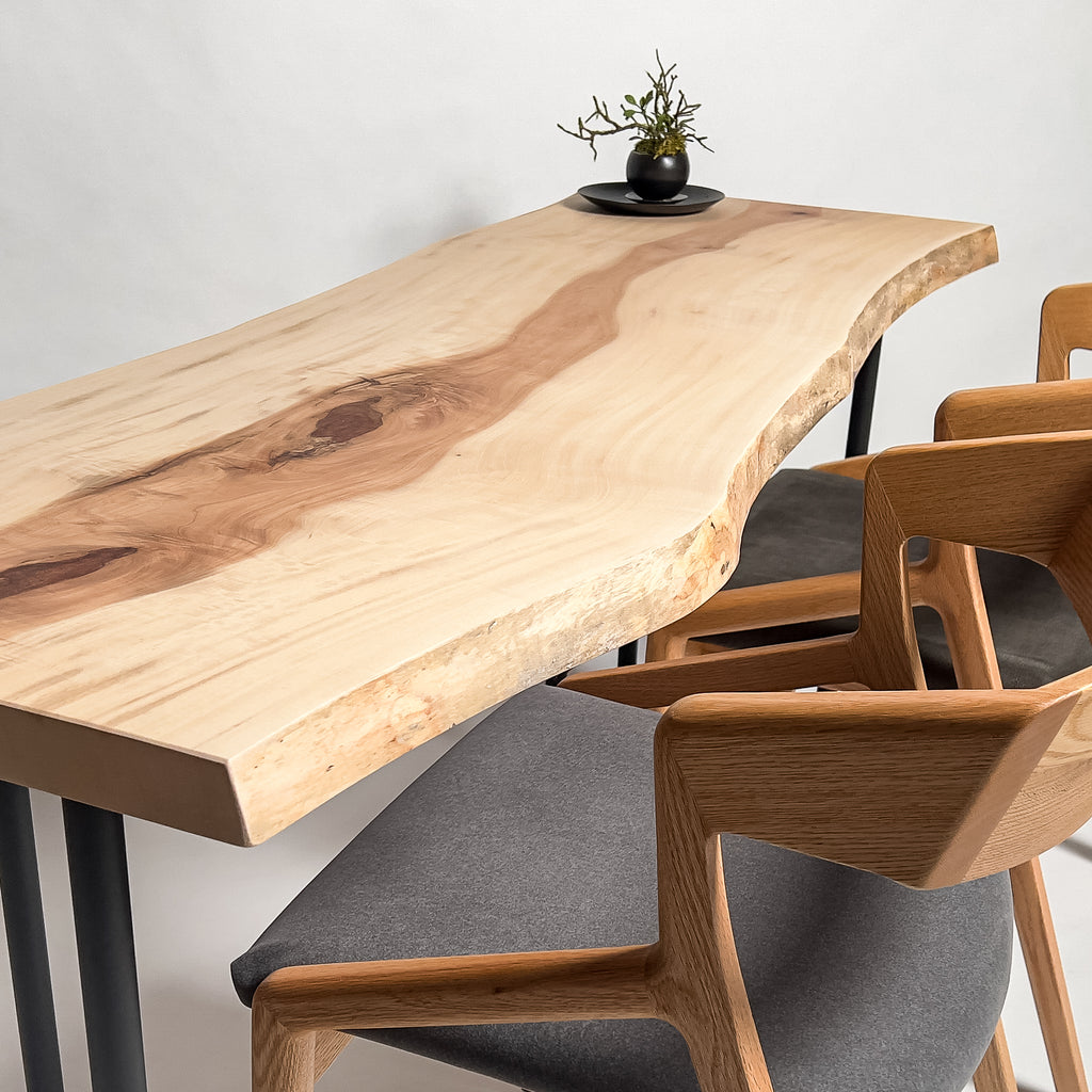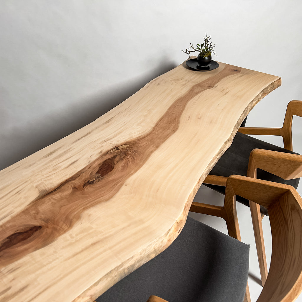 一枚板がもつ力強さとしなやかさを見極め、荒々しさと繊細さを併せ持つ加工を施すことで、その躍動感を余すことなく引き出す。 肌触り、見た目、素材感。そのすべてにおいて高い調和を図り、熟練の技術と豊富な経験をもとに、一枚板の魅力を緻密に引き出す。