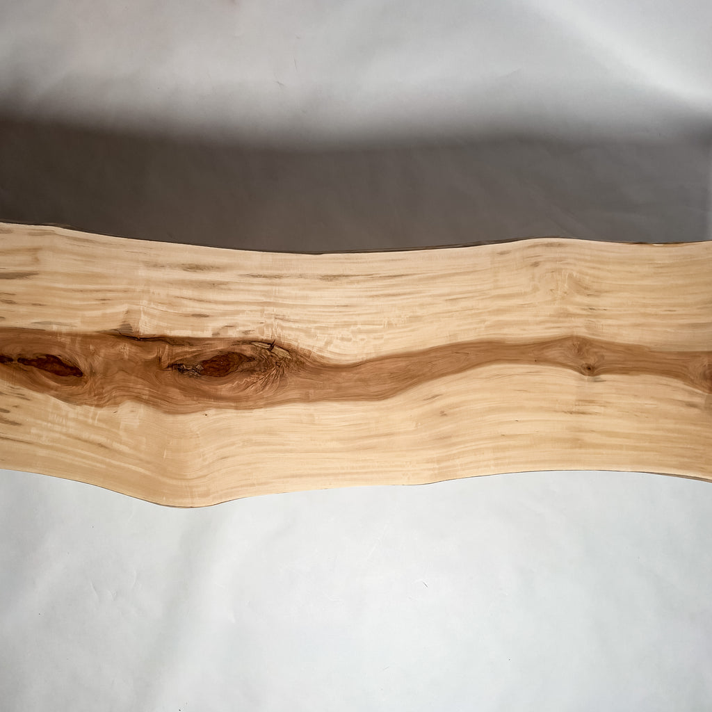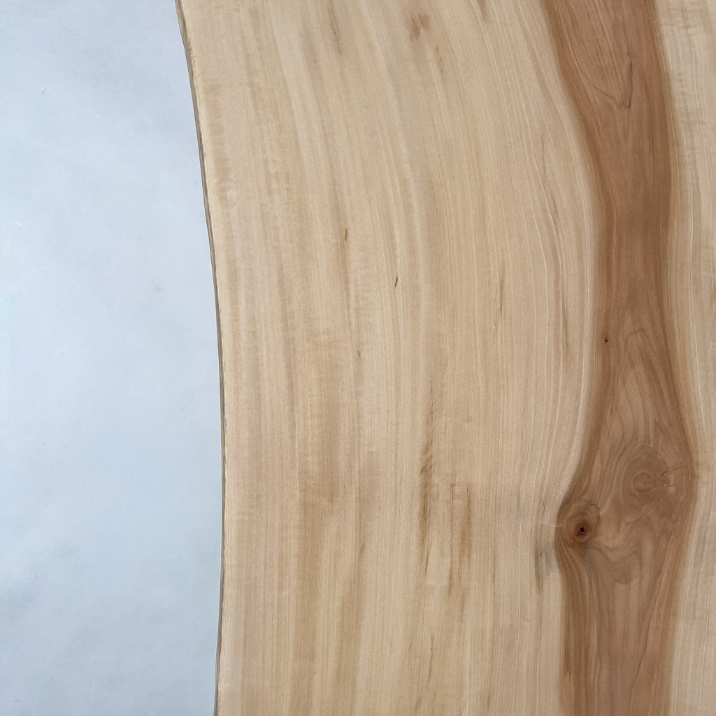 仕上がりの質感や印象にまで細やかに気を配り、使われる空間や暮らしを見据えた、やわらかな佇まいへと丁寧に仕上げる。 木が持つ節や皮、杢目の表情に寄り添い、その一つひとつを活かすことで、唯一無二の素材美を際立たせた一枚板づくりを行う。