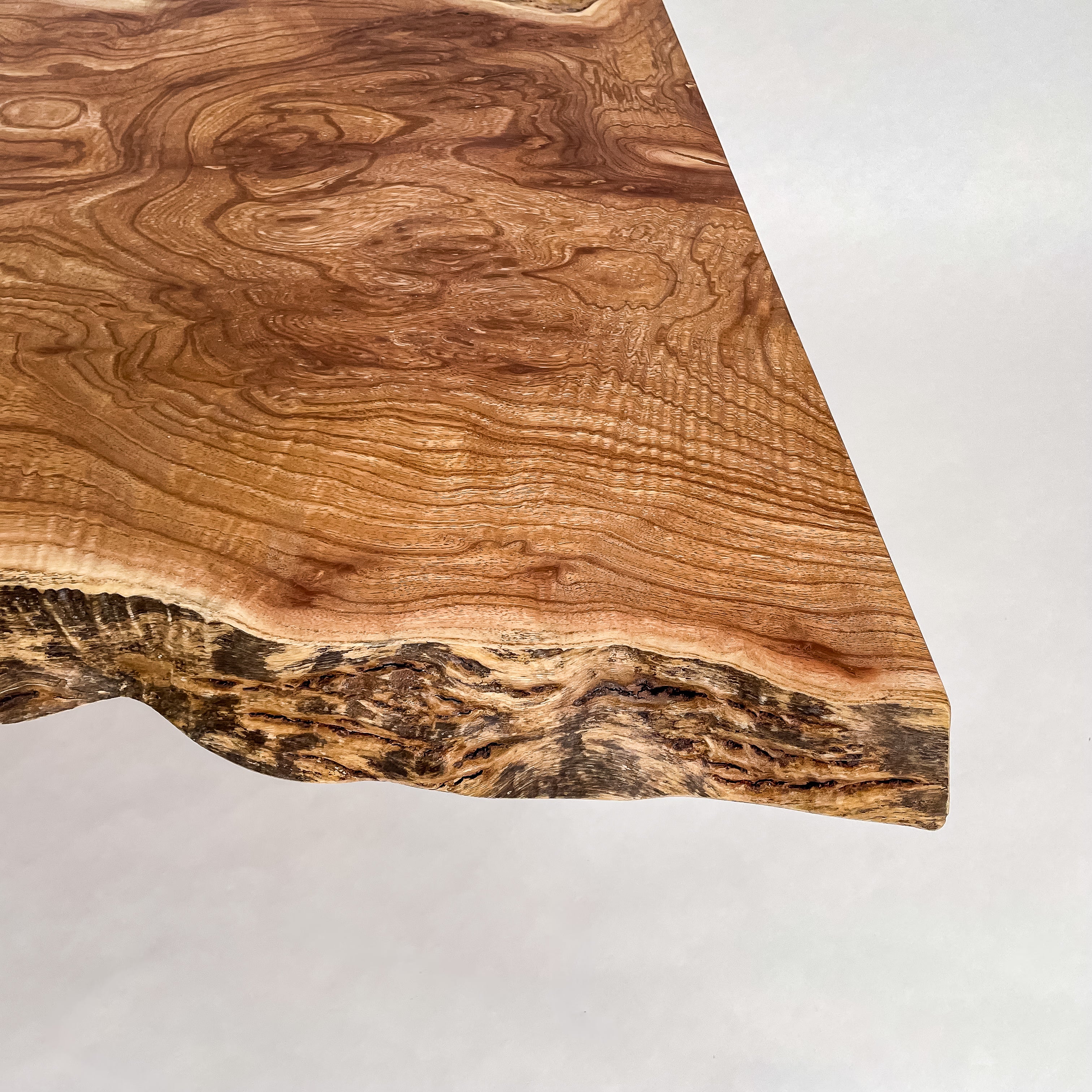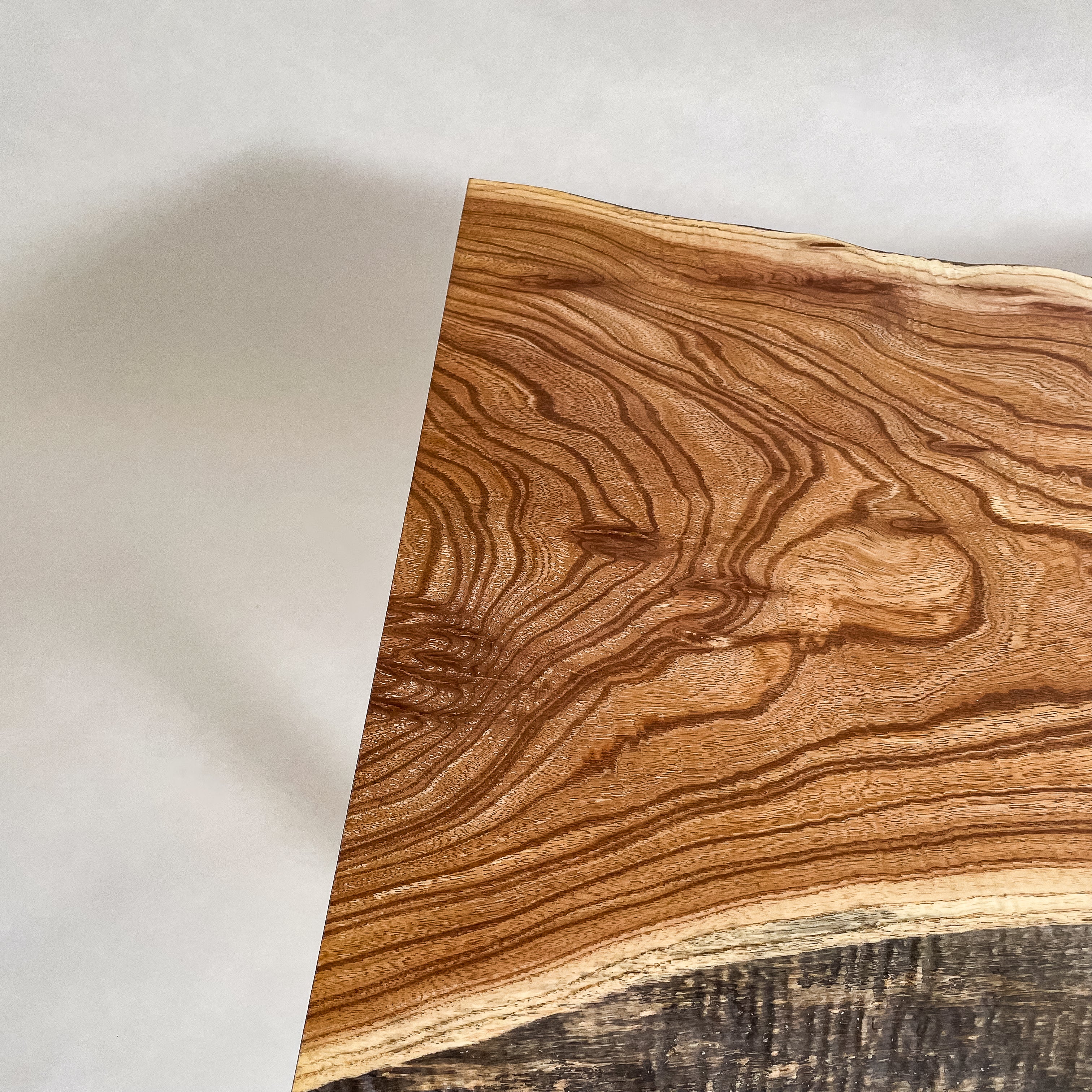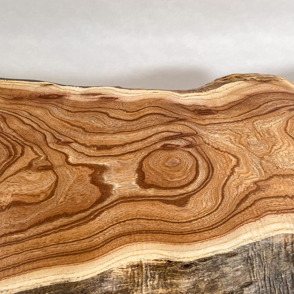 木肌に浮かぶ立体的な玉杢は、センダンが陽を浴びて育つ途中で芽吹いた節が形づくった模様です。ゆるやかな波を描く曲線を丁寧に整え、自然のままの力強さとやわらかな表情を上品に残しました。
