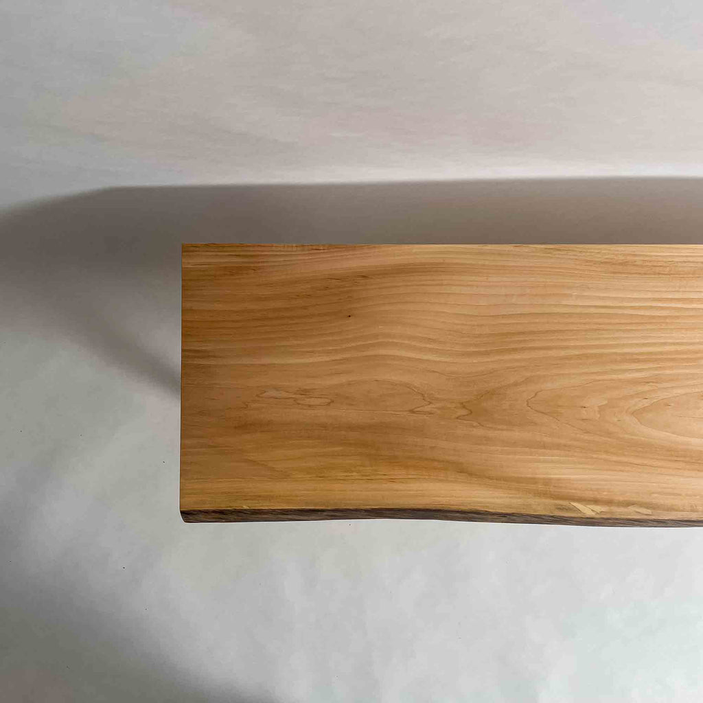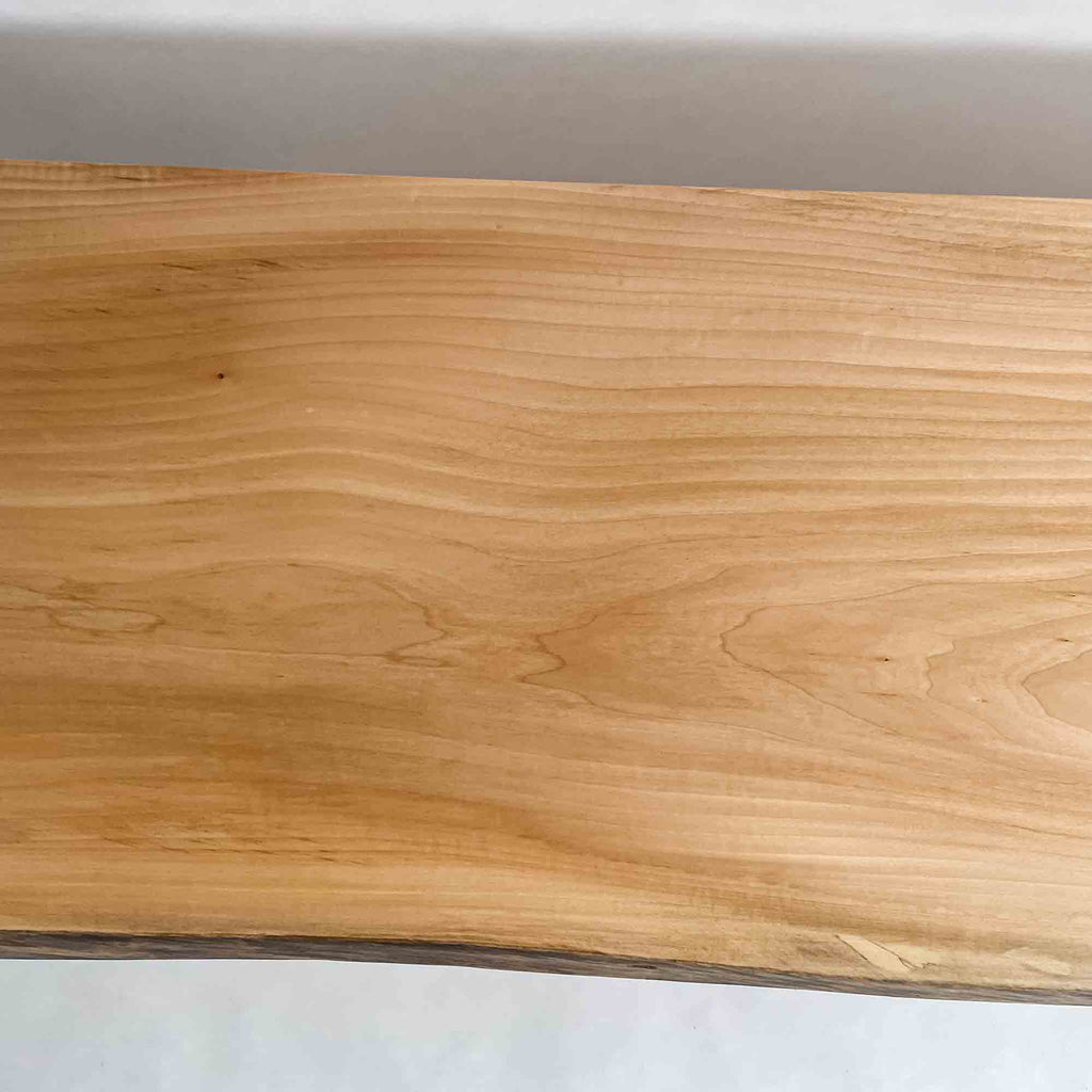 山あいの湿り気を含んで育った水目桜の木肌に、やわらかな“流れ杢”が静かに広がっています。赤身と白太が重なる境目は、季節ごとの水の巡りが描いた淡いグラデーション。側面には樹皮近くの揺らぎがそのまま息づき、丁寧な加工で自然の動きをそっと残しています。穏やかな風景を纏った一枚。