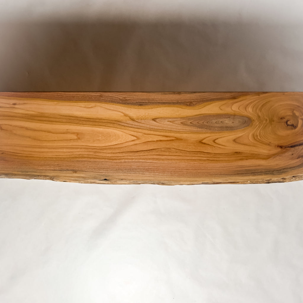 山の斜面で風と光を受け育った欅。蜜のような飴色の地に、成長の揺らぎが年輪となって現れます。耳を残す仕立てが木の鼓動を伝える一枚。静かな躍動。時を重ねた深みが空間に落ち着きを添えます。