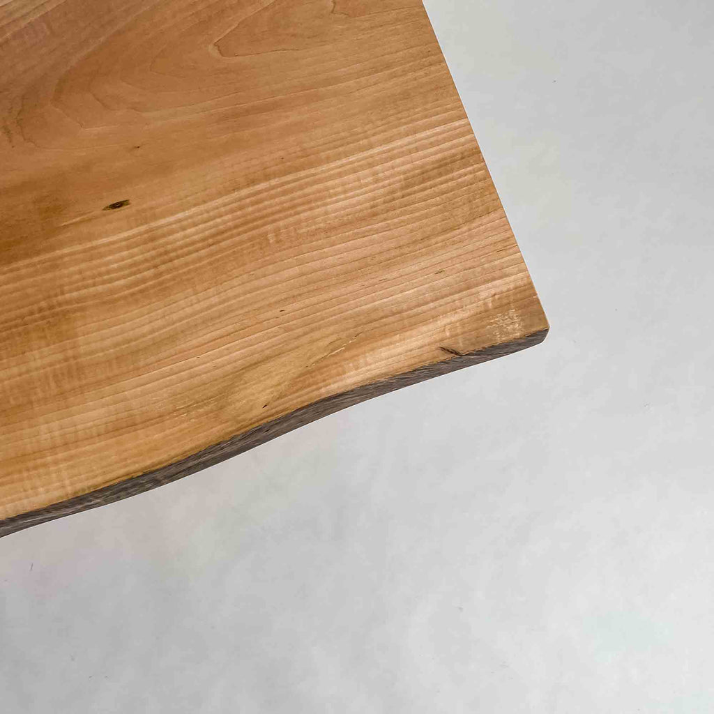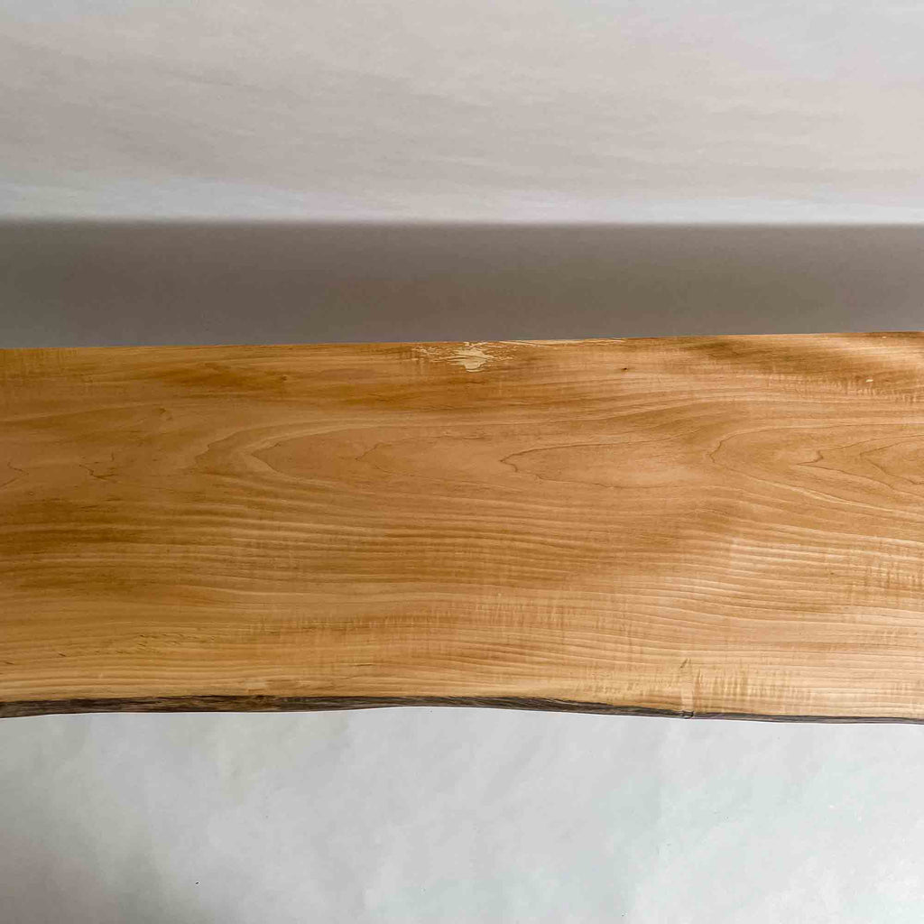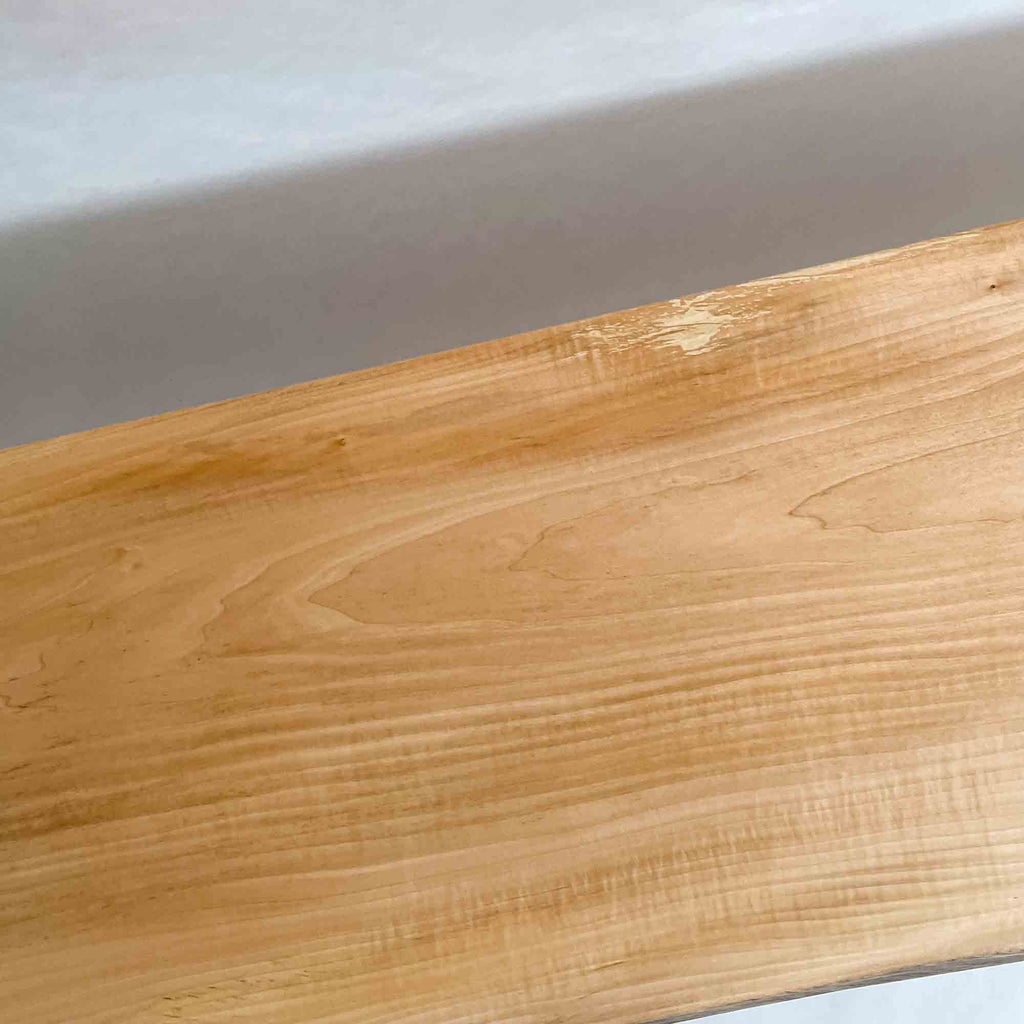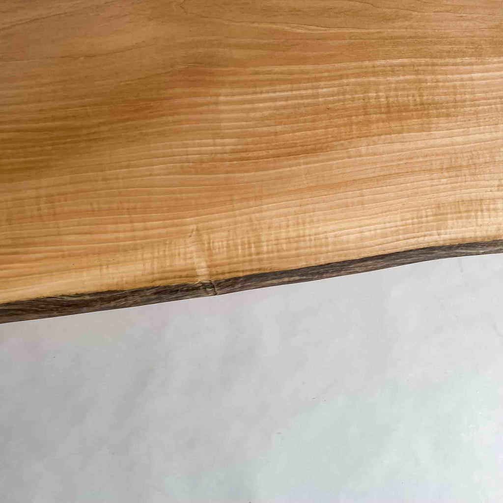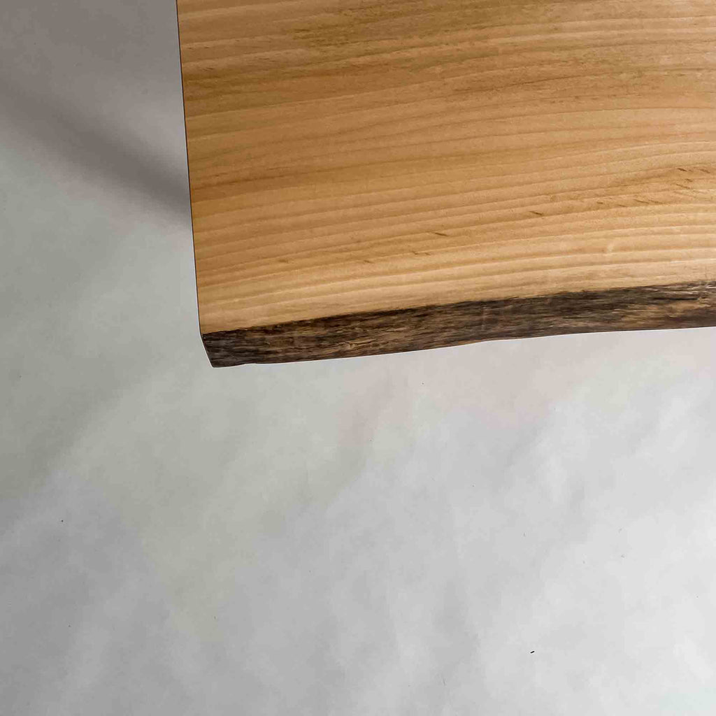 仕上がりの質感や印象にまで細やかに気を配り、使われる空間や暮らしを見据えた、やわらかな佇まいへと丁寧に仕上げる。 木が持つ節や皮、杢目の表情に寄り添い、その一つひとつを活かすことで、唯一無二の素材美を際立たせた一枚板づくりを行う。
