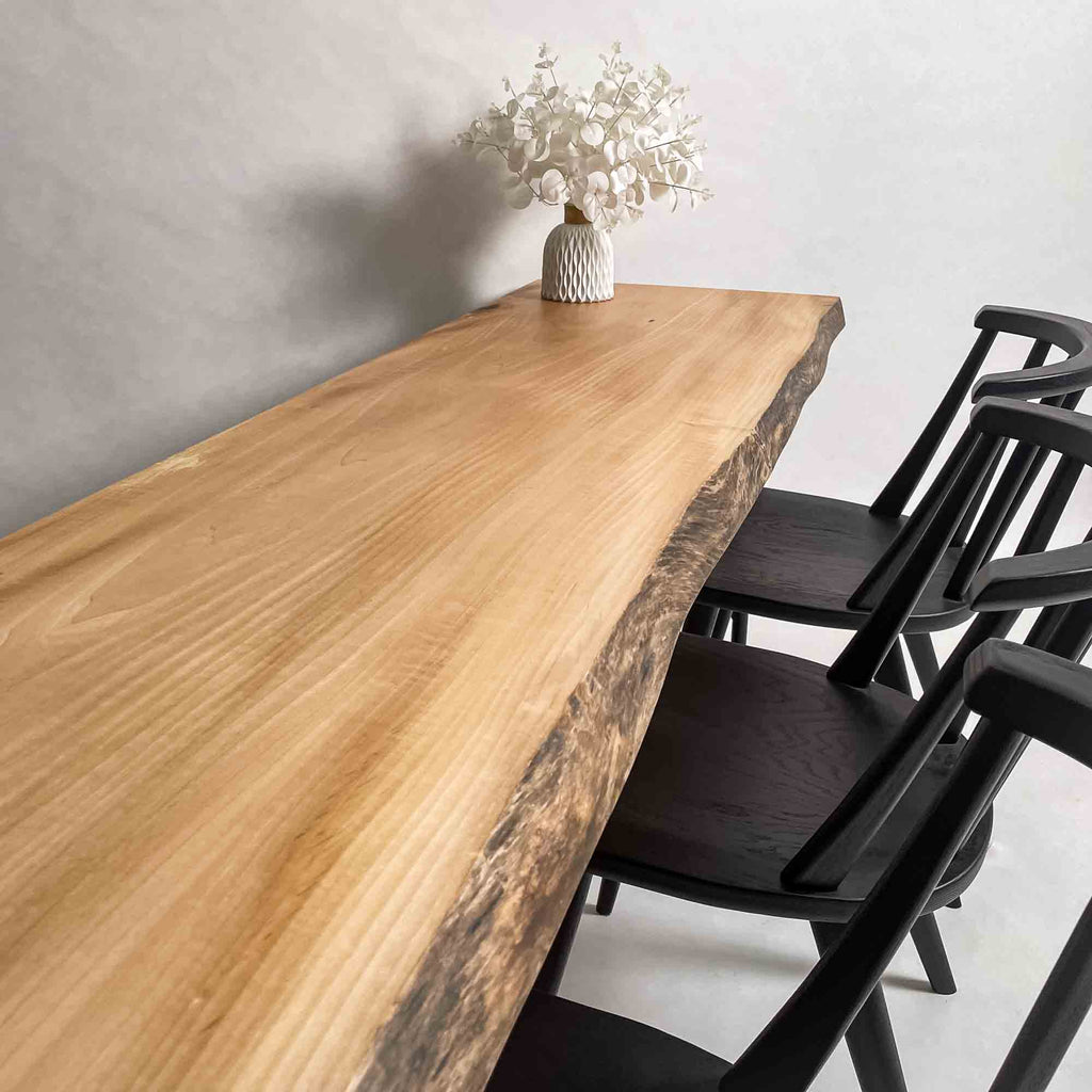 一枚板がもつ力強さとしなやかさを見極め、荒々しさと繊細さを併せ持つ加工を施すことで、その躍動感を余すことなく引き出す。 肌触り、見た目、素材感。そのすべてにおいて高い調和を図り、熟練の技術と豊富な経験をもとに、一枚板の魅力を緻密に引き出す。