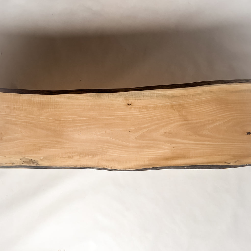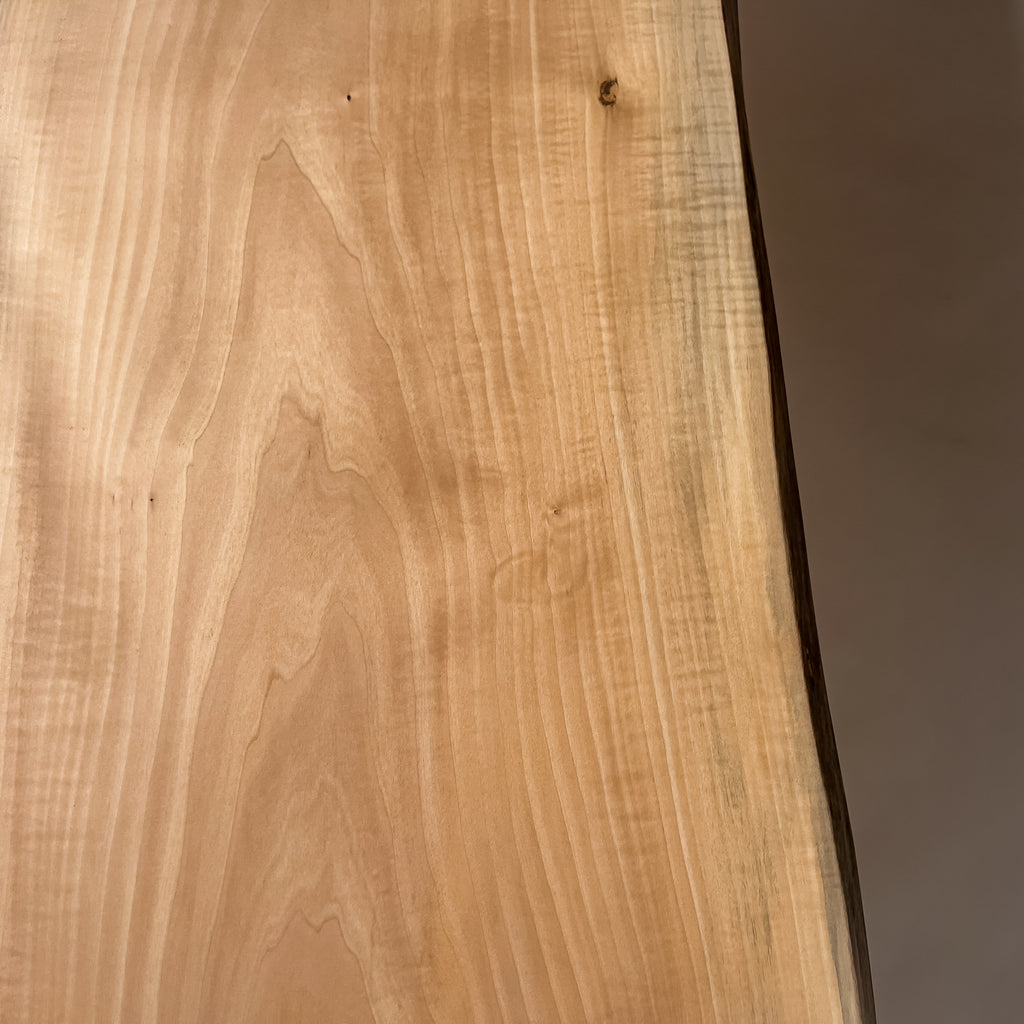 仕上がりの質感や印象にまで細やかに気を配り、使われる空間や暮らしを見据えた、やわらかな佇まいへと丁寧に仕上げる。 木が持つ節や皮、杢目の表情に寄り添い、その一つひとつを活かすことで、唯一無二の素材美を際立たせた一枚板づくりを行う。