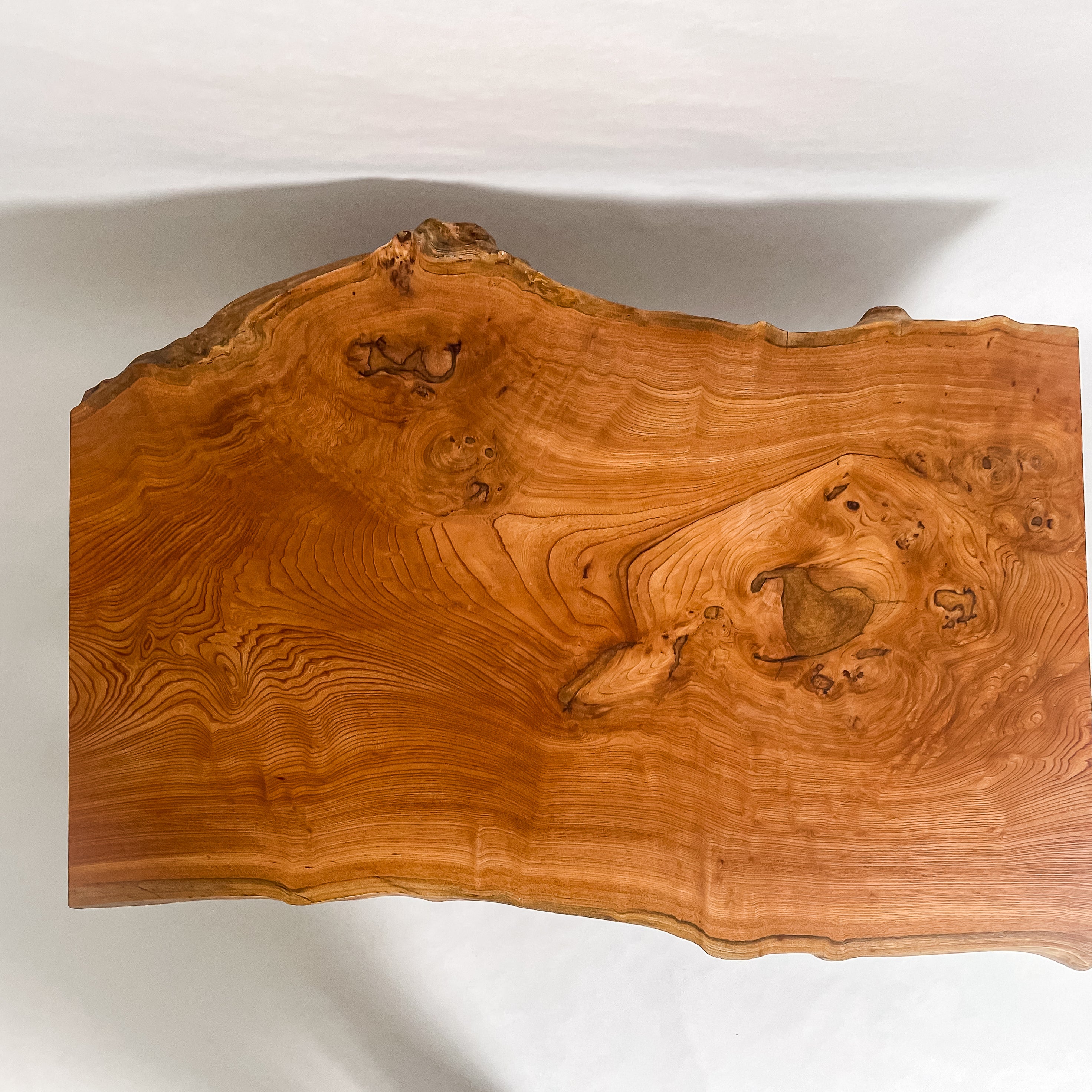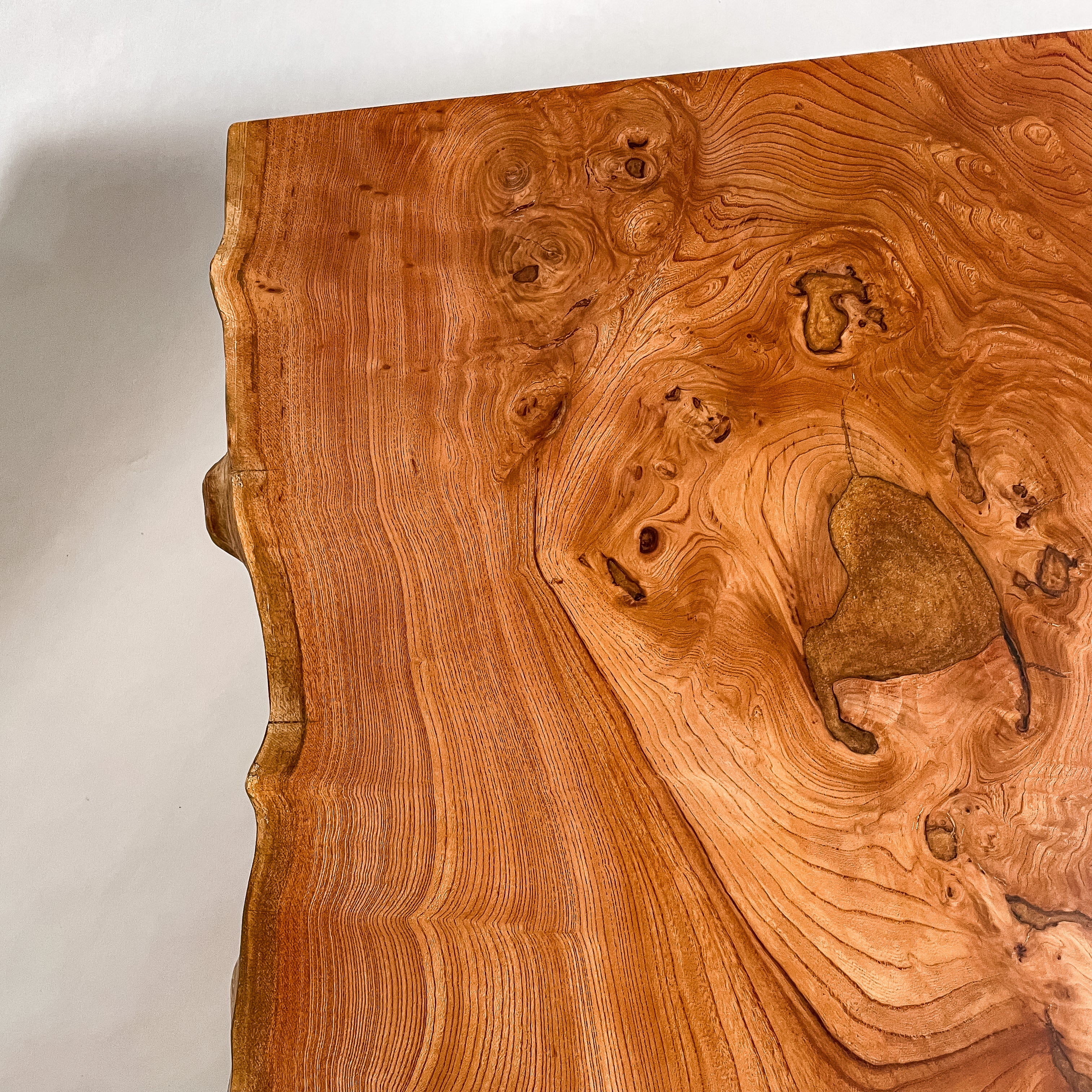 欅が長い年月で育んだ“縮み杢”が波のように広がり、自然の力強さを映した一枚です。陽を浴びて育った色味が柔らかく部屋に馴染みます。形の躍動感を丁寧に残した加工で、枝分かれの記憶まで静かに息づく存在。