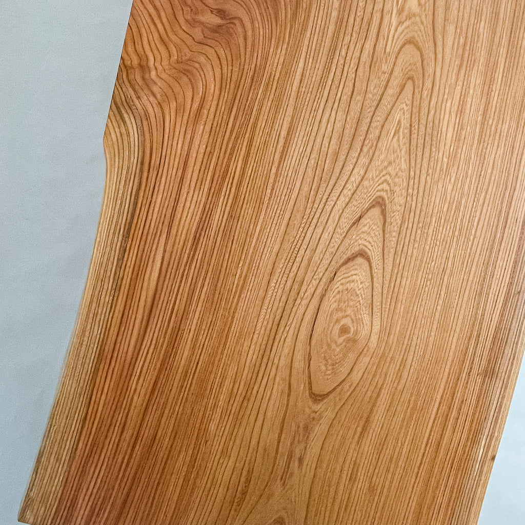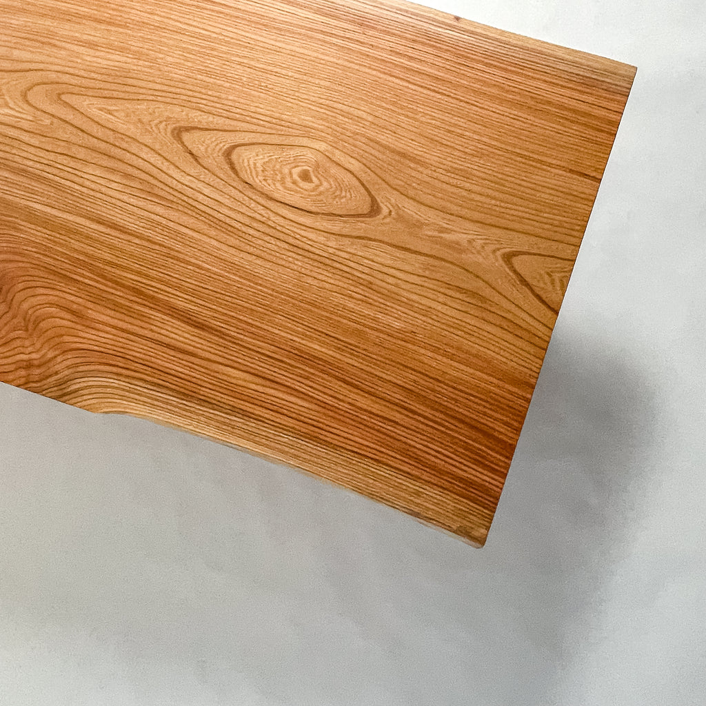 仕上がりの質感や印象にまで細やかに気を配り、使われる空間や暮らしを見据えた、やわらかな佇まいへと丁寧に仕上げる。 木が持つ節や皮、杢目の表情に寄り添い、その一つひとつを活かすことで、唯一無二の素材美を際立たせた一枚板づくりを行う。