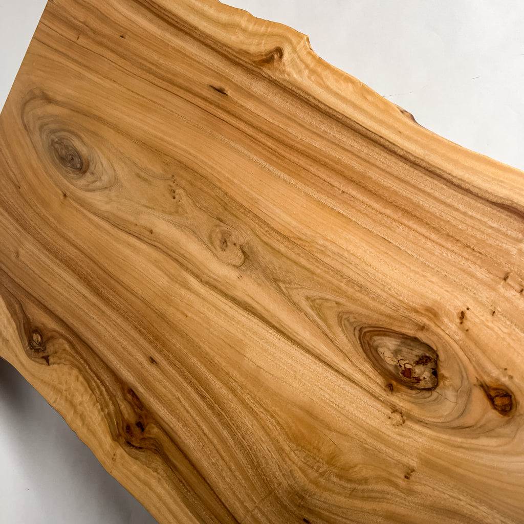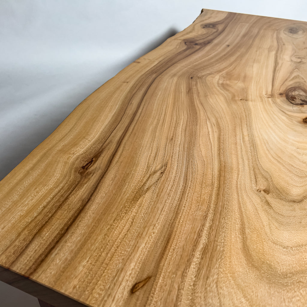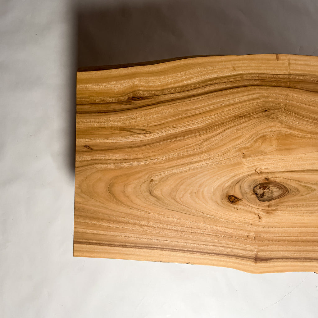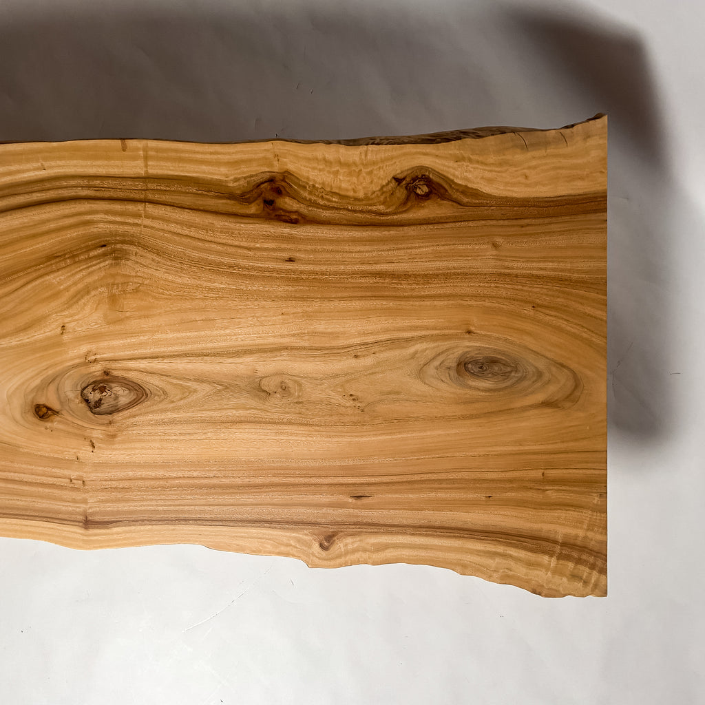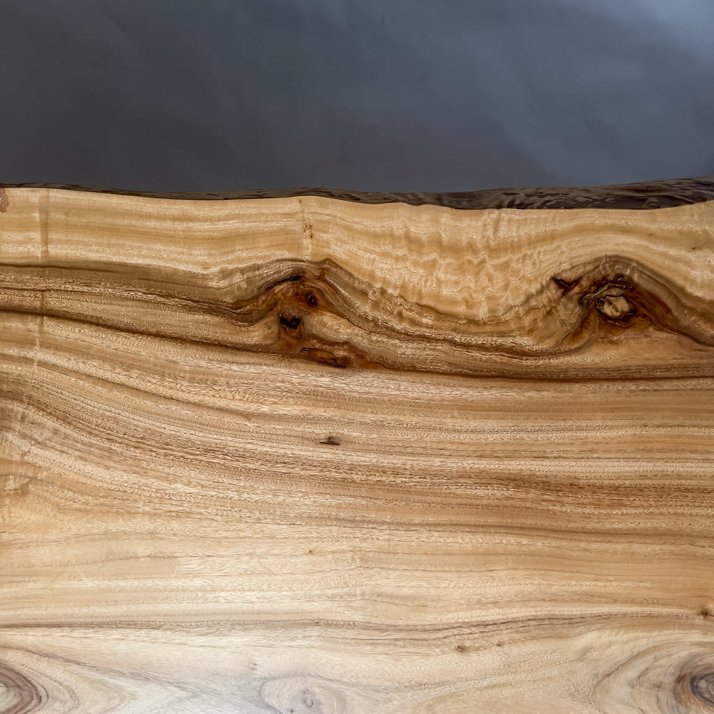 仕上がりの質感や印象にまで細やかに気を配り、使われる空間や暮らしを見据えた、やわらかな佇まいへと丁寧に仕上げる。 木が持つ節や皮、杢目の表情に寄り添い、その一つひとつを活かすことで、唯一無二の素材美を際立たせた一枚板づくりを行う。