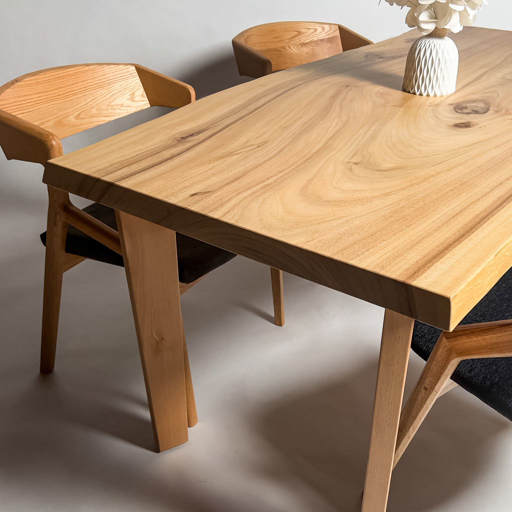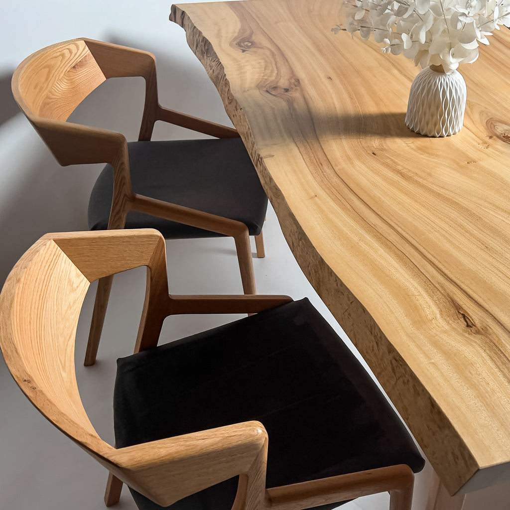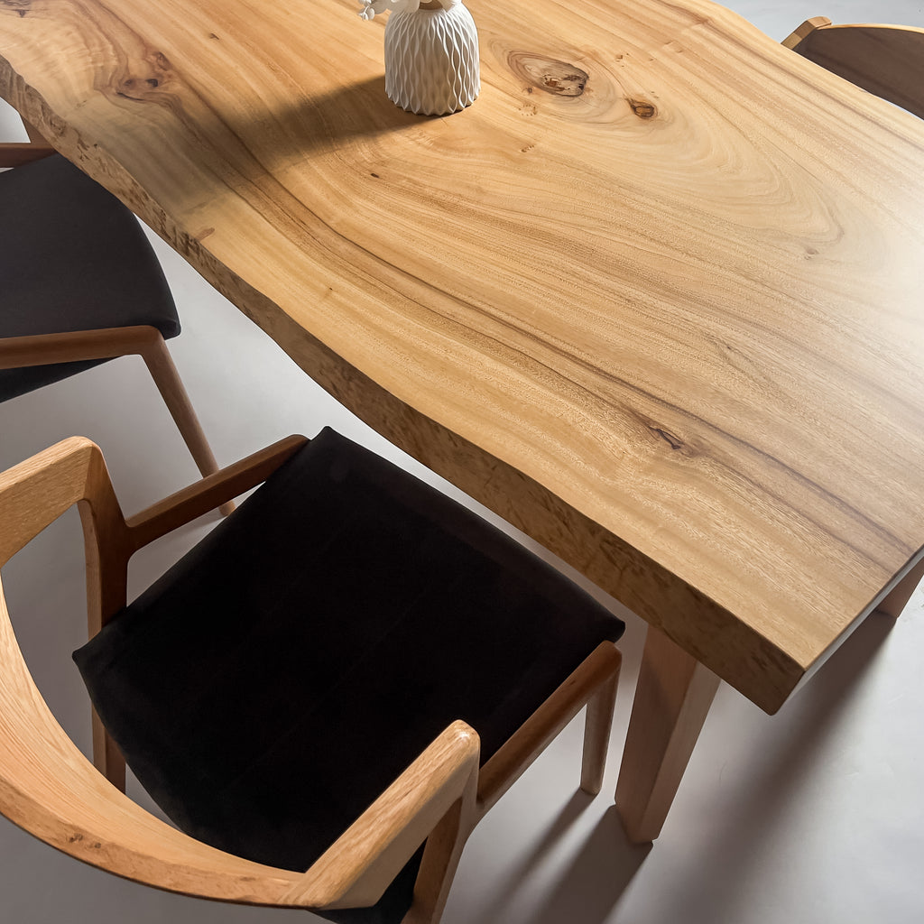 一枚板がもつ力強さとしなやかさを見極め、荒々しさと繊細さを併せ持つ加工を施すことで、その躍動感を余すことなく引き出す。 肌触り、見た目、素材感。そのすべてにおいて高い調和を図り、熟練の技術と豊富な経験をもとに、一枚板の魅力を緻密に引き出す。