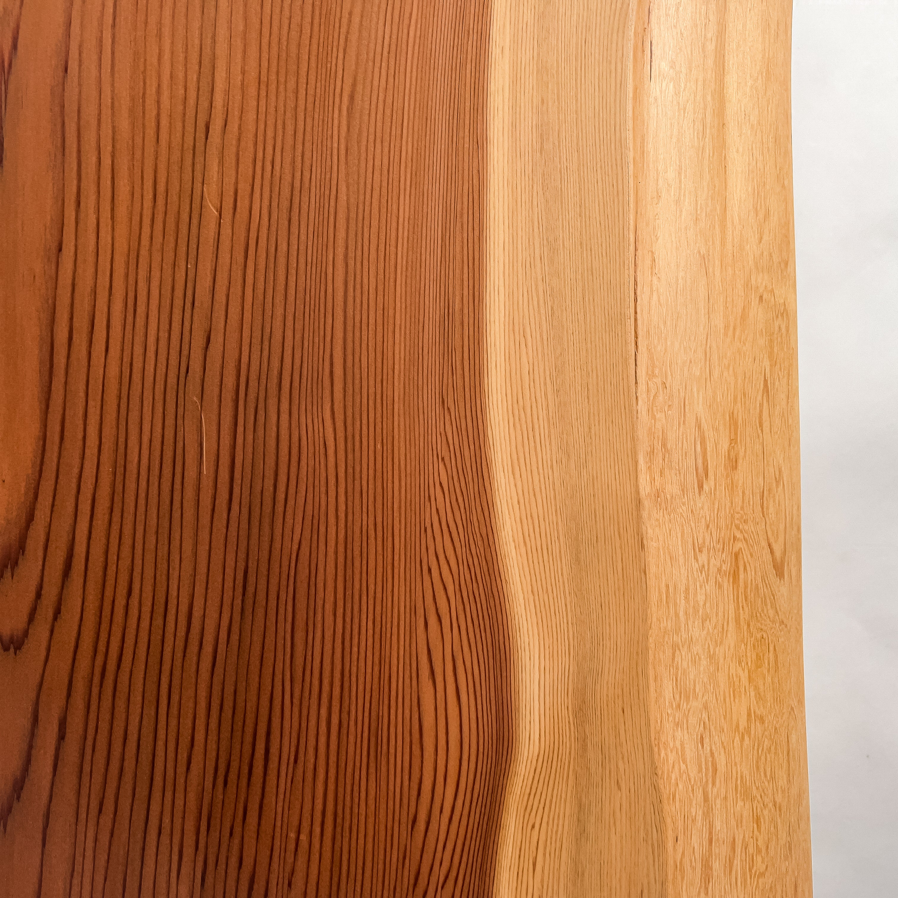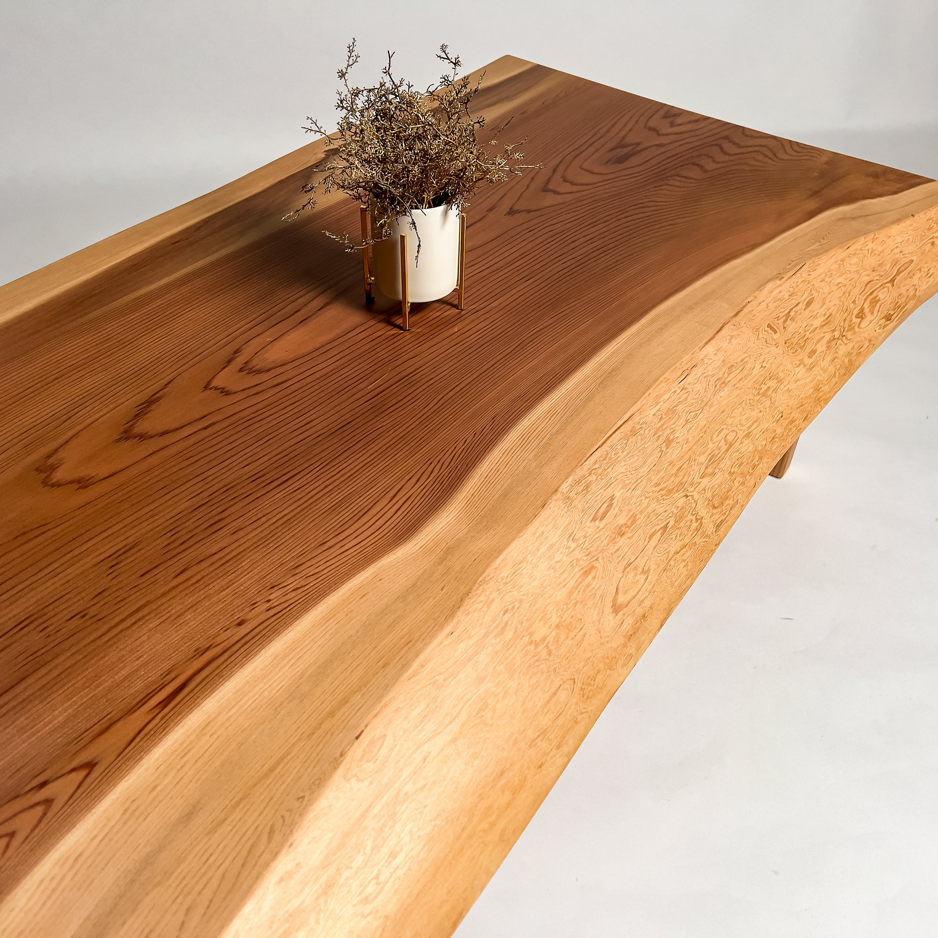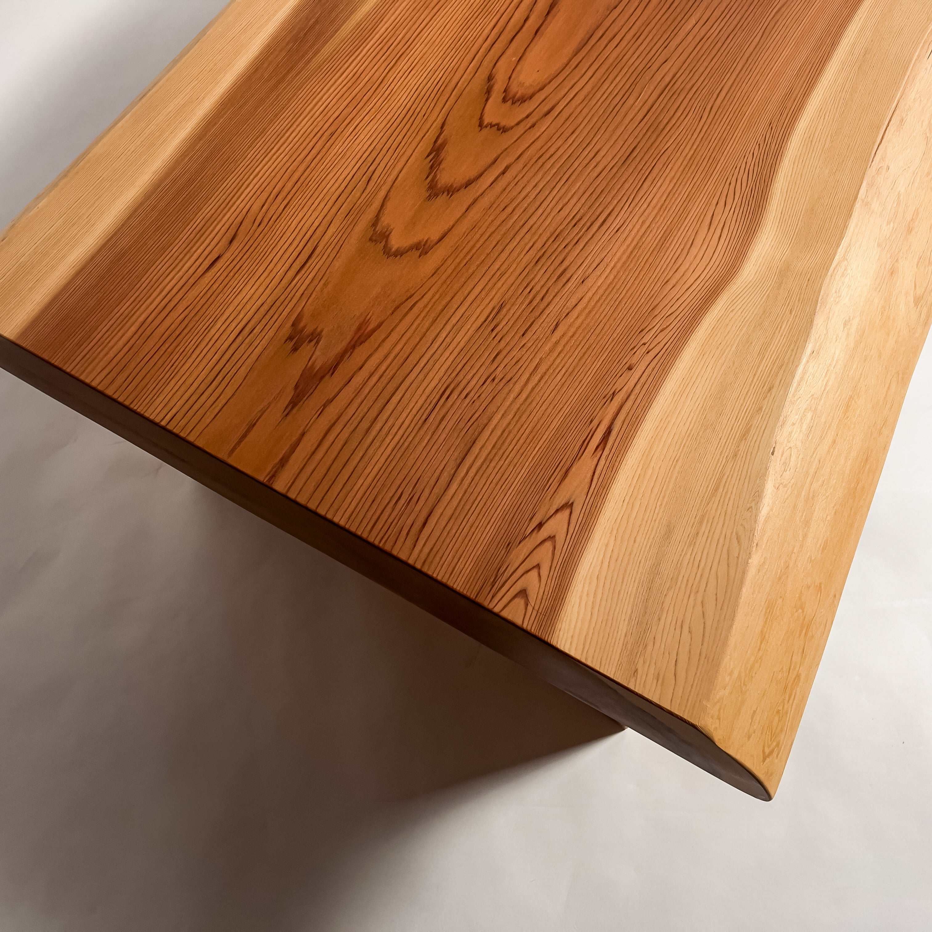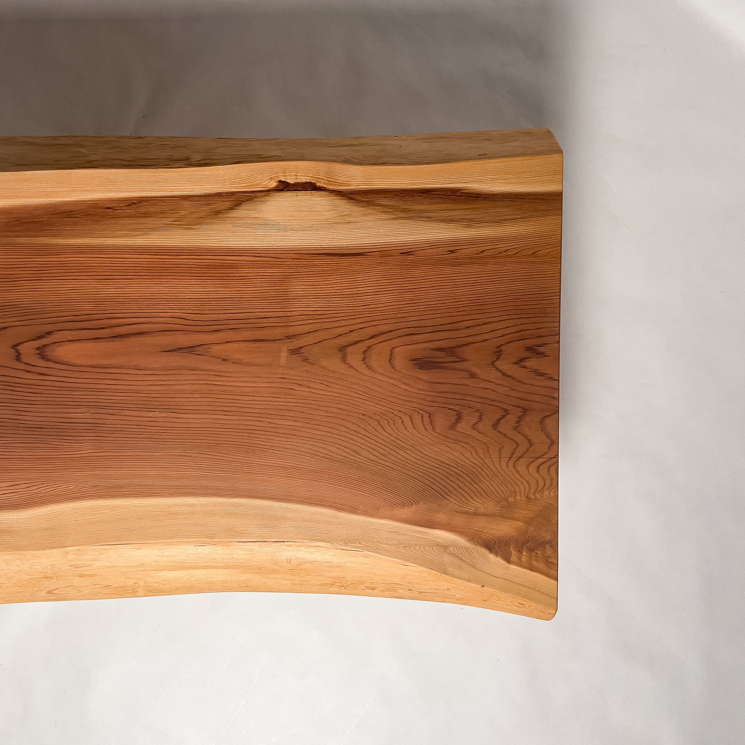 吉野杉が育んだ橙から淡金への穏やかな色味が重なり、川の流れのような杢がやさしく広がります。自然の稜線を丁寧に整えた加工が、木が歩んだ年月の躍動を静かに伝える心地よい一枚板で、空間に温もりを添えます。