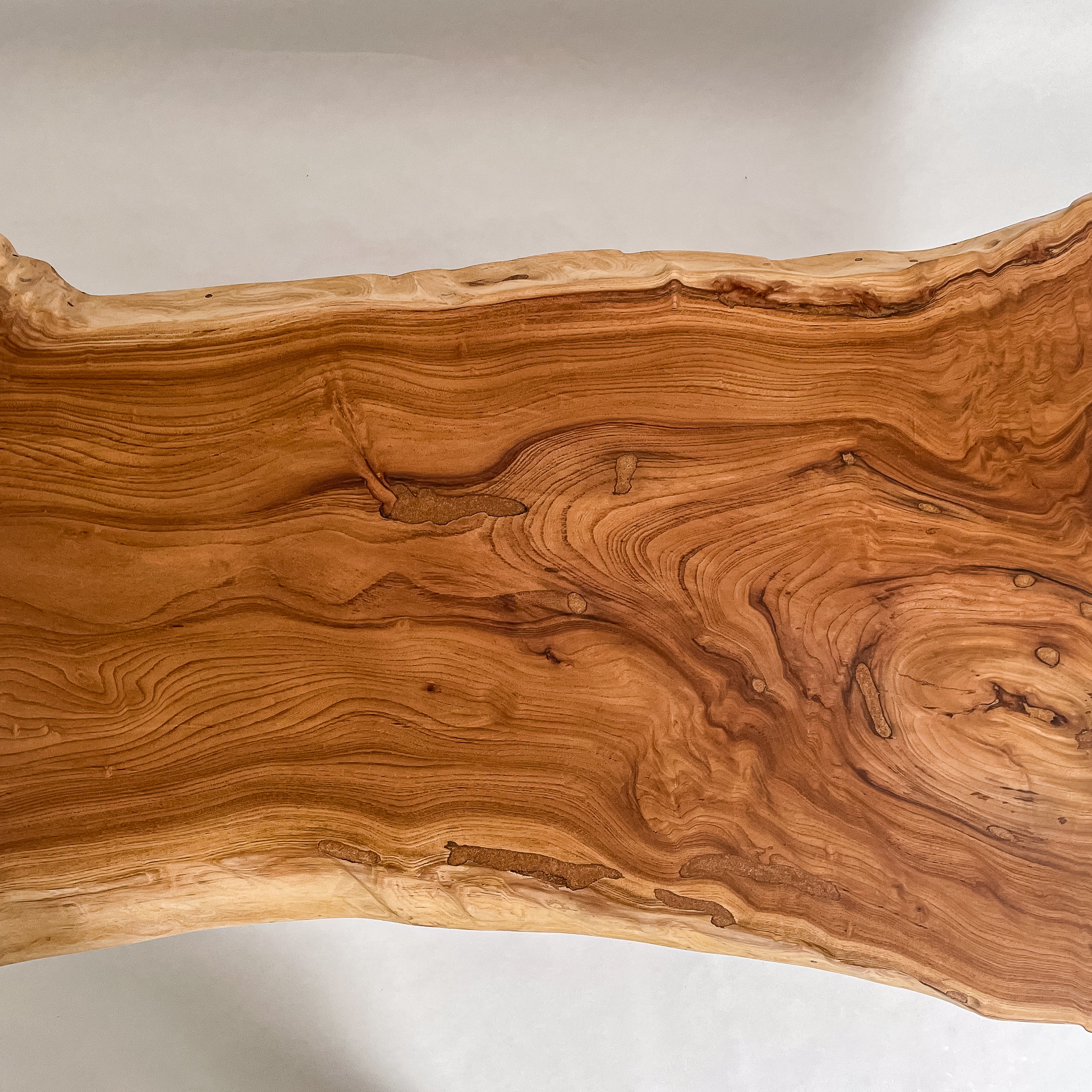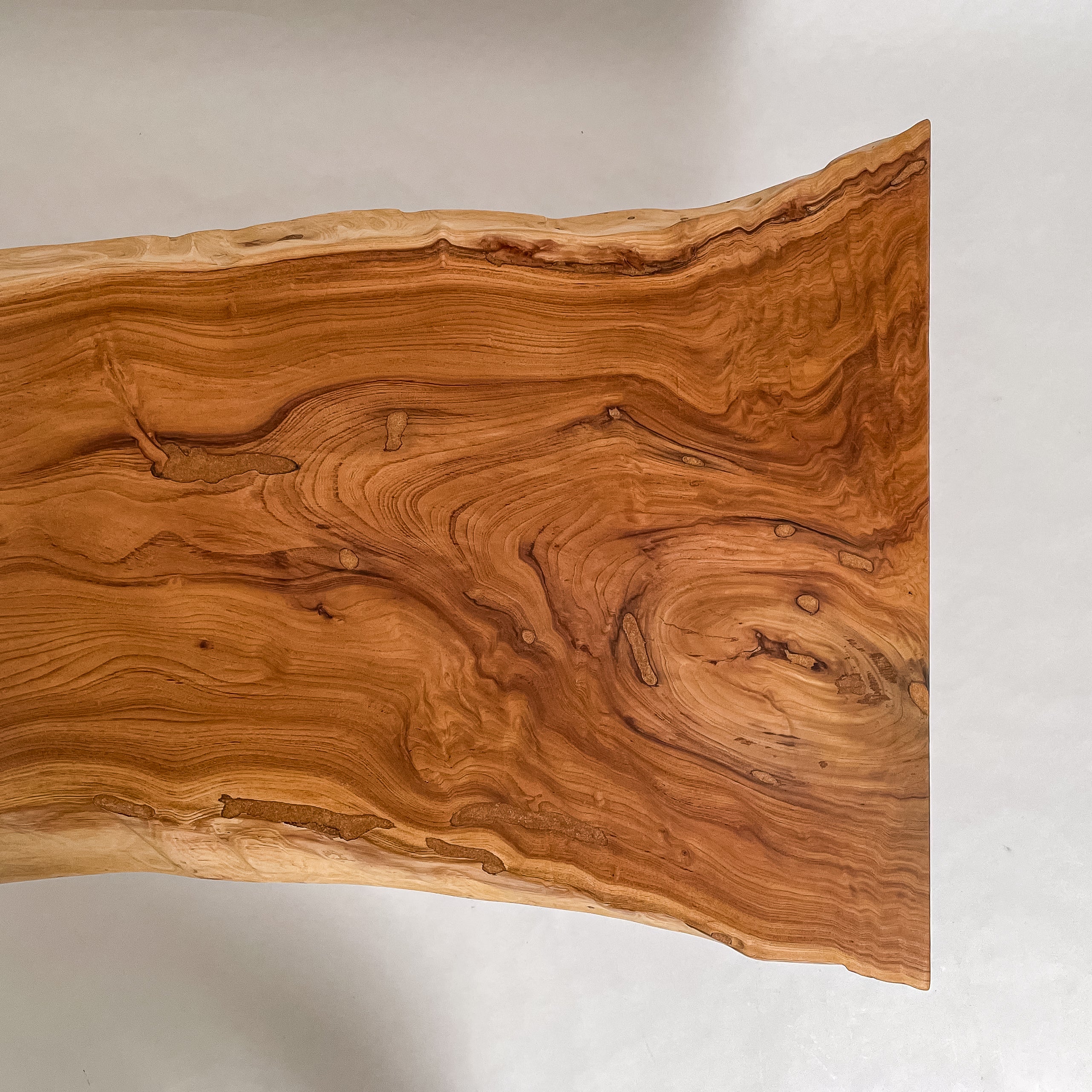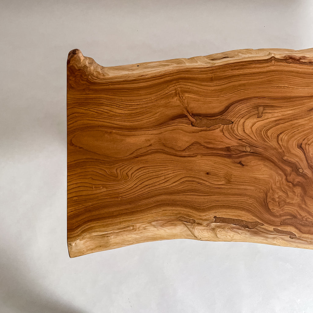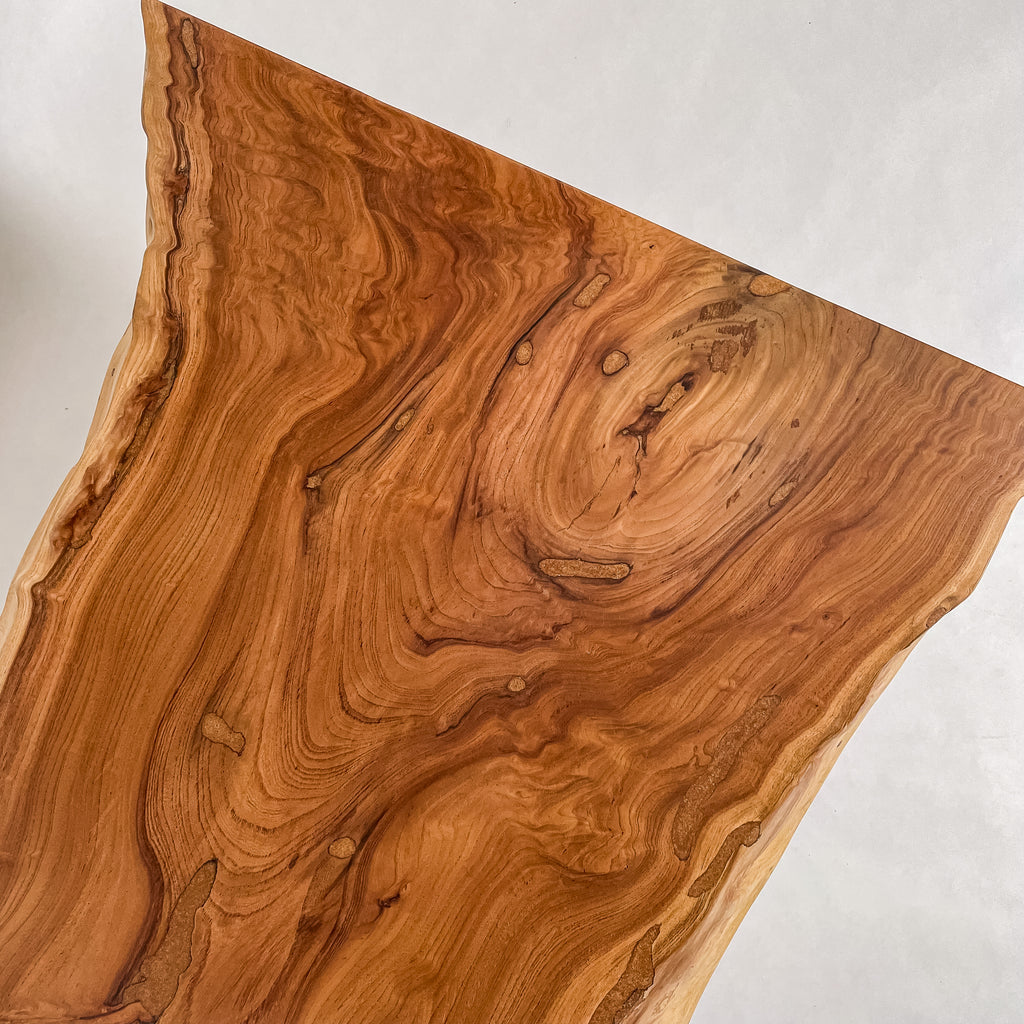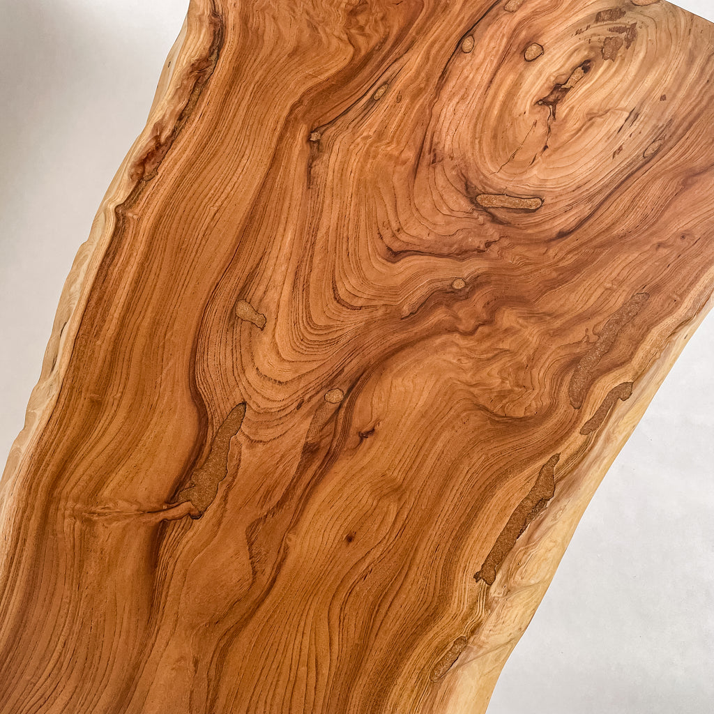 複数の板をつなぎ合わせたものとは異なり、途切れることなく続く杢目は自然の美しさをそのまま映し出します。