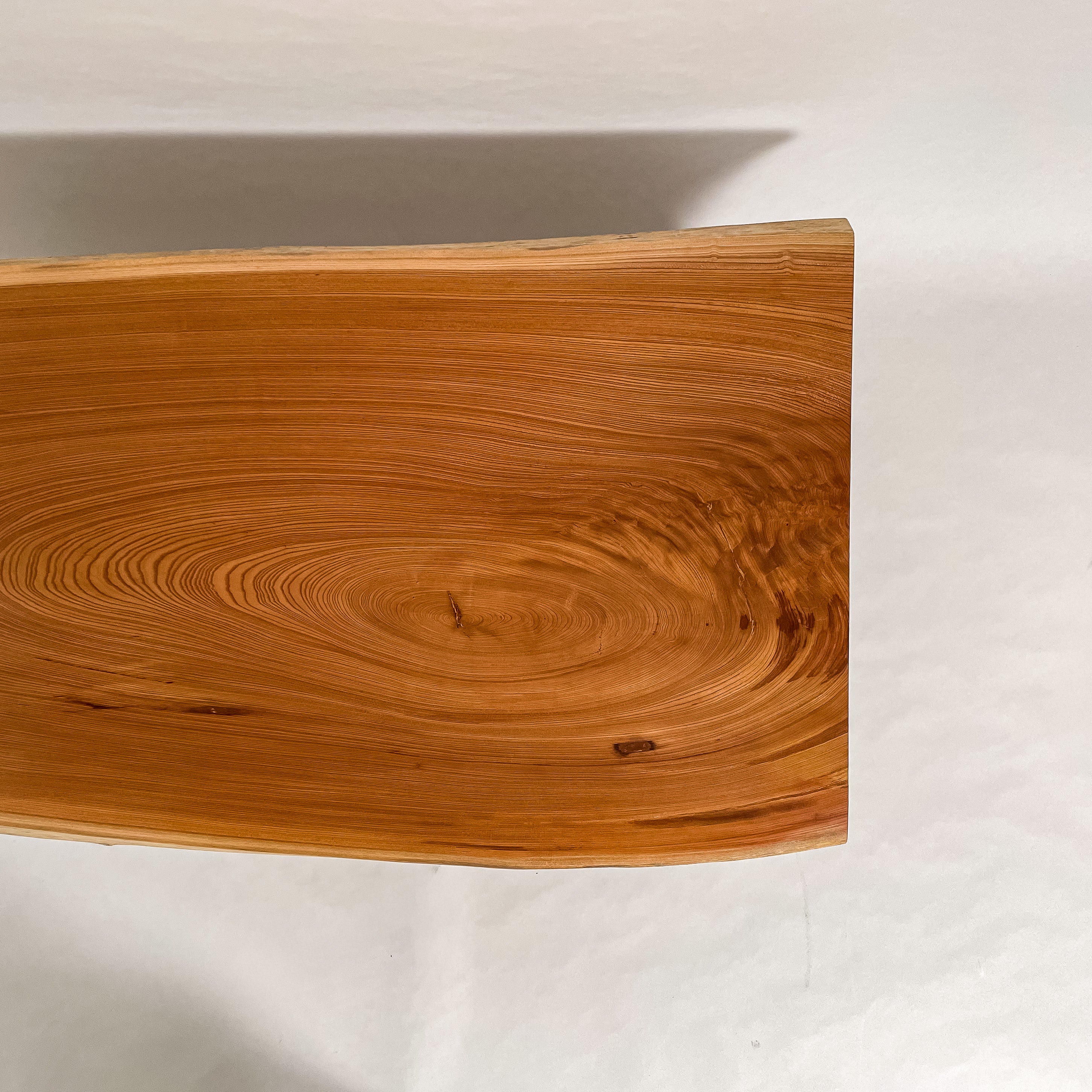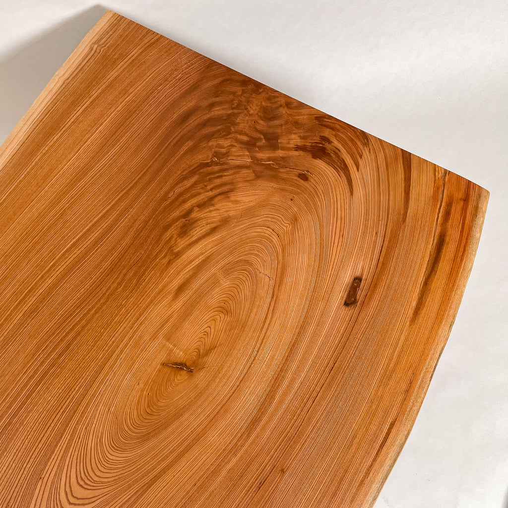 大地に根を張り、幾十年もの時を生きた欅の一枚板です。年輪が描く曲線は、木が育った季節の記憶。自然が刻んだ杢目のゆらぎを職人が繊細に磨き上げ、生命の息づかいを感じるような穏やかな表情に仕上げました。