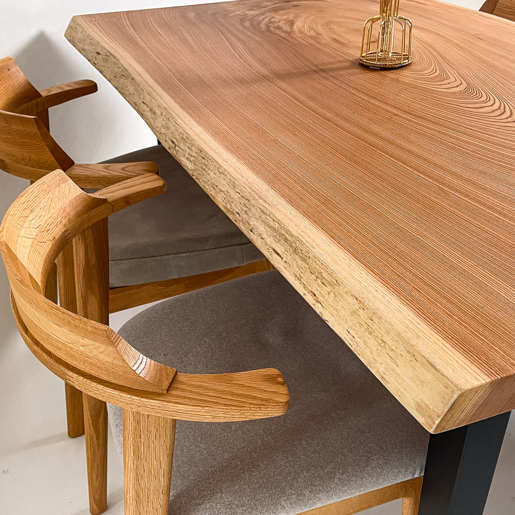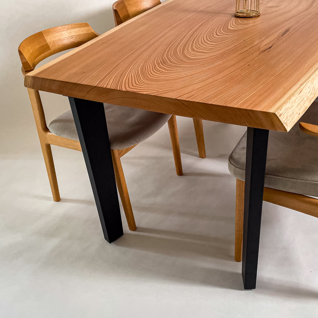 「際立つ」「美しい」という語源を持つほど美しい杢目が魅力。また、国産材最高峰の硬さ・耐久性能を持ち傷がつきにくい特徴を持つ欅は、テーブルに適した上質な素材。