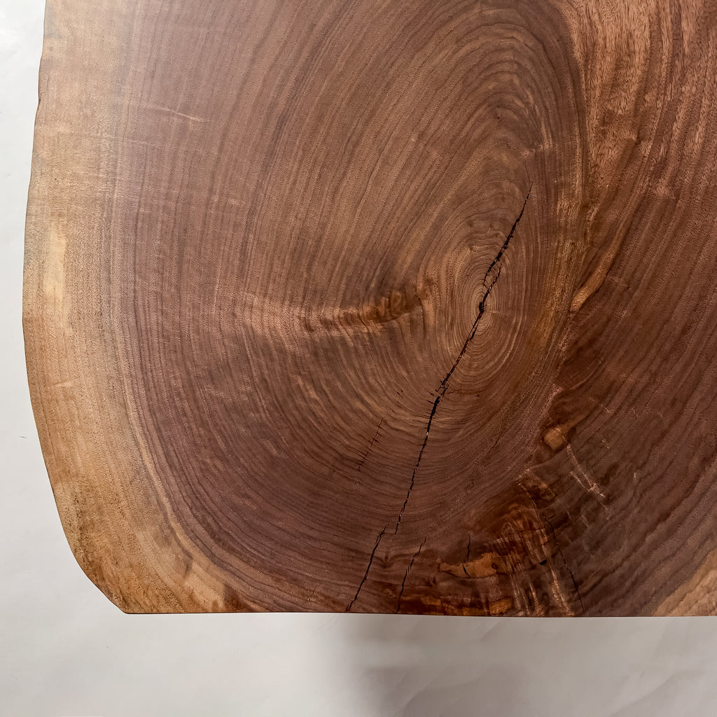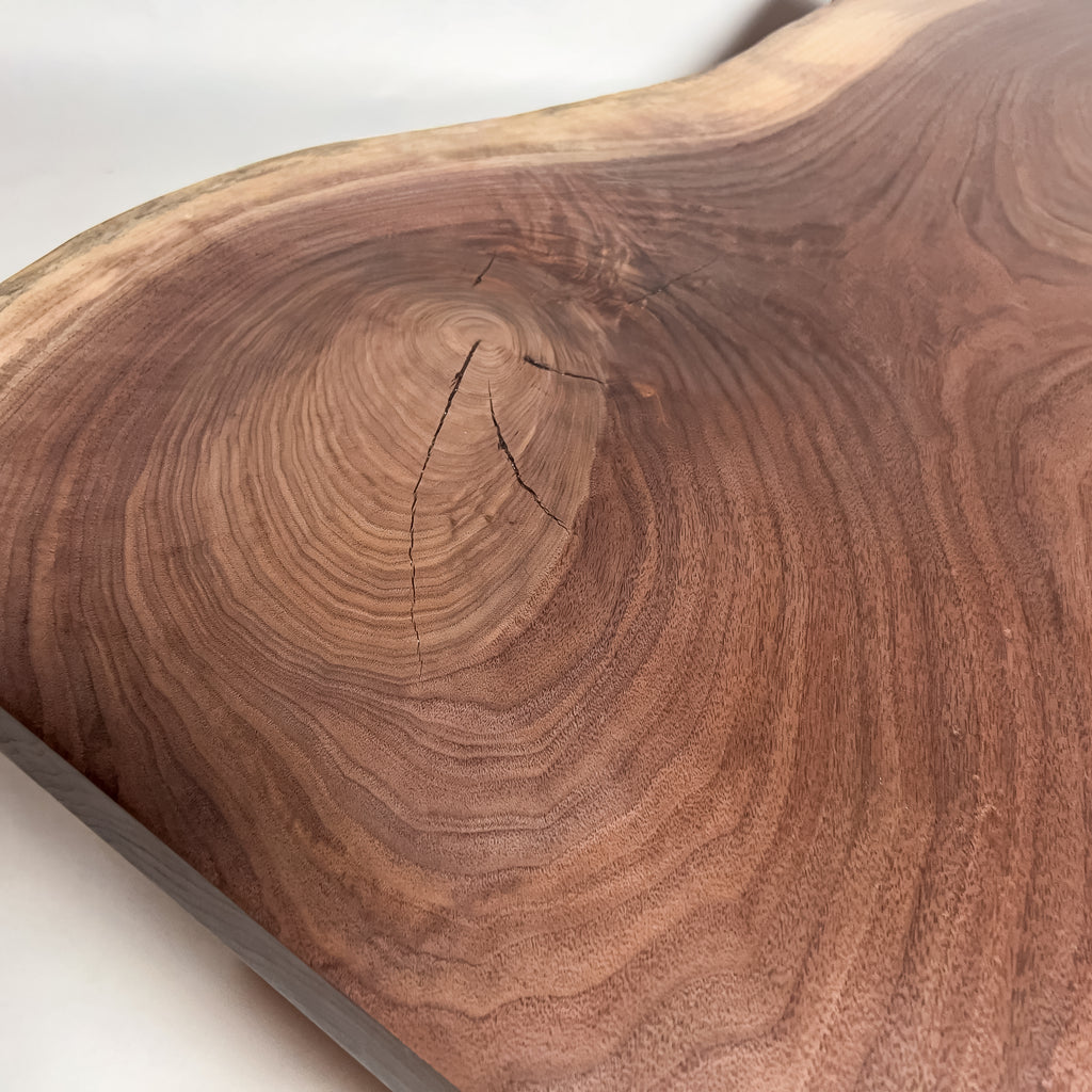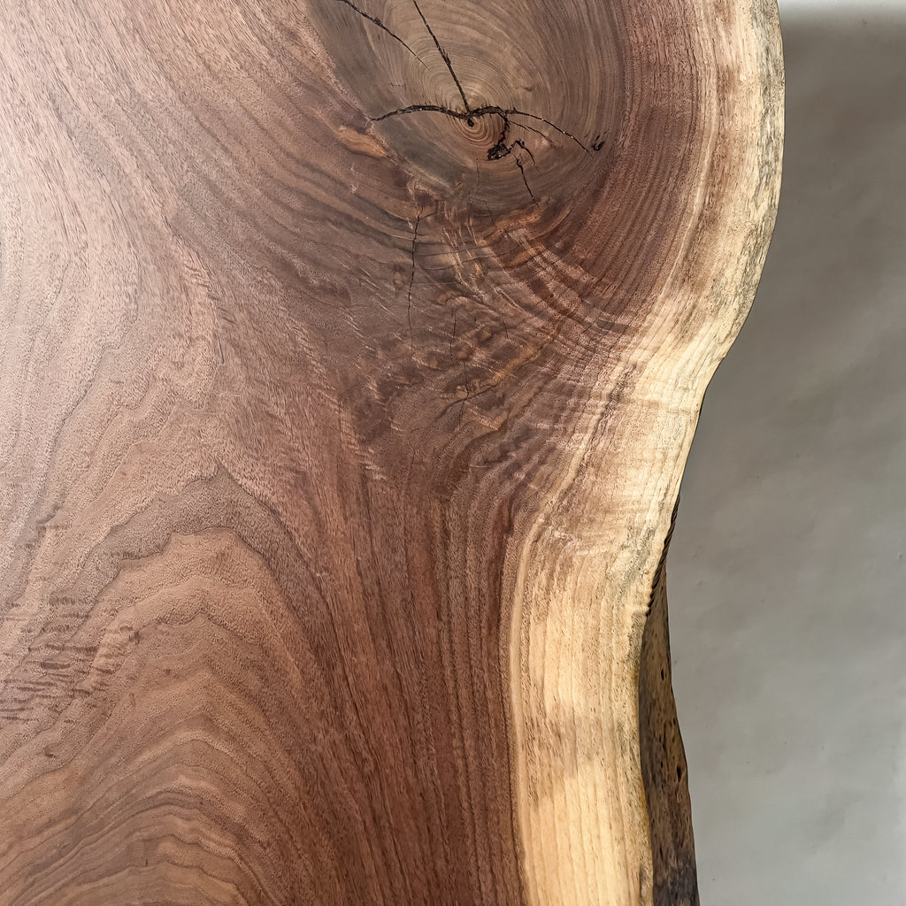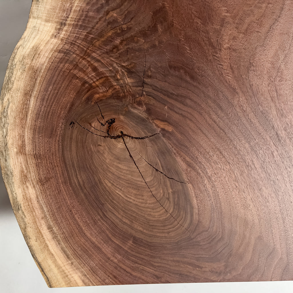 幾重にも重なる年輪が穏やかな波を描くウォールナット。長い歳月を生き抜いた木が、豊かな表情と深みのある色を纏いました。職人が木の鼓動を残すように磨き上げ、自然の力強さと温もりが調和する一枚に仕上げています。