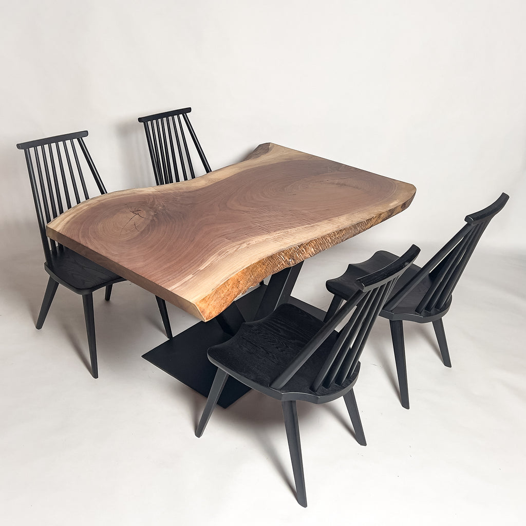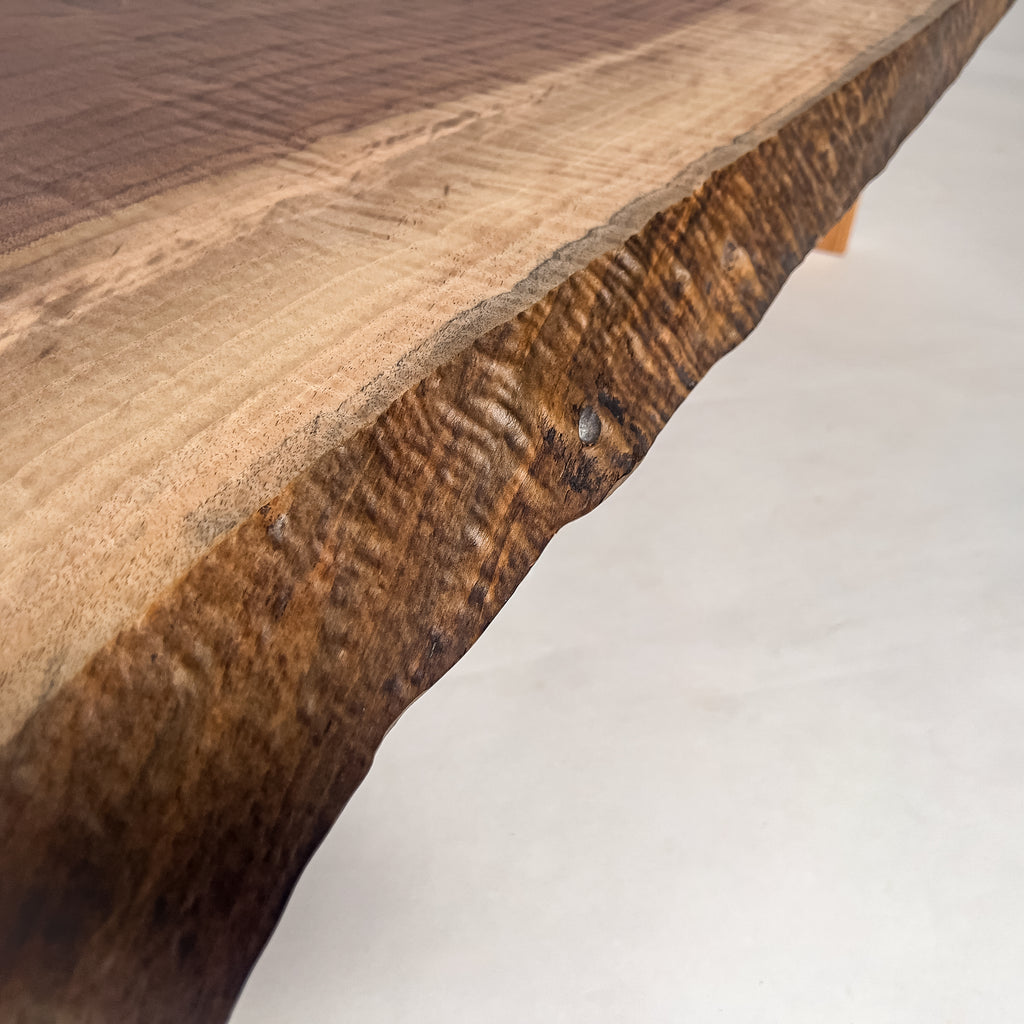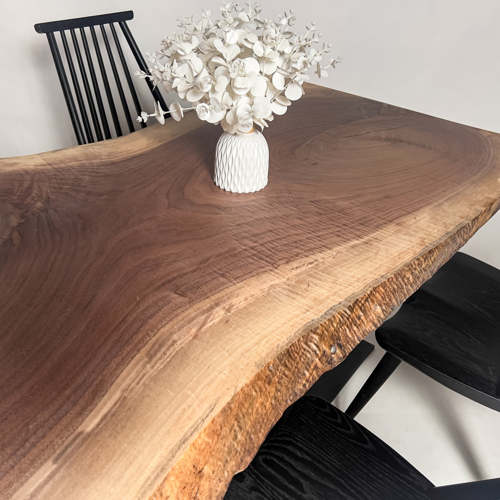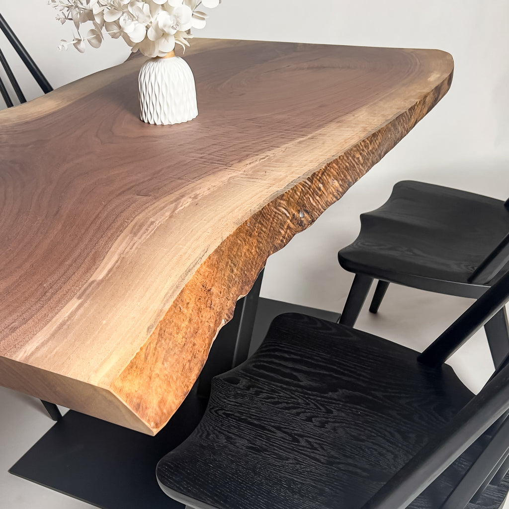 幾重にも重なる年輪が穏やかな波を描くウォールナット。長い歳月を生き抜いた木が、豊かな表情と深みのある色を纏いました。職人が木の鼓動を残すように磨き上げ、自然の力強さと温もりが調和する一枚に仕上げています。
