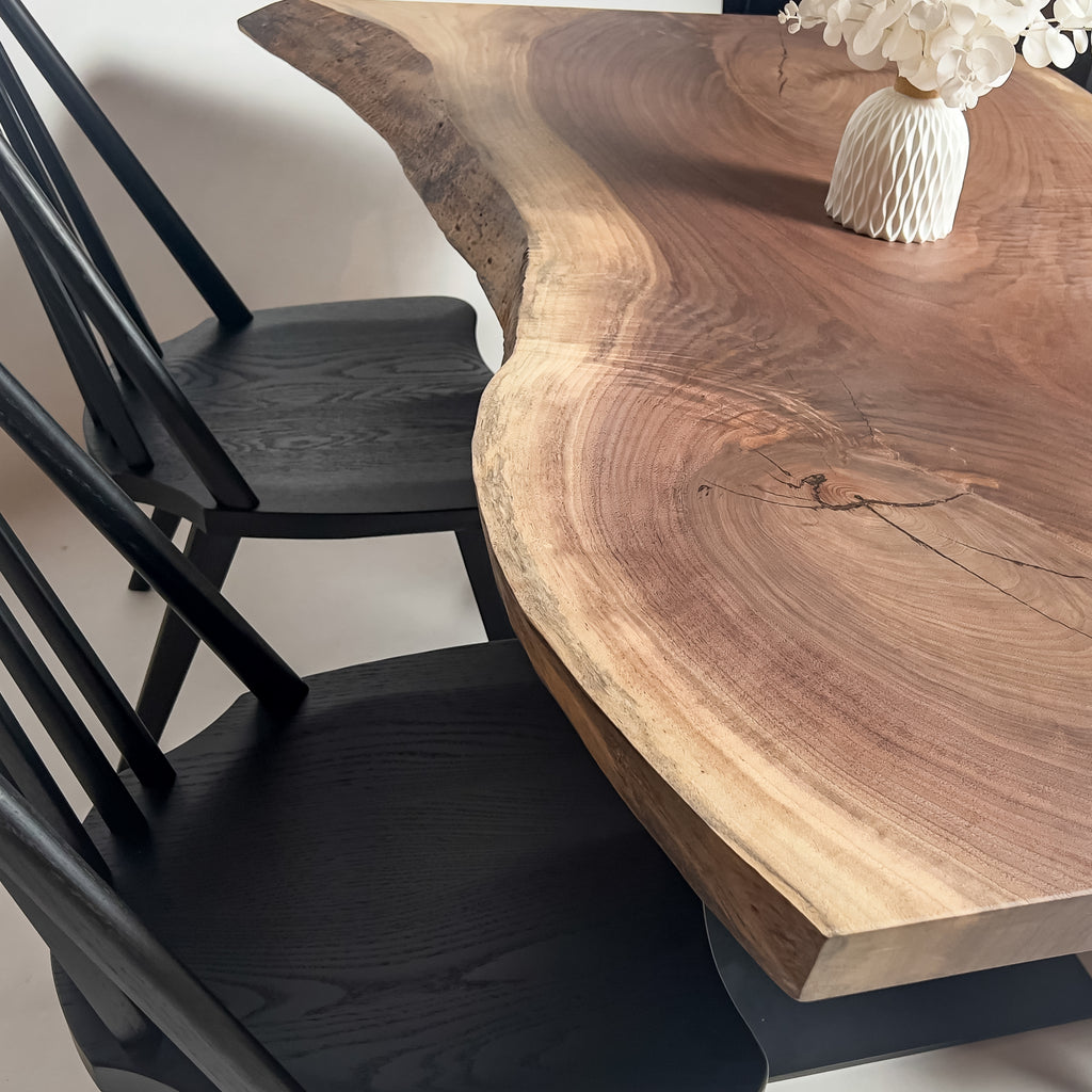 複数の板をつなぎ合わせたものとは異なり、途切れることなく続く杢目は自然の美しさをそのまま映し出します。