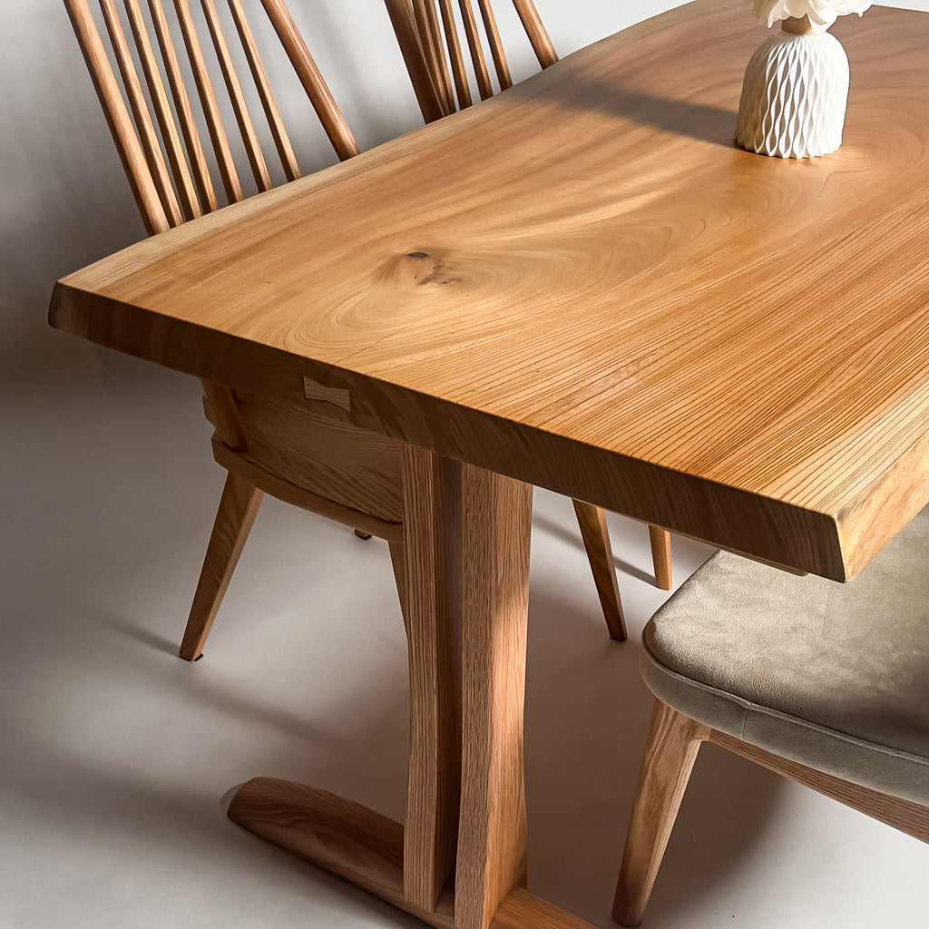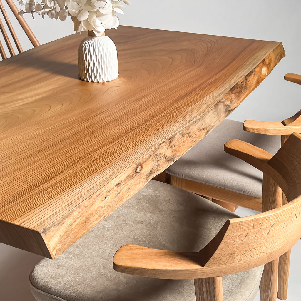一枚板がもつ力強さとしなやかさを見極め、荒々しさと繊細さを併せ持つ加工を施すことで、その躍動感を余すことなく引き出す。 肌触り、見た目、素材感。そのすべてにおいて高い調和を図り、熟練の技術と豊富な経験をもとに、一枚板の魅力を緻密に引き出す。