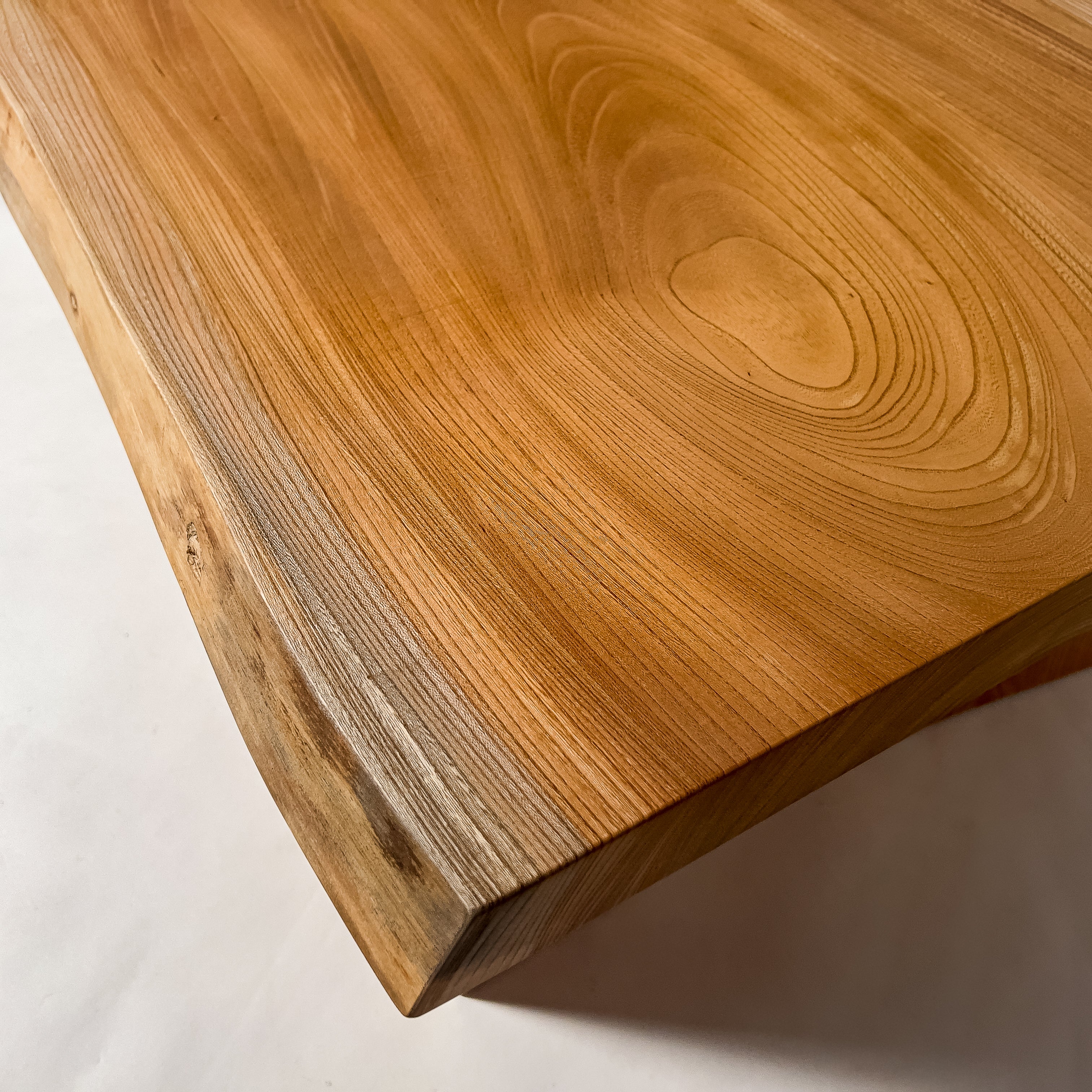 仕上がりの質感や印象にまで細やかに気を配り、使われる空間や暮らしを見据えた、やわらかな佇まいへと丁寧に仕上げる。 木が持つ節や皮、杢目の表情に寄り添い、その一つひとつを活かすことで、唯一無二の素材美を際立たせた一枚板づくりを行う。