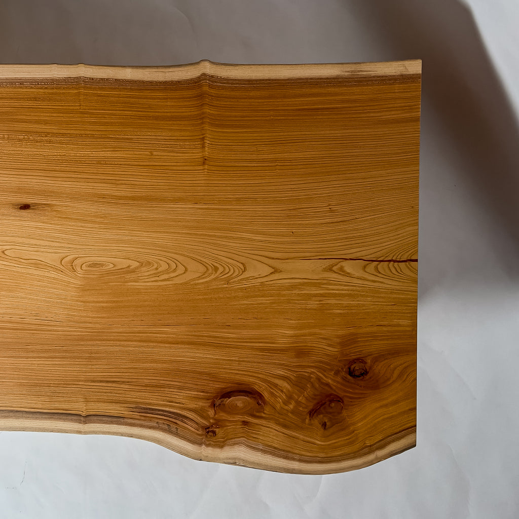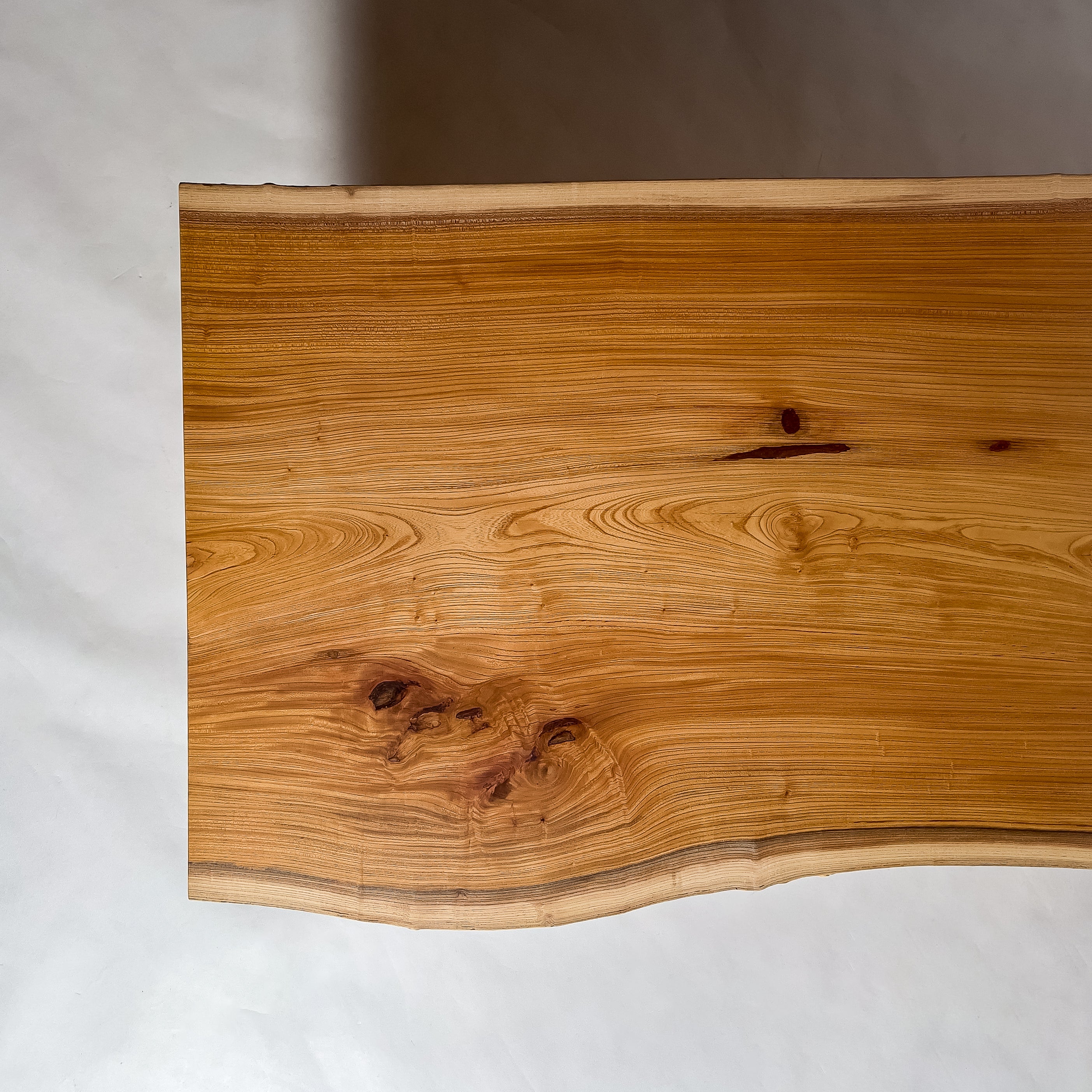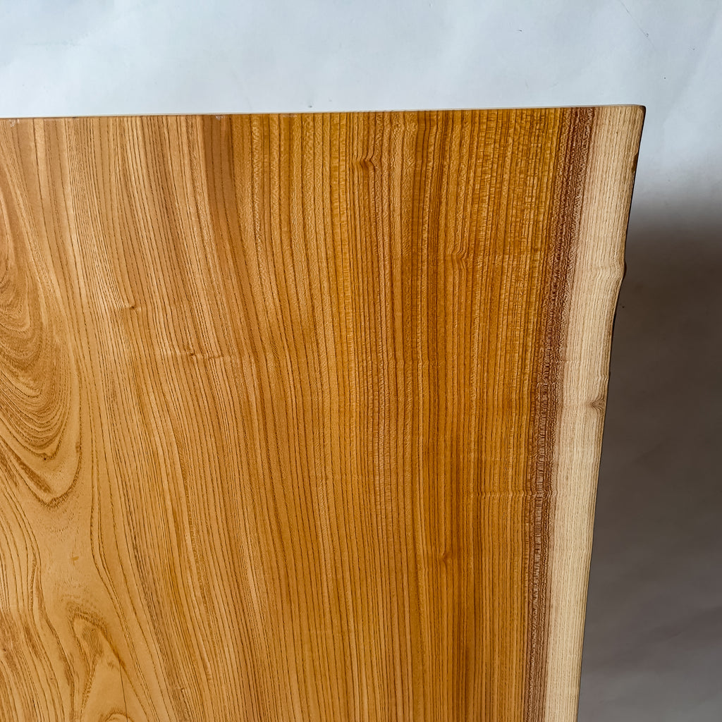山地で長い時間をかけて育った欅が、年輪を重ねながら幹の張りや枝分かれを内包し、その揺らぎが天板の縁に残っています。板目に現れた流れる杢と節周辺のうねりが、光の角度で濃淡を変え、自然のままの色味を保つ仕上げによって、躍動を抑えすぎず上品に整えられています。