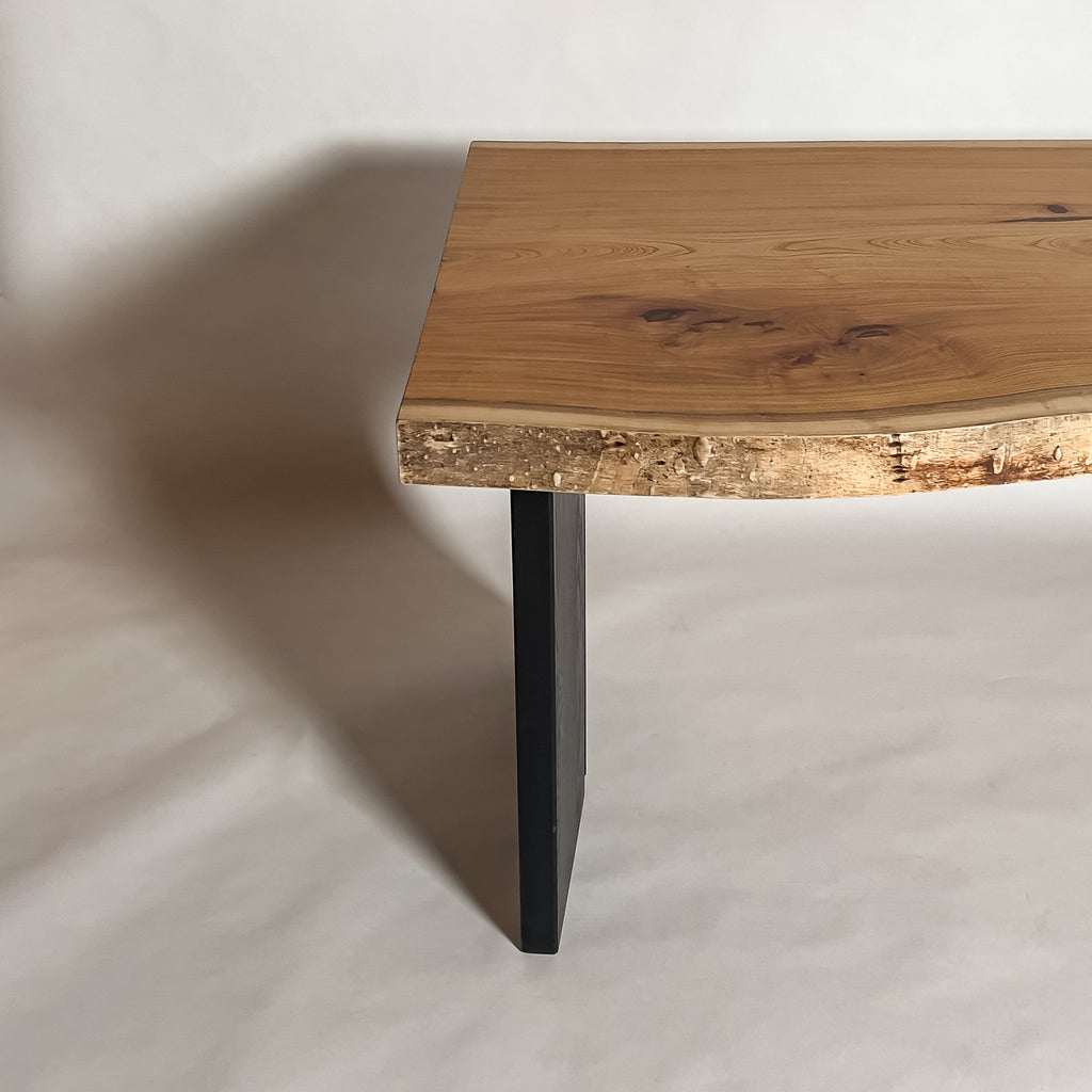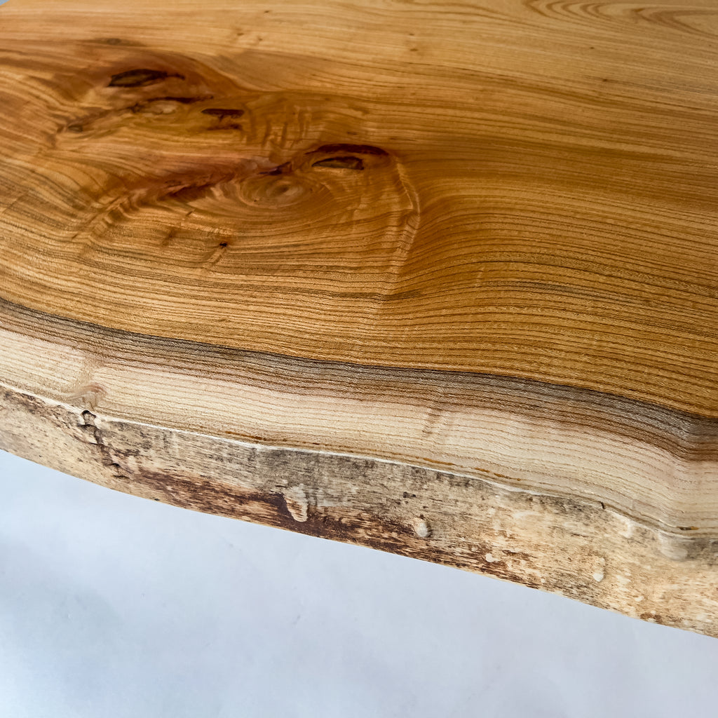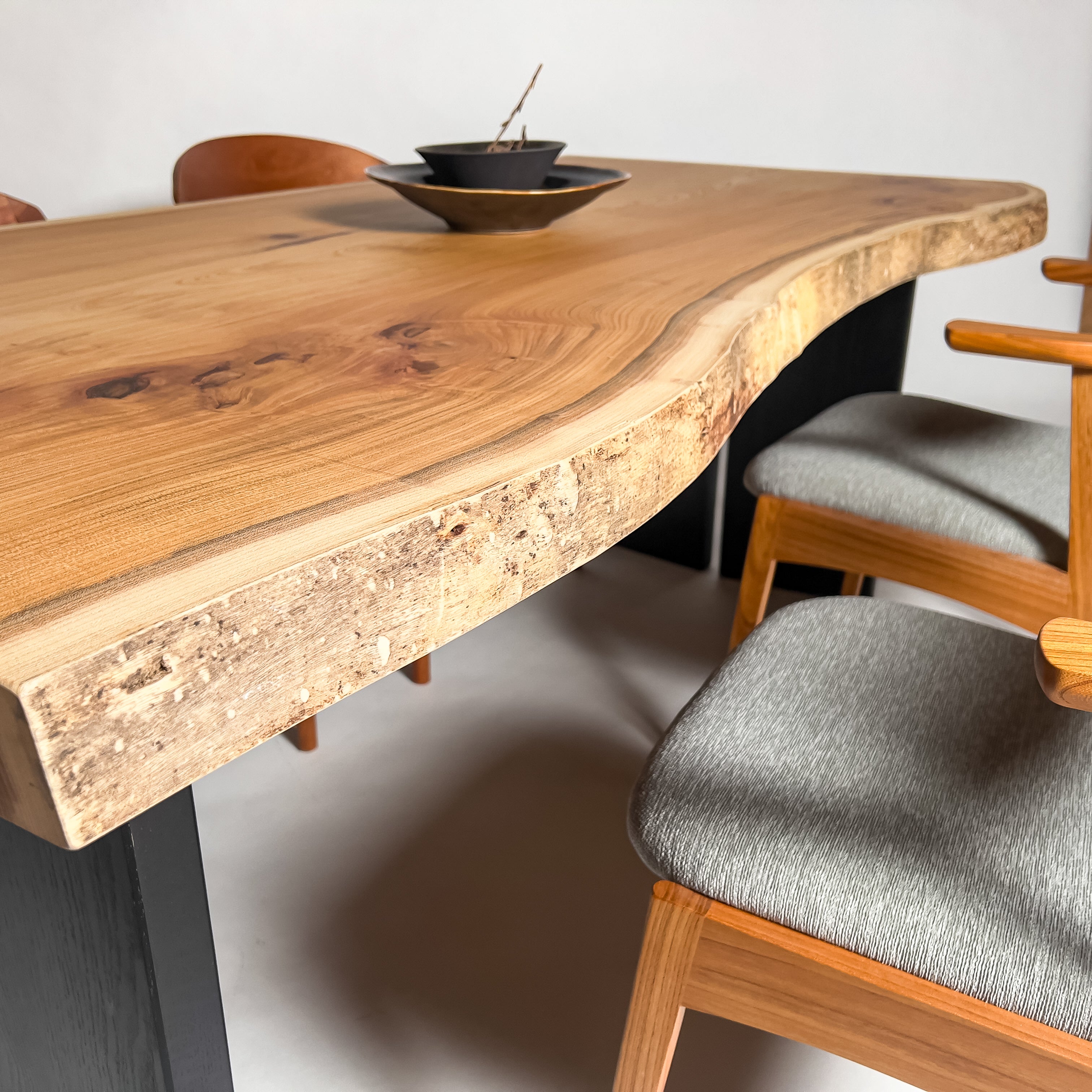 山地で長い時間をかけて育った欅が、年輪を重ねながら幹の張りや枝分かれを内包し、その揺らぎが天板の縁に残っています。板目に現れた流れる杢と節周辺のうねりが、光の角度で濃淡を変え、自然のままの色味を保つ仕上げによって、躍動を抑えすぎず上品に整えられています。