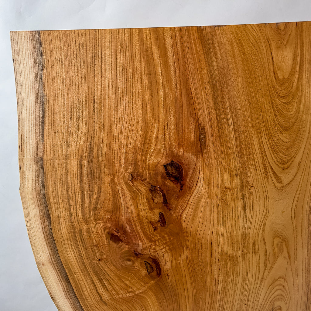 この一枚板の希少性 長手に連続する板目と片側で大きく弧を描く耳が一体となり、節周辺のうねりが面に動きを与えています。同条件で幅広の面とこの揺らぎを両立させると木目の分断や耳の荒れが生じやすいため希少性が高い。 |