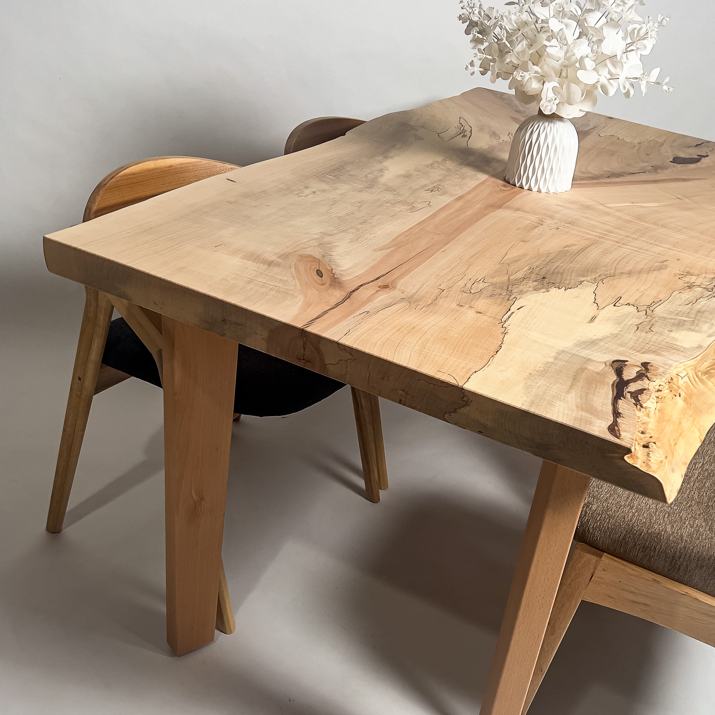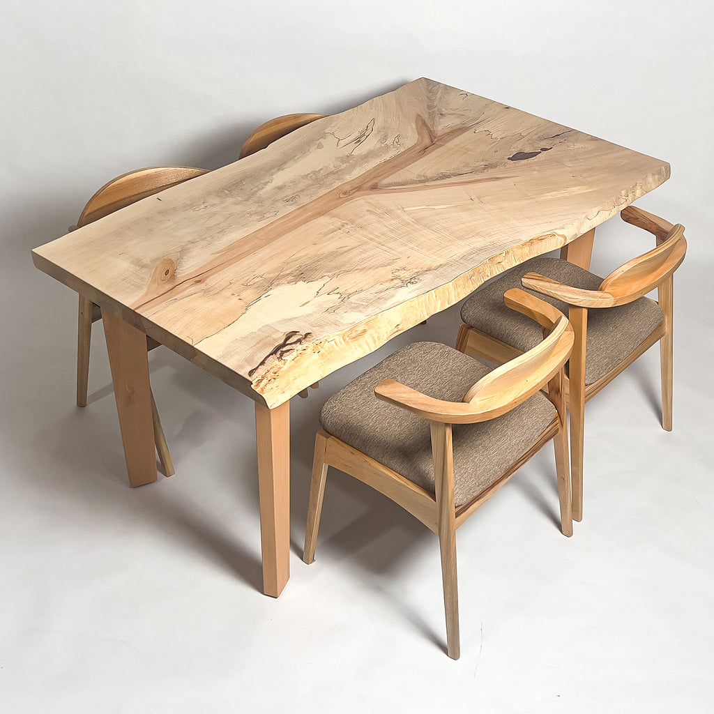 山の冷涼な土で育った栃は、雪解け水と歳月に磨かれ、縮杢や波杢が静かに現れます。淡い光を含む色味が空間を澄ませ、躍動を残す仕上げが暮らしに穏やかな流れを生む、森の記憶。時を重ねるほど深まる存在感。