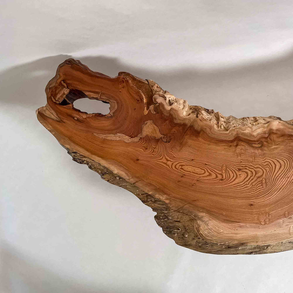 | 仕上がりの質感や印象にまで細やかに気を配り、使われる空間や暮らしを見据えた、やわらかな佇まいへと丁寧に仕上げる。 | 木が持つ節や皮、杢目の表情に寄り添い、その一つひとつを活かすことで、唯一無二の素材美を際立たせた一枚板づくりを行う。 | |