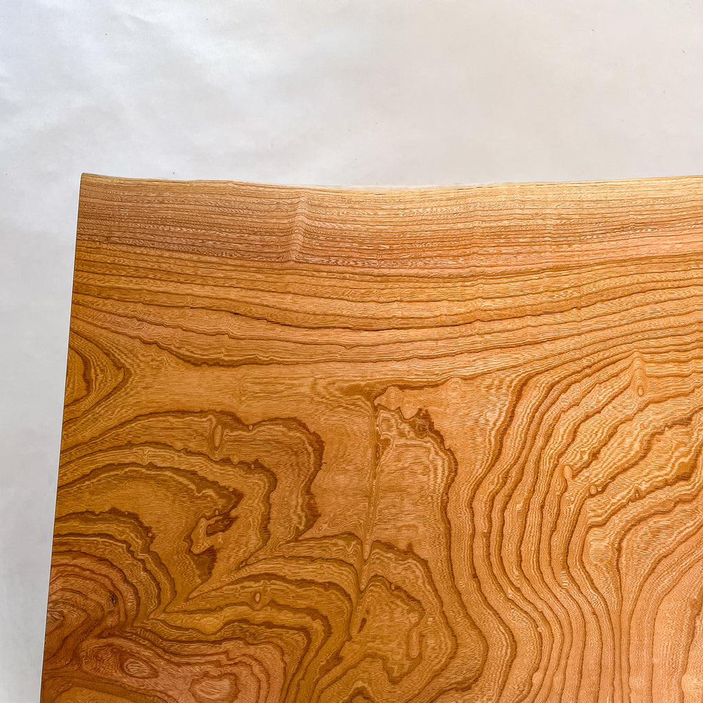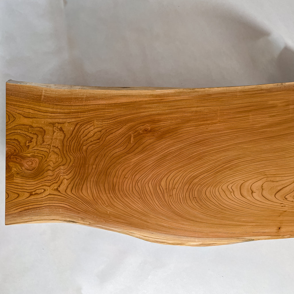 長い年月を重ねた欅の年輪が波のように広がり、玉杢を思わせる美しい表情を描きます。自然の造形を活かし、職人が繊細に仕上げた温もりある一枚板。黄金色の木肌が上質な空間を演出し、暮らしに豊かな彩りを添えます。