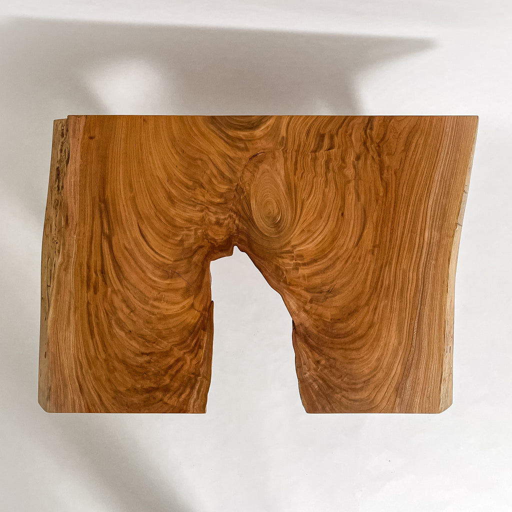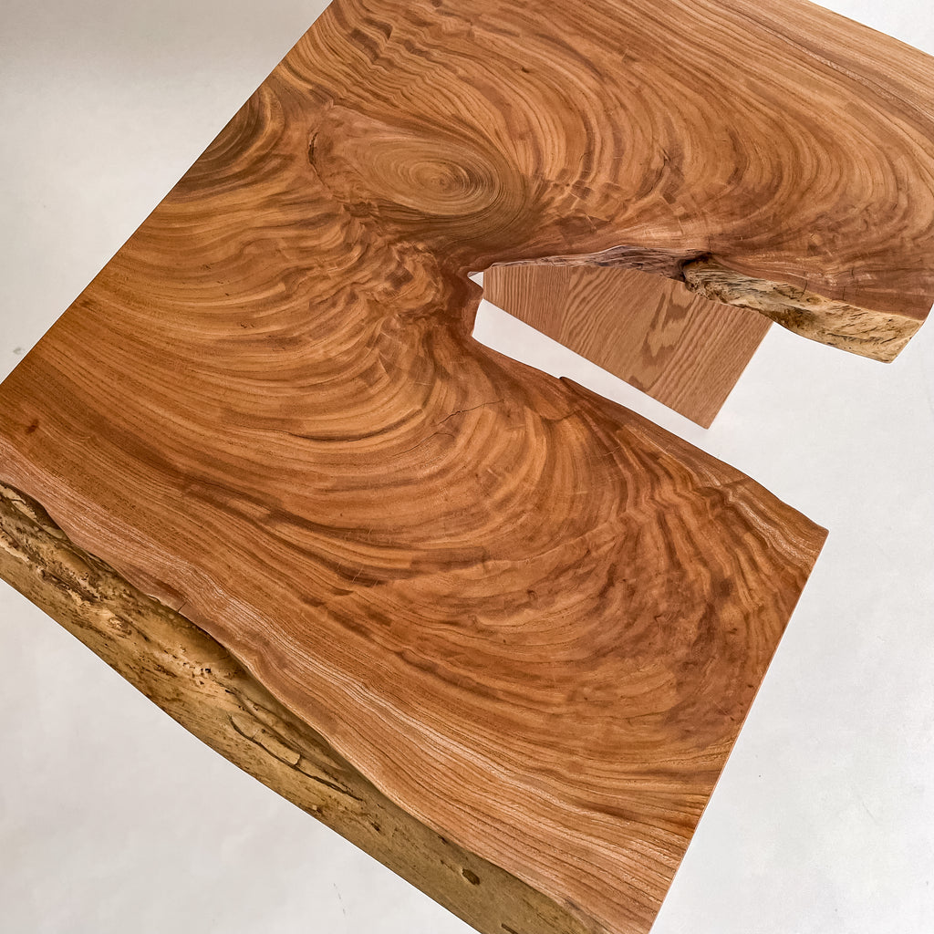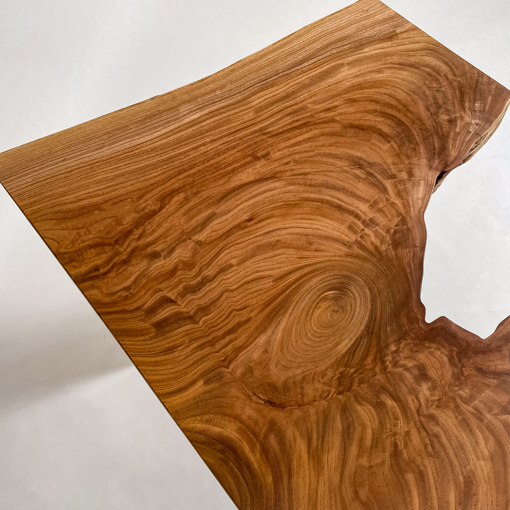 欅特有の光沢が生み出す、艶やかな飴色のグラデーション。中心に向かって渦を巻く杢目は、太い幹が四季の風に耐えながら育った証です。木が枝分かれする部分に現れる「瘤杢」が、唯一無二の表情を描き出しています。自然のかたちをそのままに活かした仕上げが、温もりと力強さを宿しています。