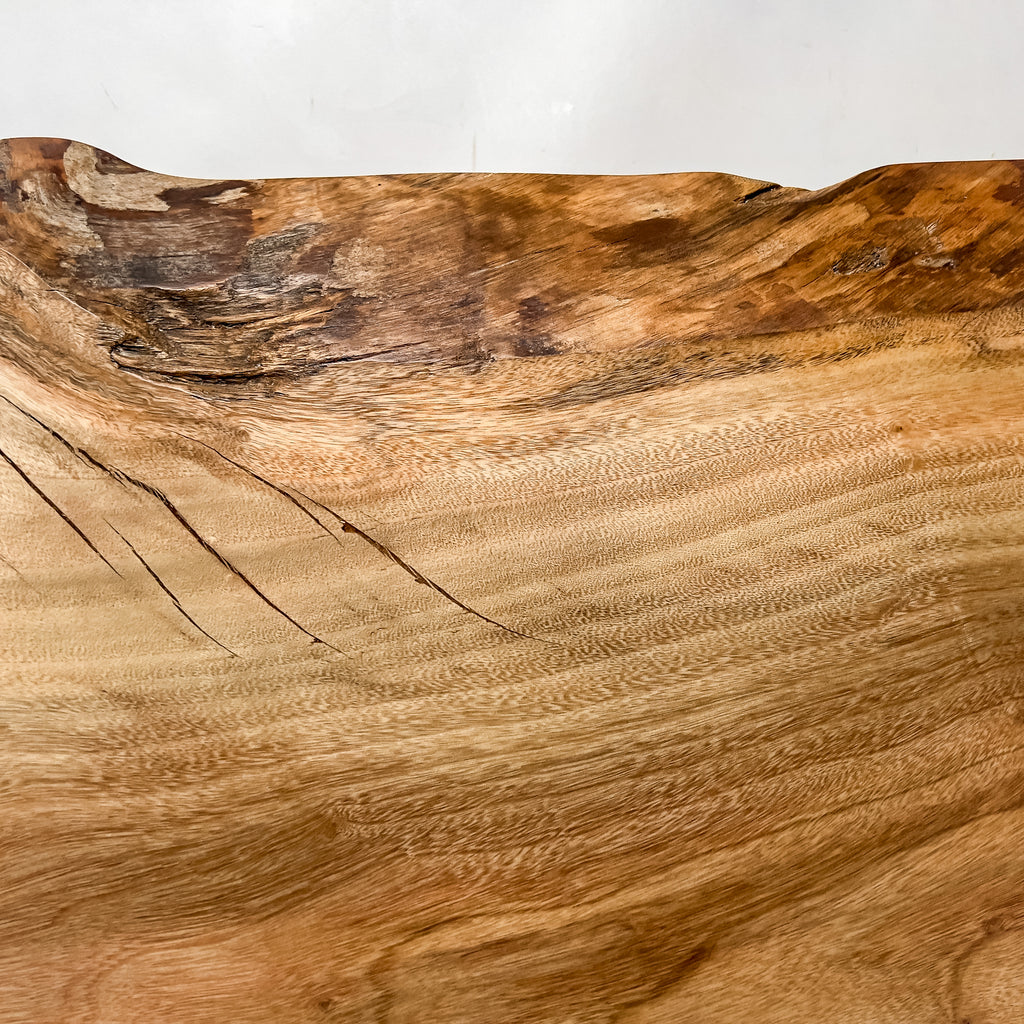 楠が南の森でゆっくりと育ち、風に包まれながら描いた柔らかな曲線。光を受けるたび表情を変える杢目は、まるで水面のような揺らぎを見せます。年輪の奥に宿る香りと温もりをそのままに、職人が自然の流れを断ち切らずに仕上げた一枚。空間に穏やかな動きを添えます。