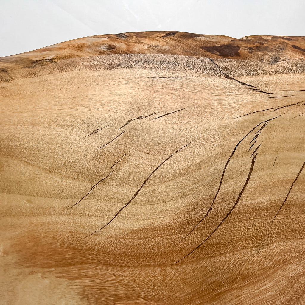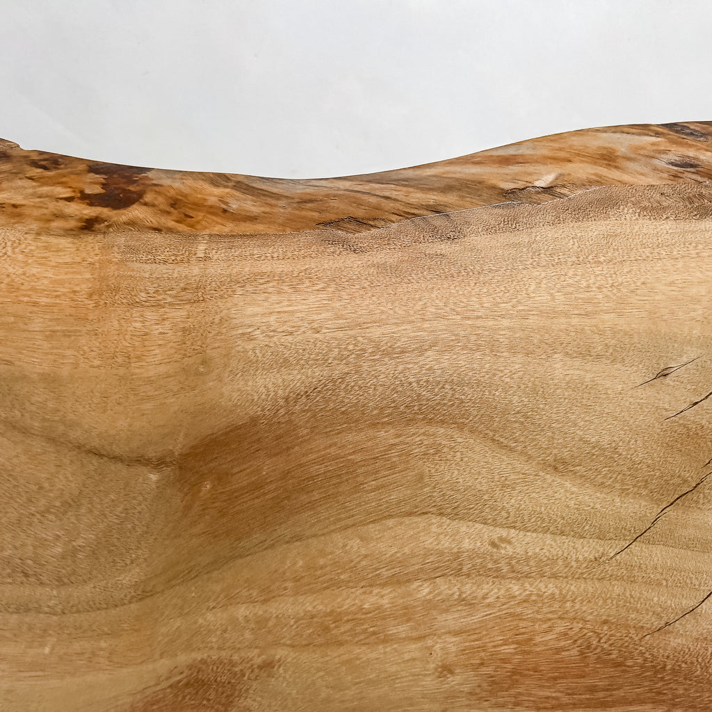 楠が南の森でゆっくりと育ち、風に包まれながら描いた柔らかな曲線。光を受けるたび表情を変える杢目は、まるで水面のような揺らぎを見せます。年輪の奥に宿る香りと温もりをそのままに、職人が自然の流れを断ち切らずに仕上げた一枚。空間に穏やかな動きを添えます。