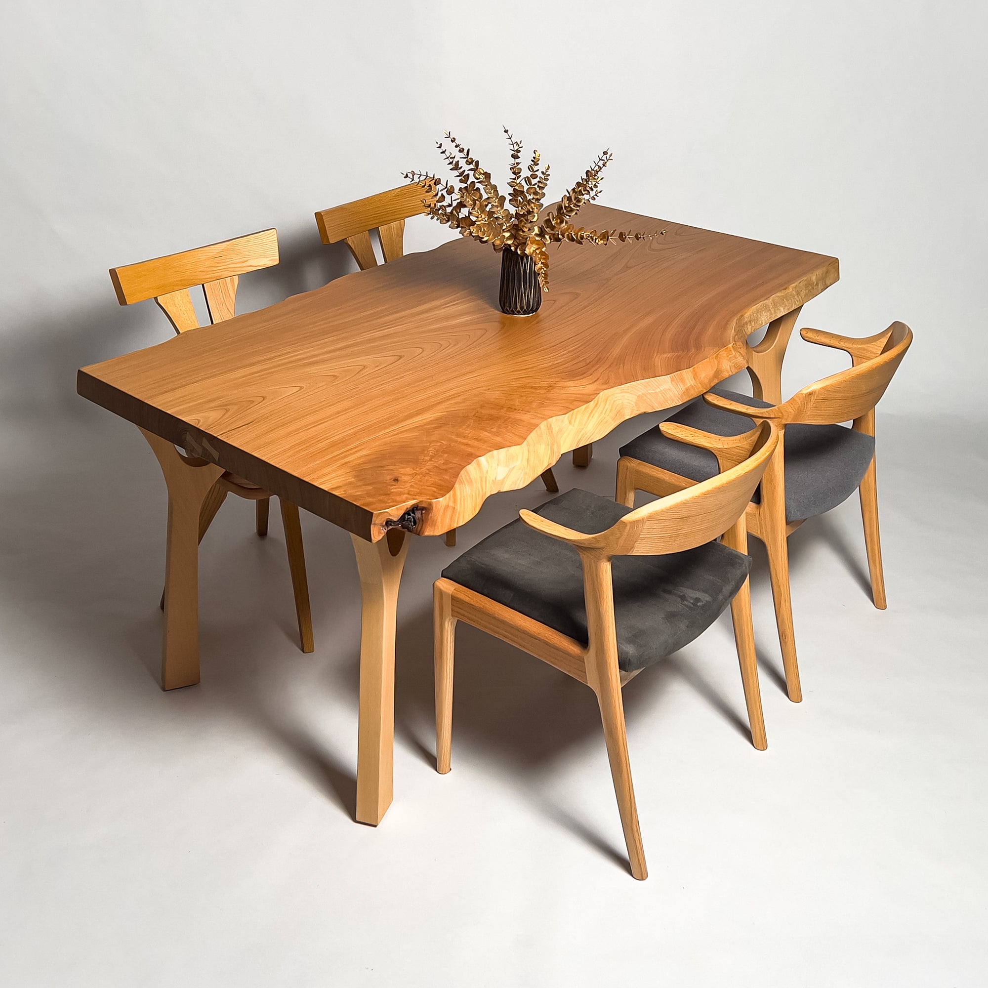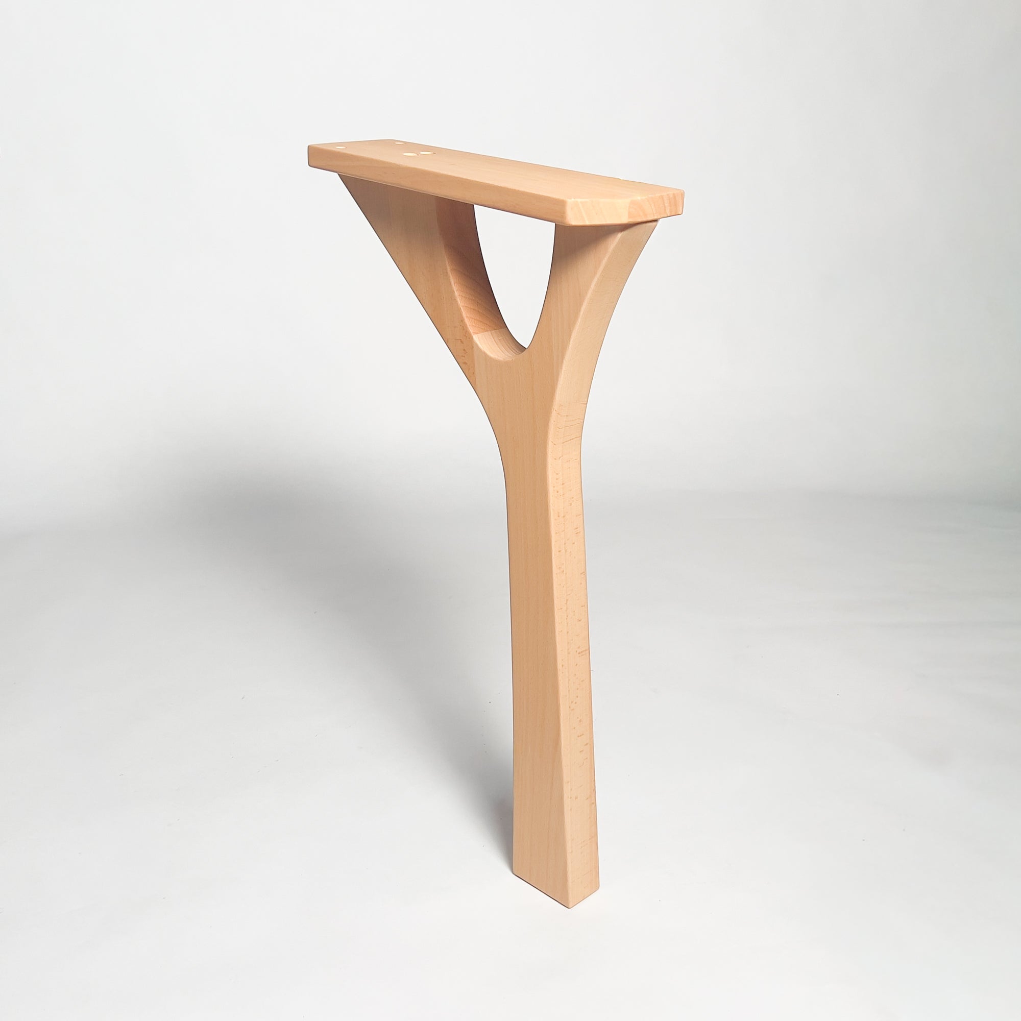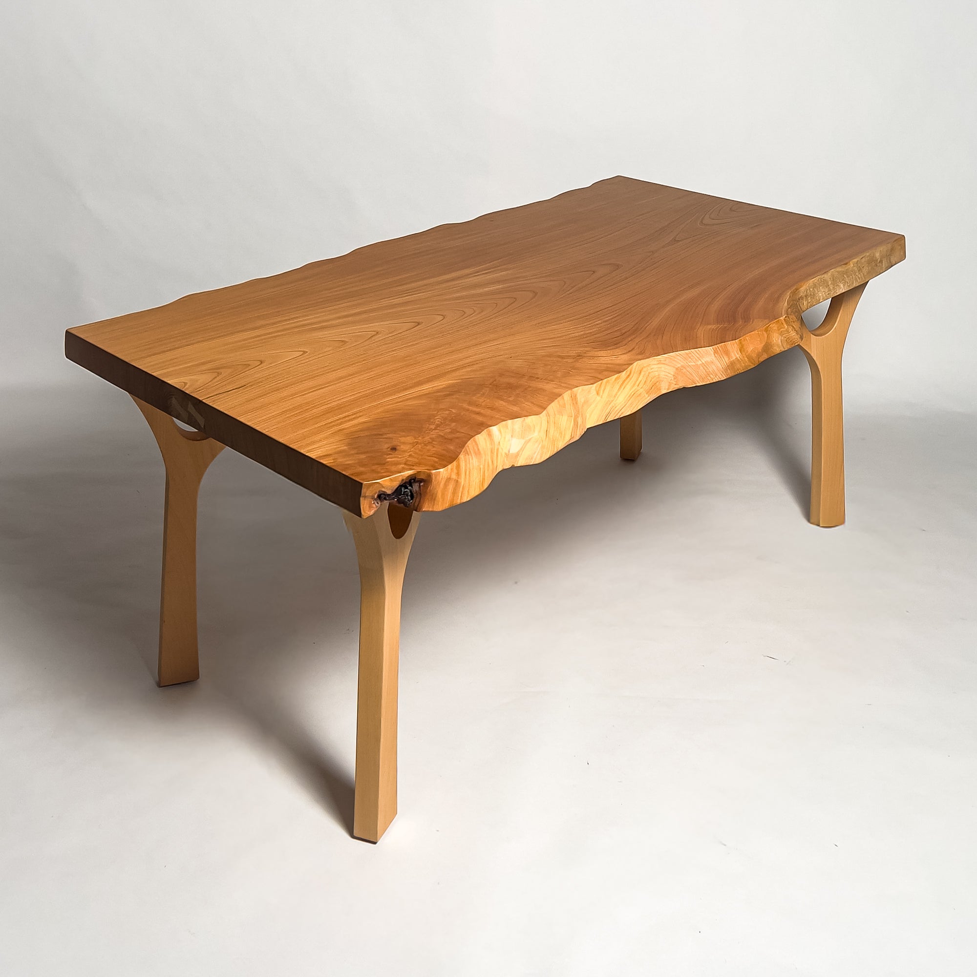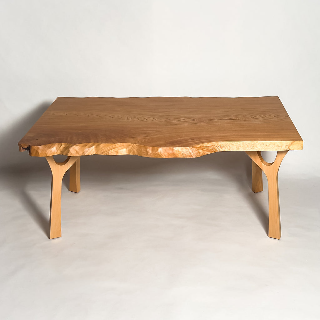 Y字脚は、力強さと軽やかさをあわせ持つデザイン。一本の線が空へと伸びるような造形が、一枚板の迫力をしっかりと支えながら、全体に軽やかな抜け感を生み出します。