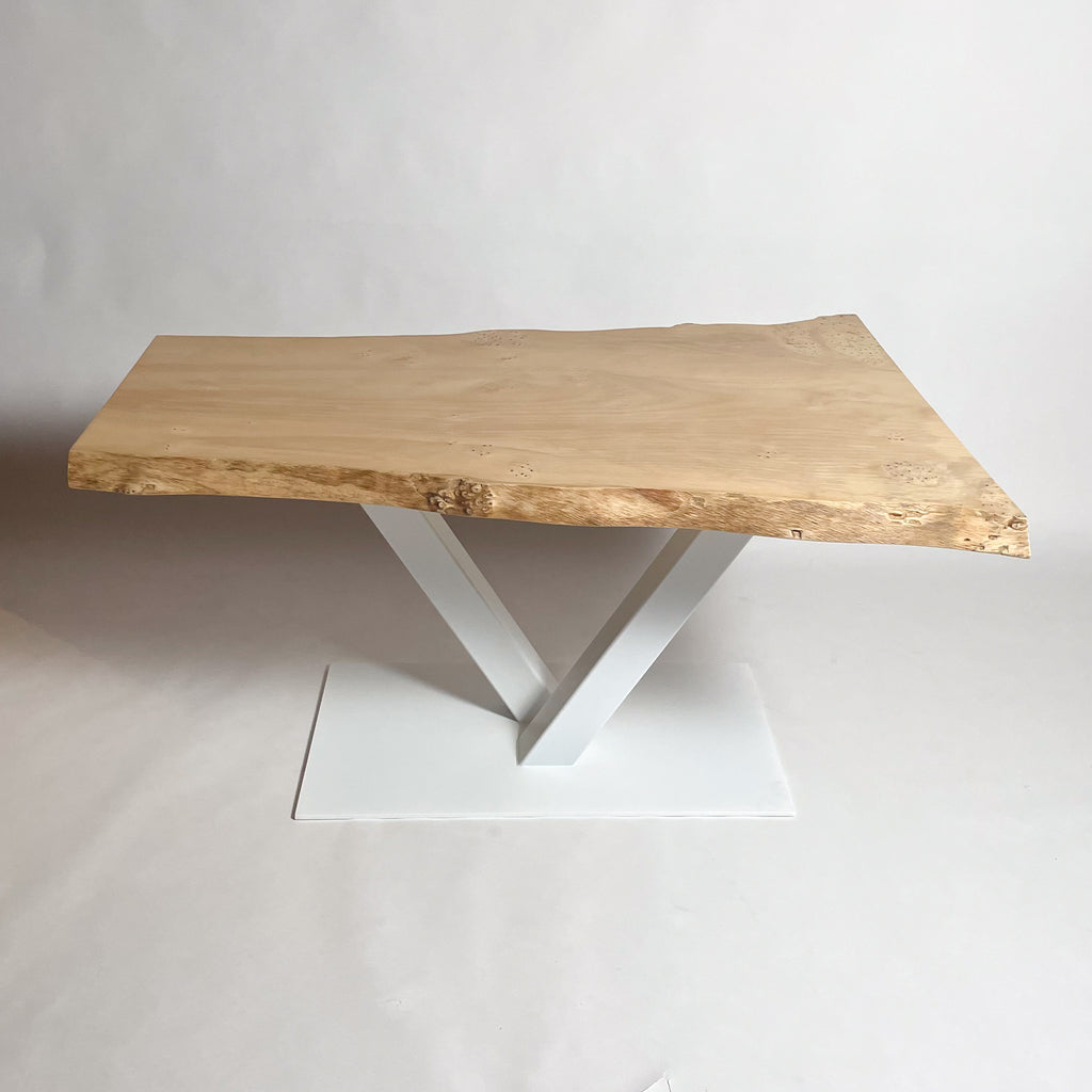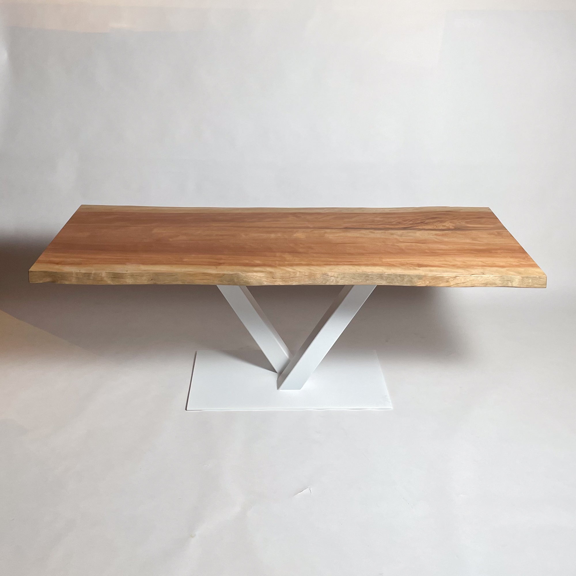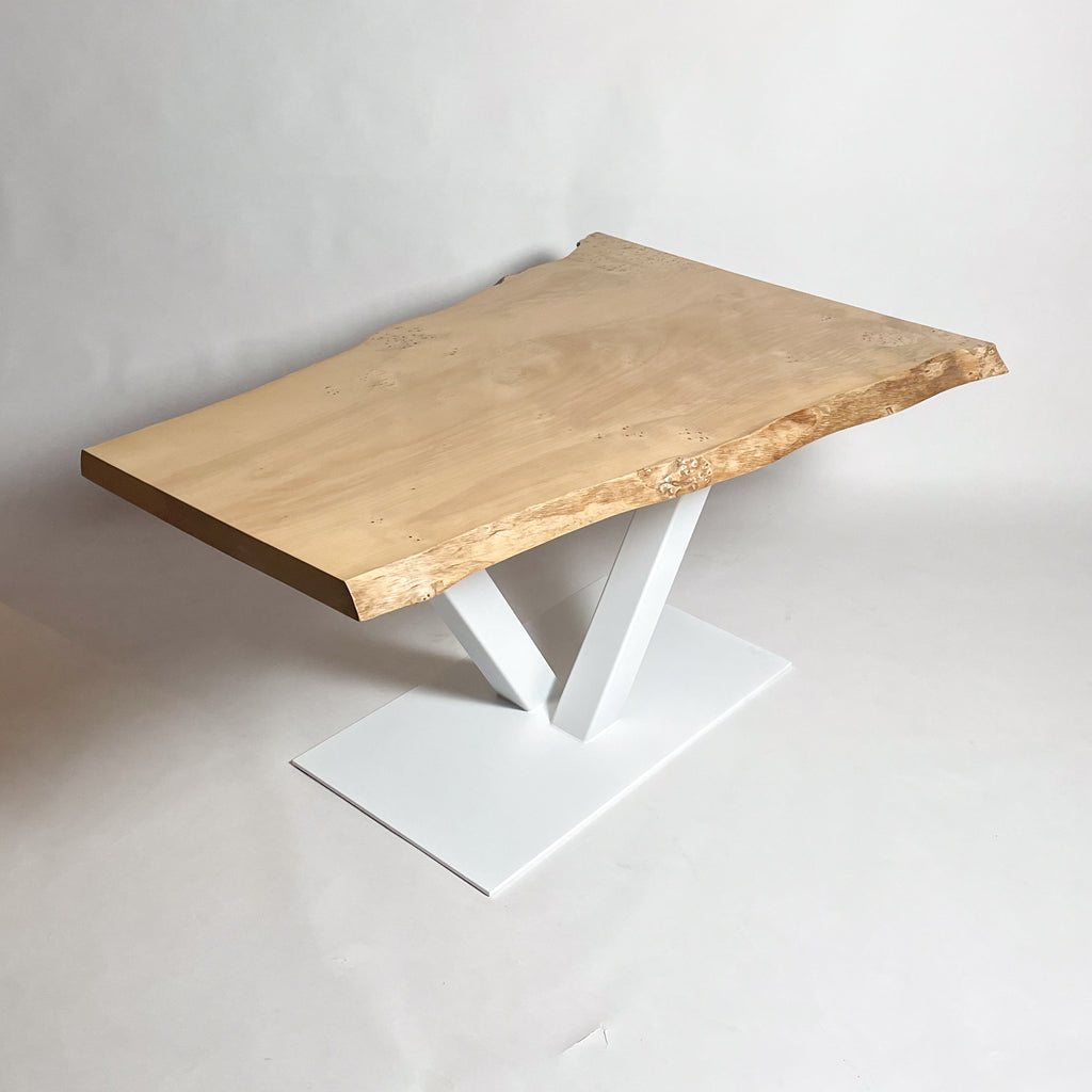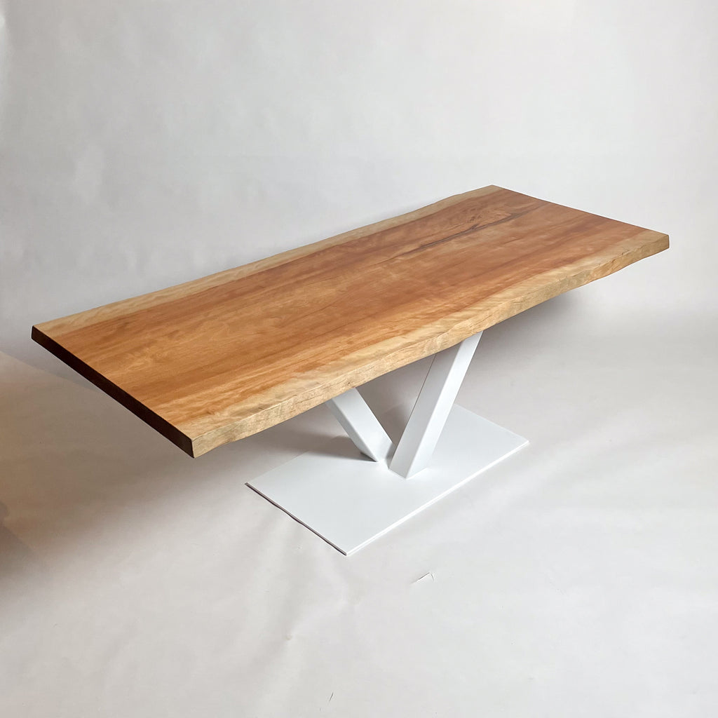 ハイエンドVは、シンプルでありながら力強い存在感を放つデザイン脚。左右に広がるV字のフォルムは、均整のとれた美しさと確かな安定感を兼ね備えています。ツヤを抑えたマットな質感が落ち着いた印象を与え、一枚板の持つ個性をより際立たせます。