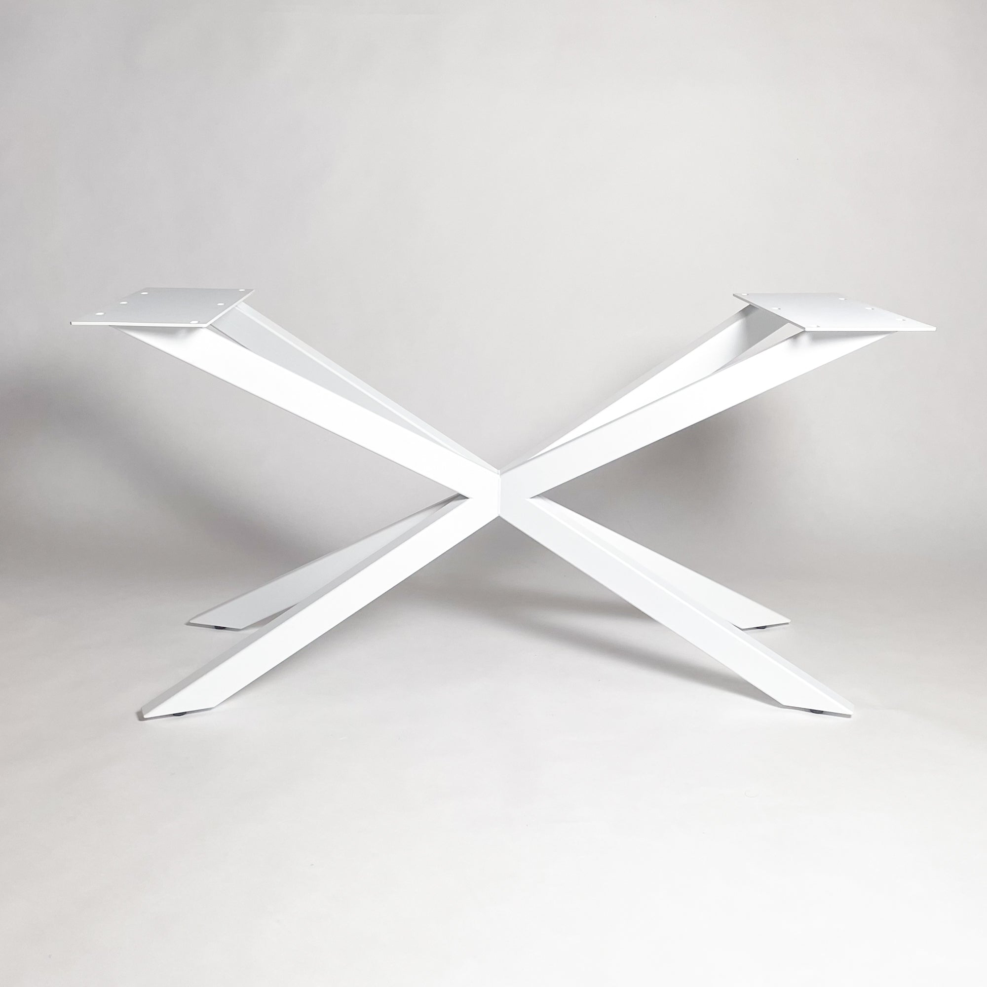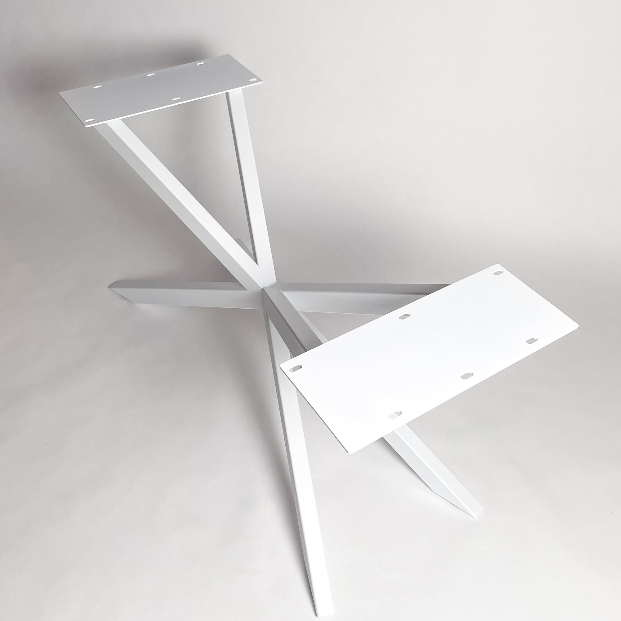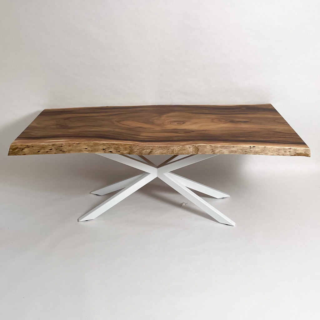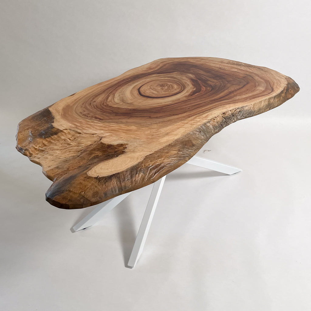 力強く交差する4本の脚が、天板をしっかりと支えるクロスデザイン。どの角度から見ても美しいバランスを保ち、空間に視覚的なリズムと存在感を生み出します。無駄のない構造が生み出す軽やかさと、安定感を両立した設計は、重厚な一枚板とも見事に調和します。