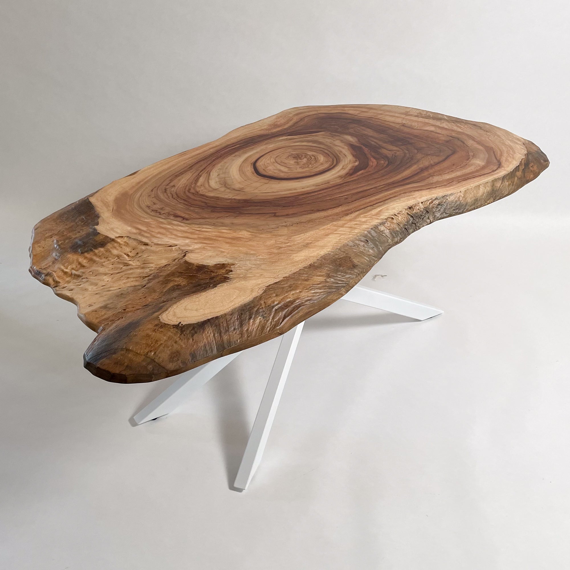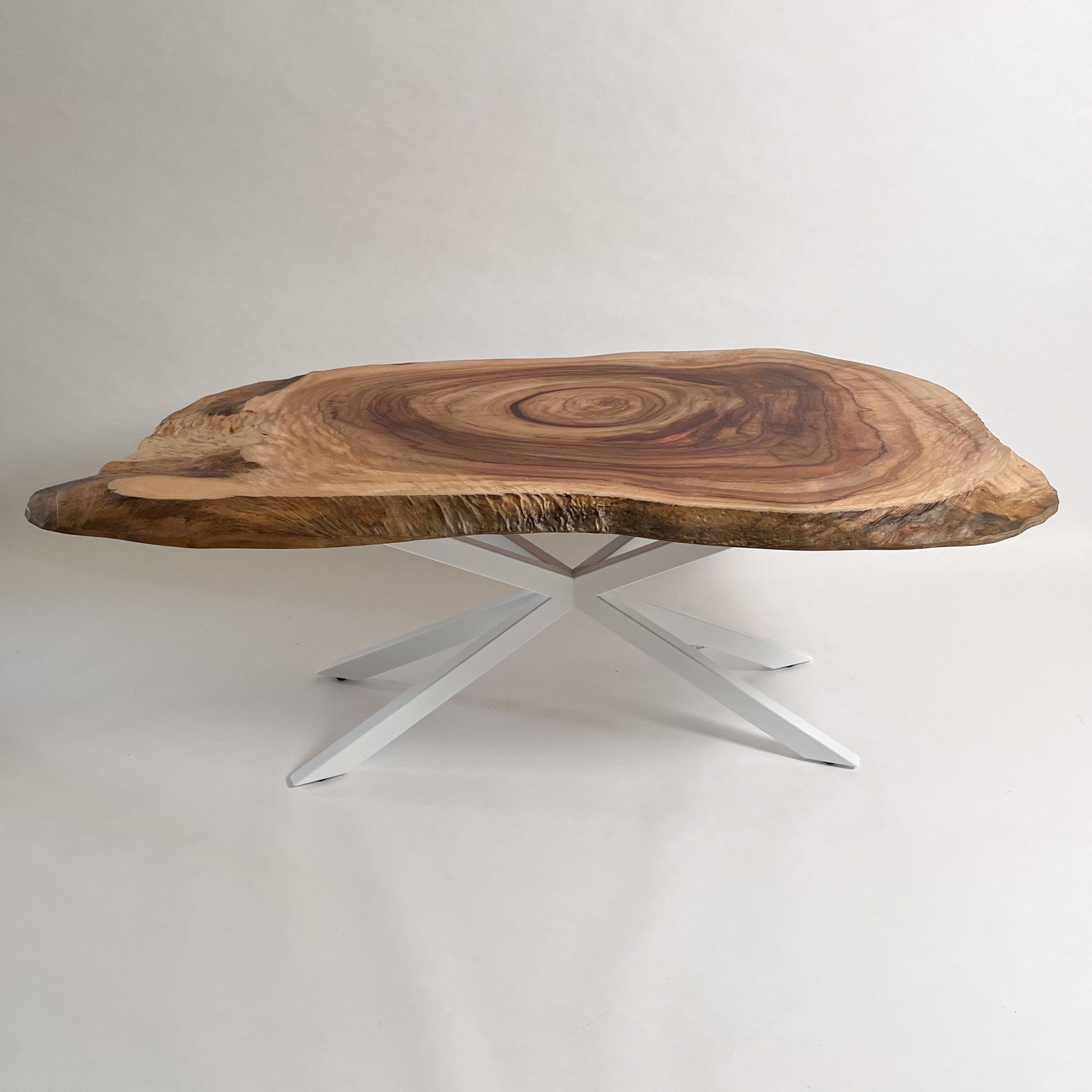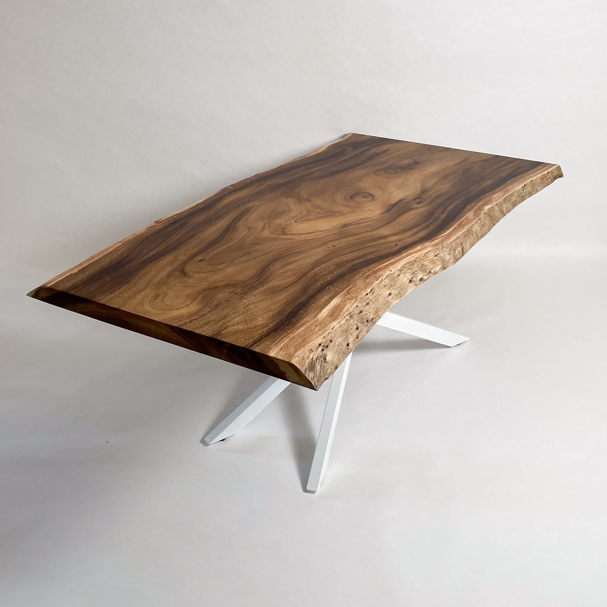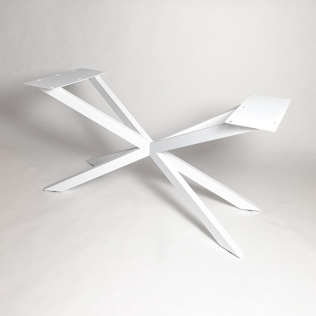 力強く交差する4本の脚が、天板をしっかりと支えるクロスデザイン。どの角度から見ても美しいバランスを保ち、空間に視覚的なリズムと存在感を生み出します。無駄のない構造が生み出す軽やかさと、安定感を両立した設計は、重厚な一枚板とも見事に調和します。