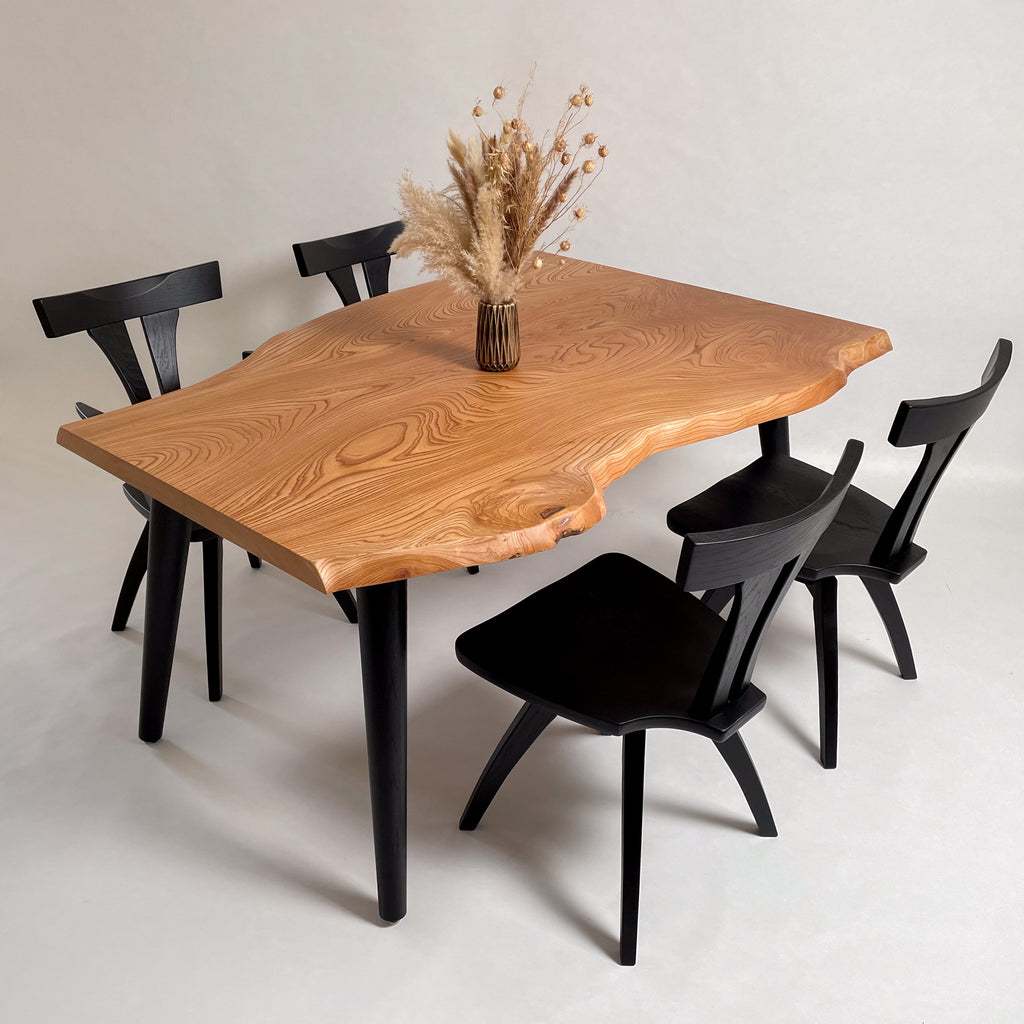 脚まわりがすっきりしているため椅子の出し入れがしやすく、日々の食卓を快適に。無垢材ならではの柔らかな手触りと、洗練されたフォルムが調和し、シンプルながらも品のあるダイニングシーンを演出します。軽やかで美しい佇まいは、長く暮らしに寄り添う名脇役です。