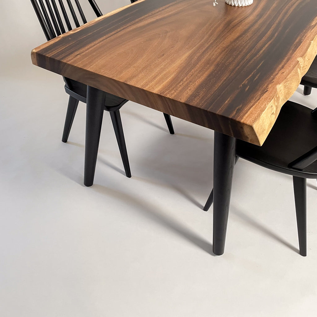 リッジスリムは、細身でありながら安定感のあるデザインが魅力のテーブル脚。絶妙にテーパードした丸脚が、一枚板をしなやかに支えます。視覚的な重さを抑え、空間全体に軽やかな印象をもたらし、ダイニングを広々と見せてくれます。