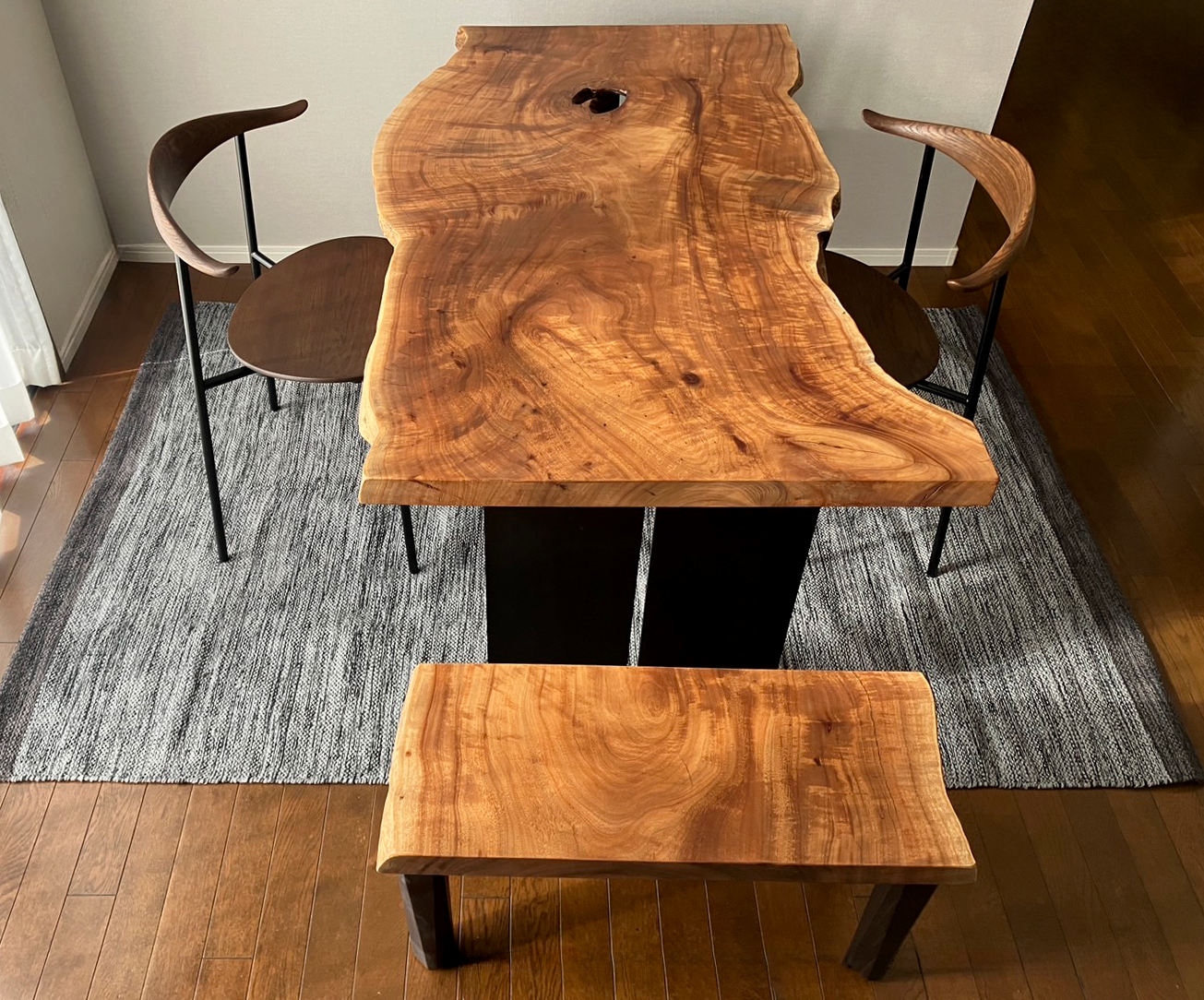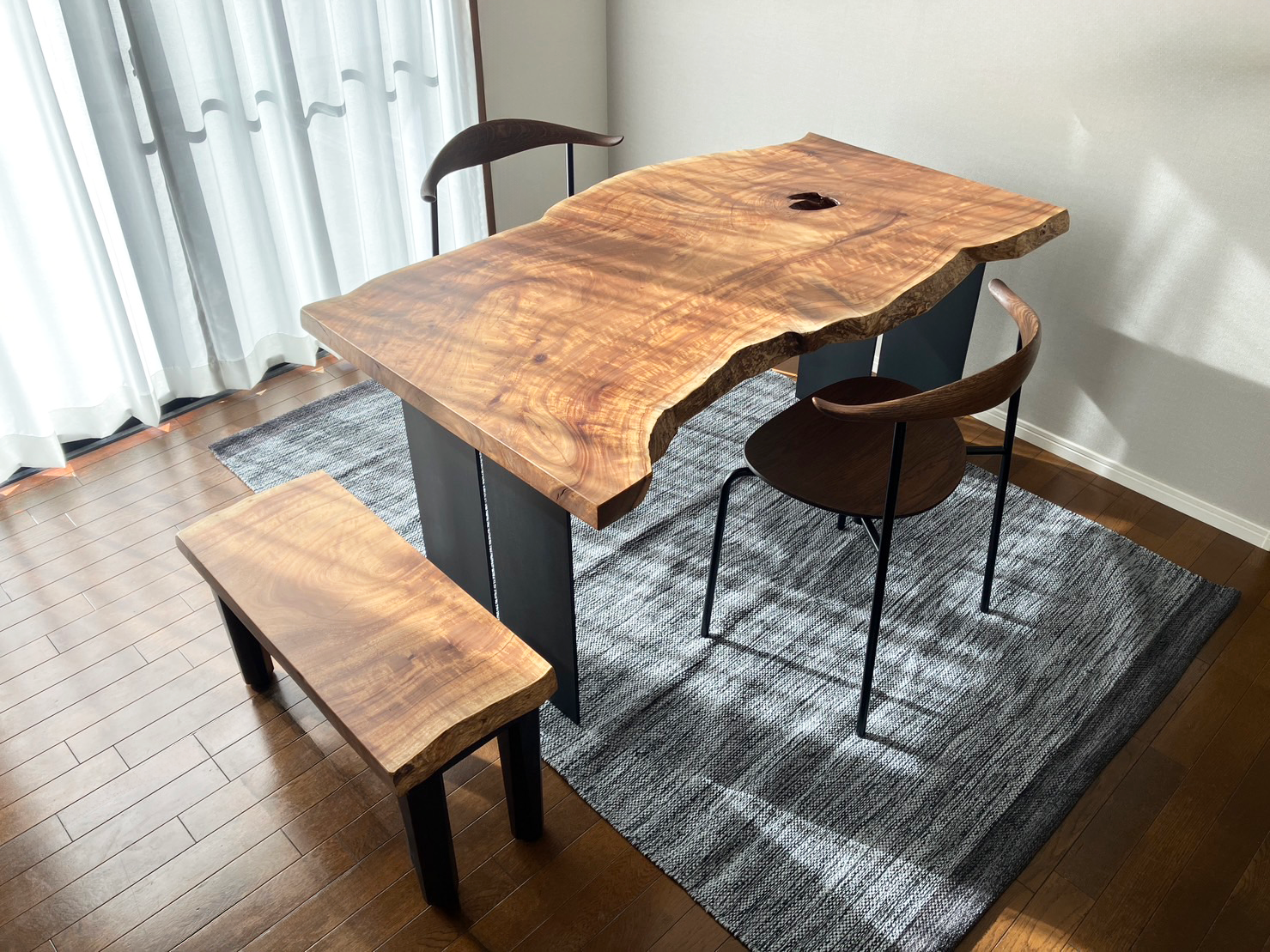余計な装飾を削ぎ落とした、潔いまでのストレートライン。まっすぐに伸びるそのフォルムは、一枚板の持つ曲線美や木目の表情をより際立たせ、天板本来の魅力を余すことなく引き出します。シンプルでありながら、空間に置かれた瞬間に感じるのは確かな存在感。無言のうちに空間の重心を整え、凛とした落ち着きをもたらします。