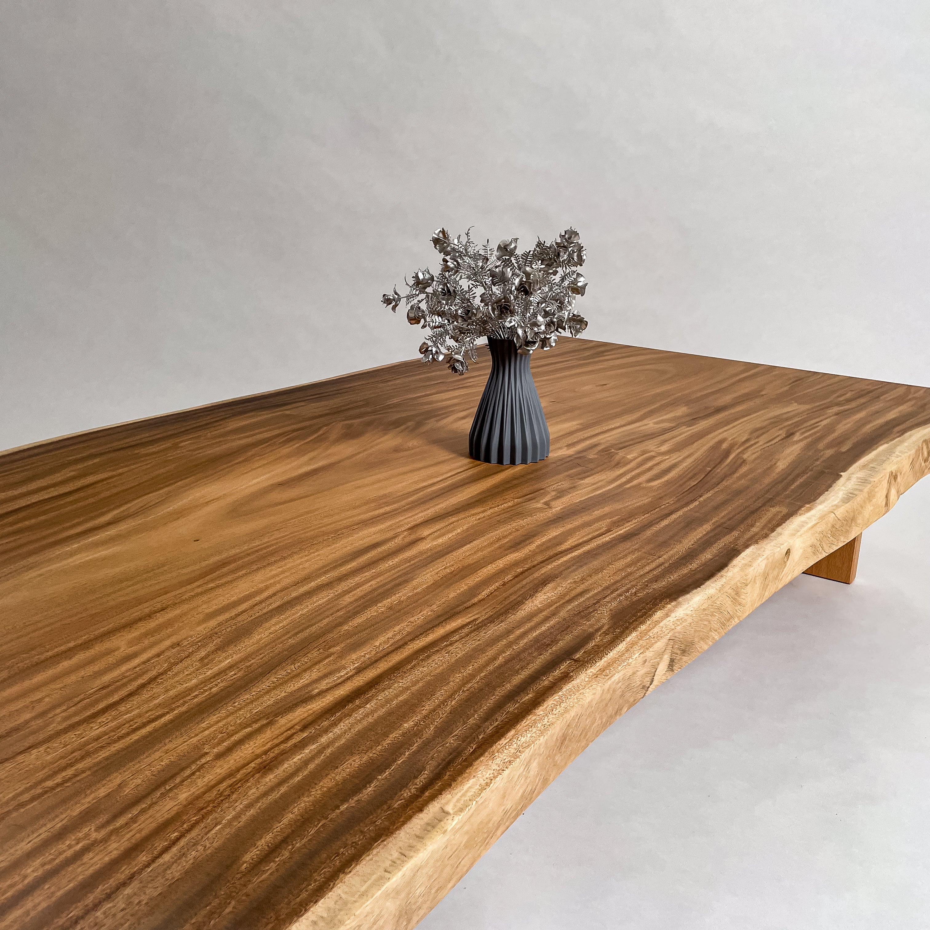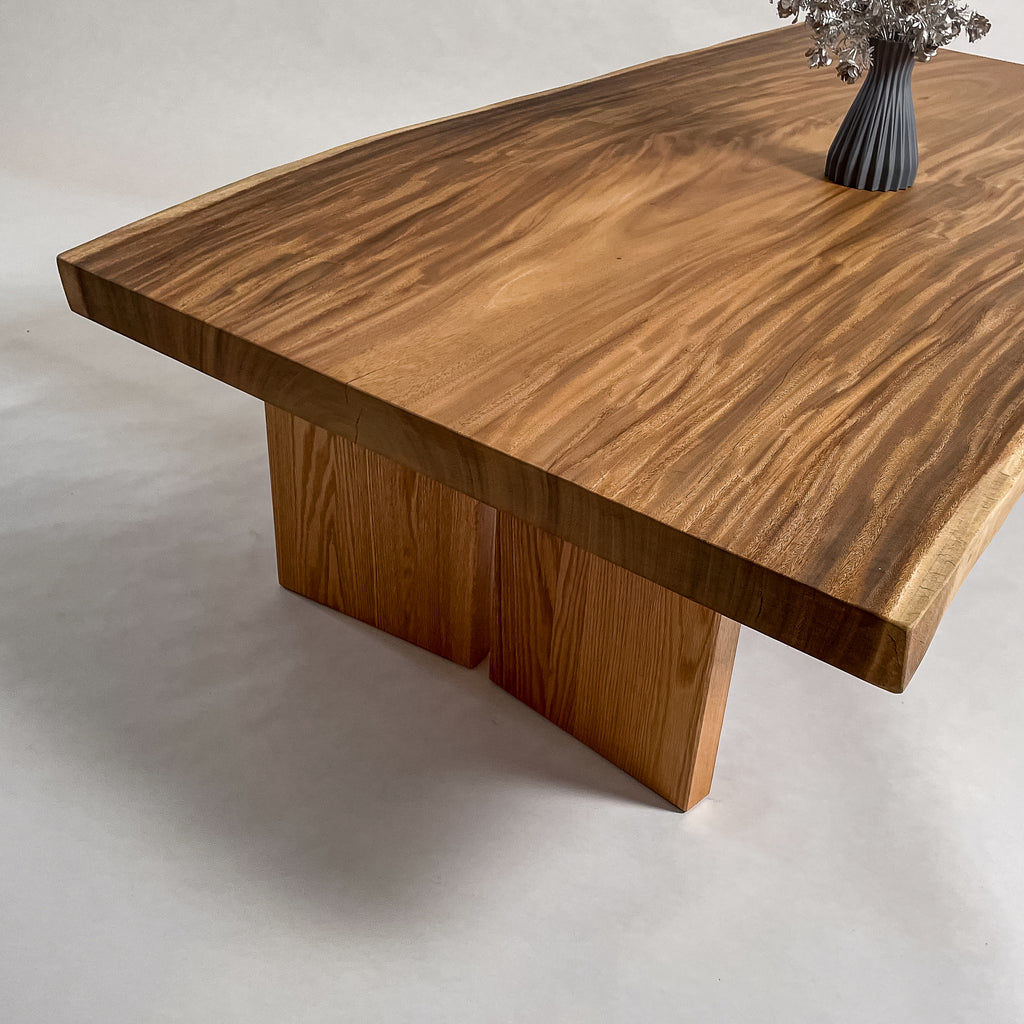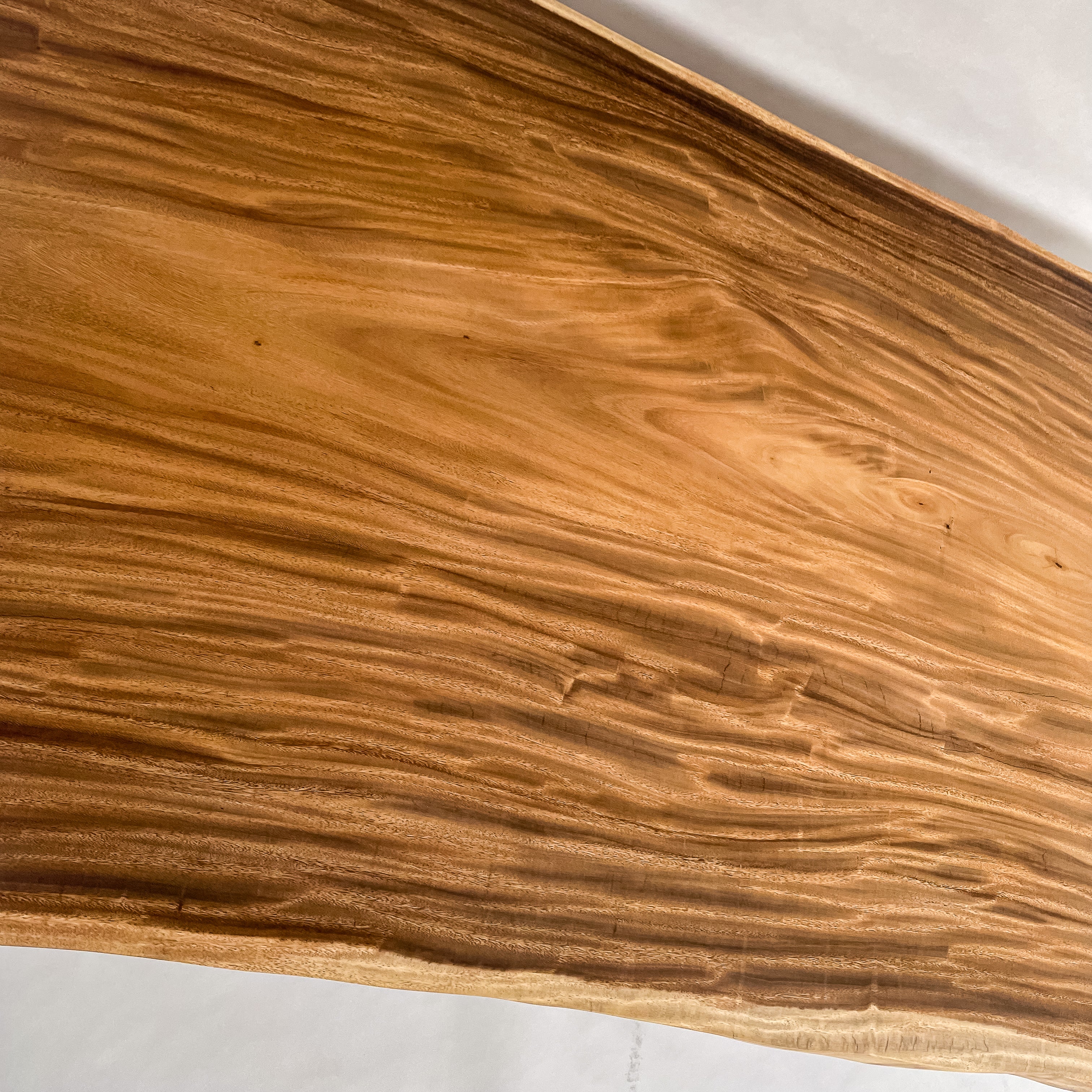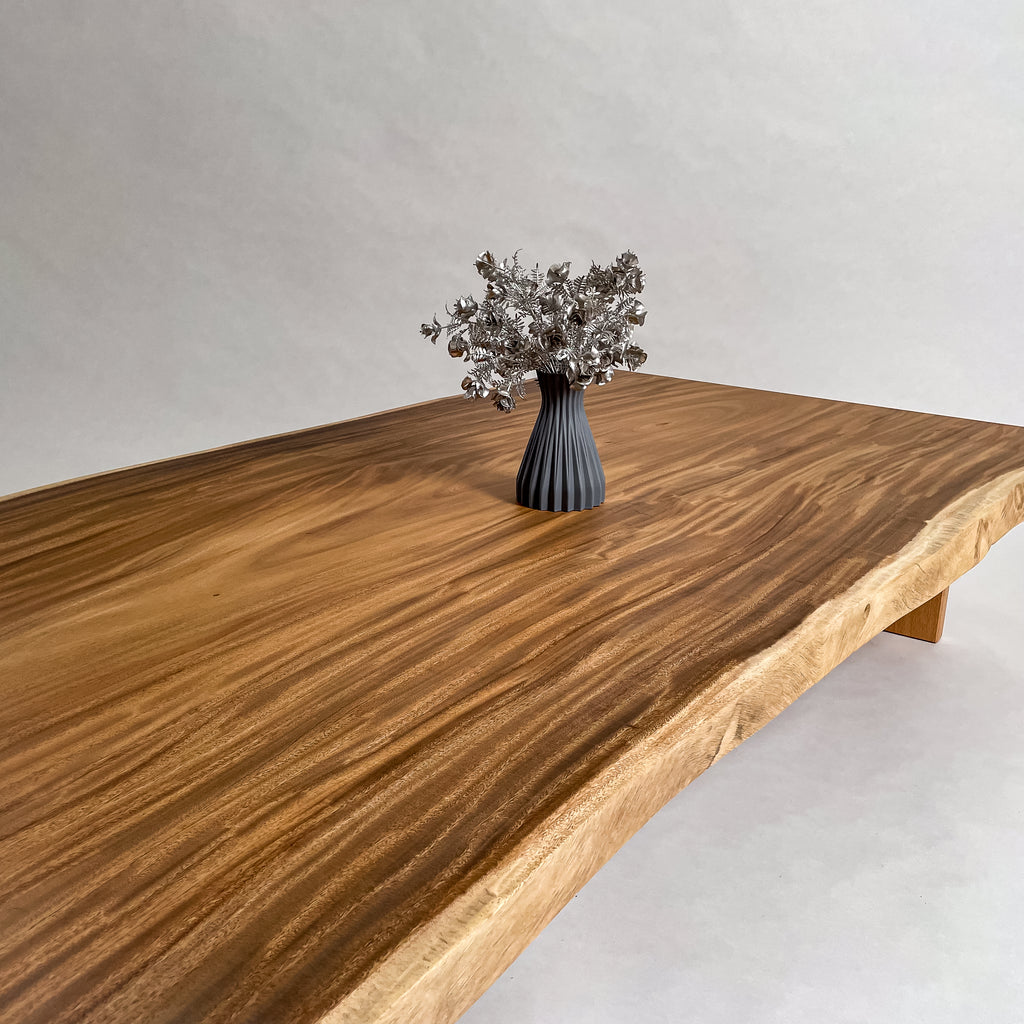 南国の陽光に包まれ育ったモンキーポッド。時を重ねて刻まれた年輪が波のような立体杢を描きます。光の角度で表情を変え、温もりと奥行きを感じさせる上質な一枚板。自然の息吹を宿す存在です。