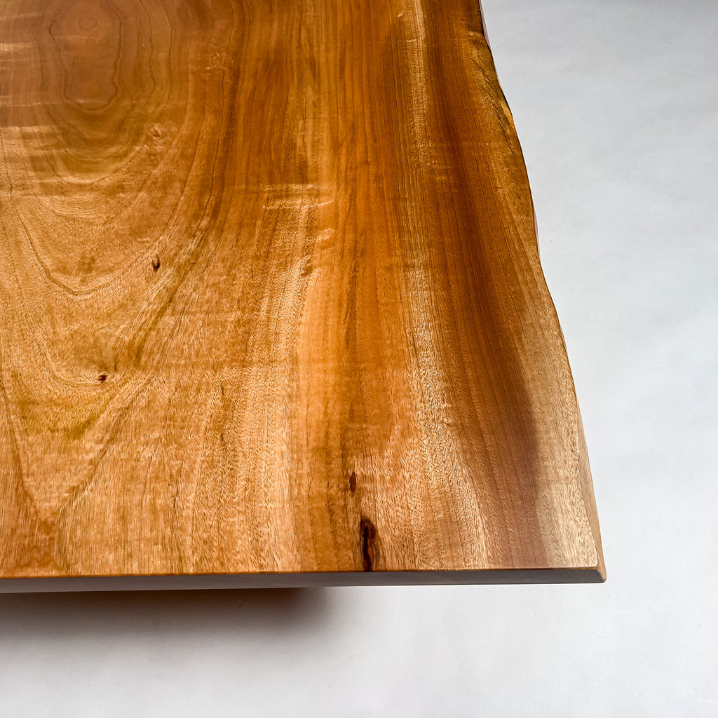 上品で落ち着きのある最高品質の「マットウレタン塗装」。鬼童銘木が磨き上げた技術により、すべての一枚板に独自の特殊塗装を施しています。