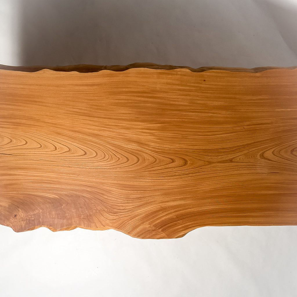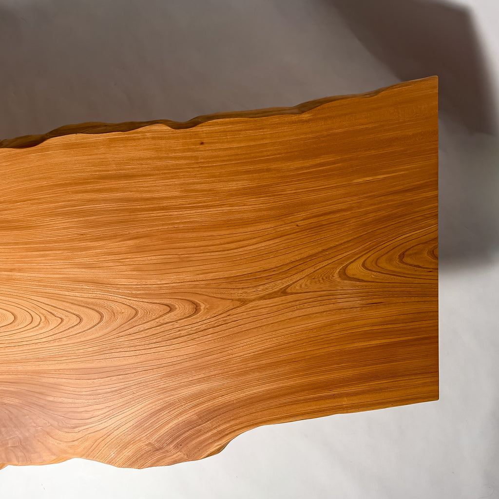 悠々と育った欅から生まれた一枚板です。揺れるように現れる柾目と板目が、時を重ねた森の記憶を語ります。淡く艶やかな黄金色は陽光を映す明るさ。自然の曲線を残した縁が、生きた姿をそのまま映す上品な仕立てです。