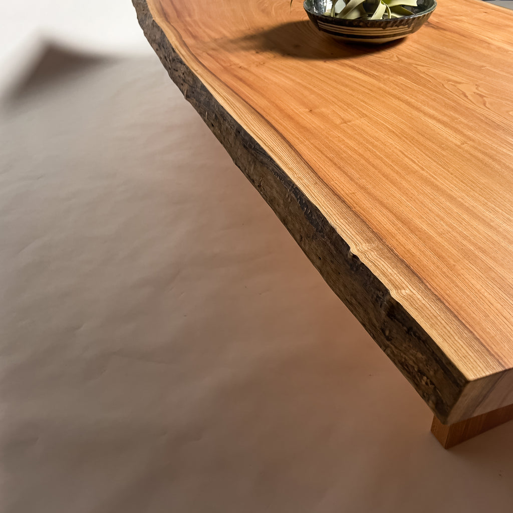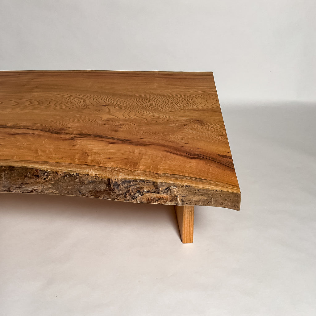 | 自然が生み出した不均一な表情を 読み解き、素材の持つ品格や奥行きが際立つよう、細部まで配慮した加工で完成度を高める。 | 一枚板単体の美しさだけでなく、置かれる空間や光の入り方までを思い描き、その場に自然と溶け込む佇まいへと仕上げる。 | |