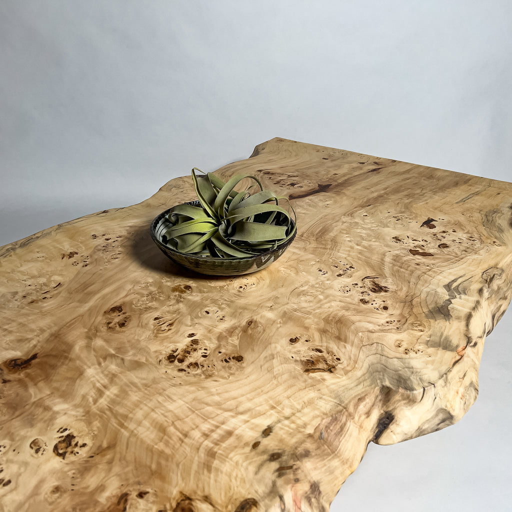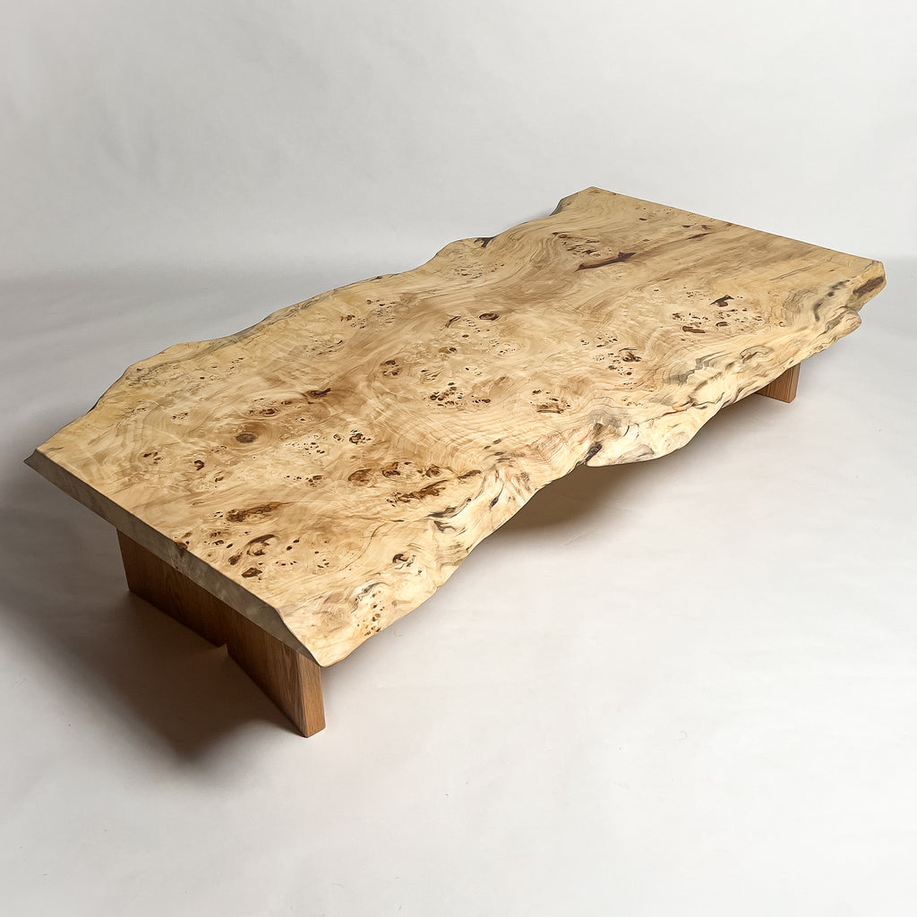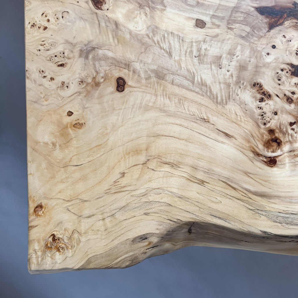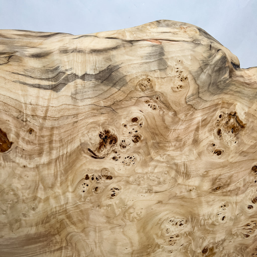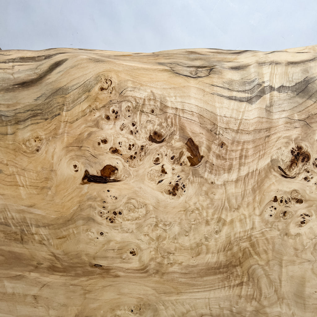 高級感漂う瘤杢(こぶもく)を持ち、荒々しく躍動的な形も魅力的なポプラ。立体感と光沢感ある杢目と雰囲気が魅力的でお部屋を上質で高級な印象に。白く煌びやかに輝き、一際異彩を放つ一枚板。