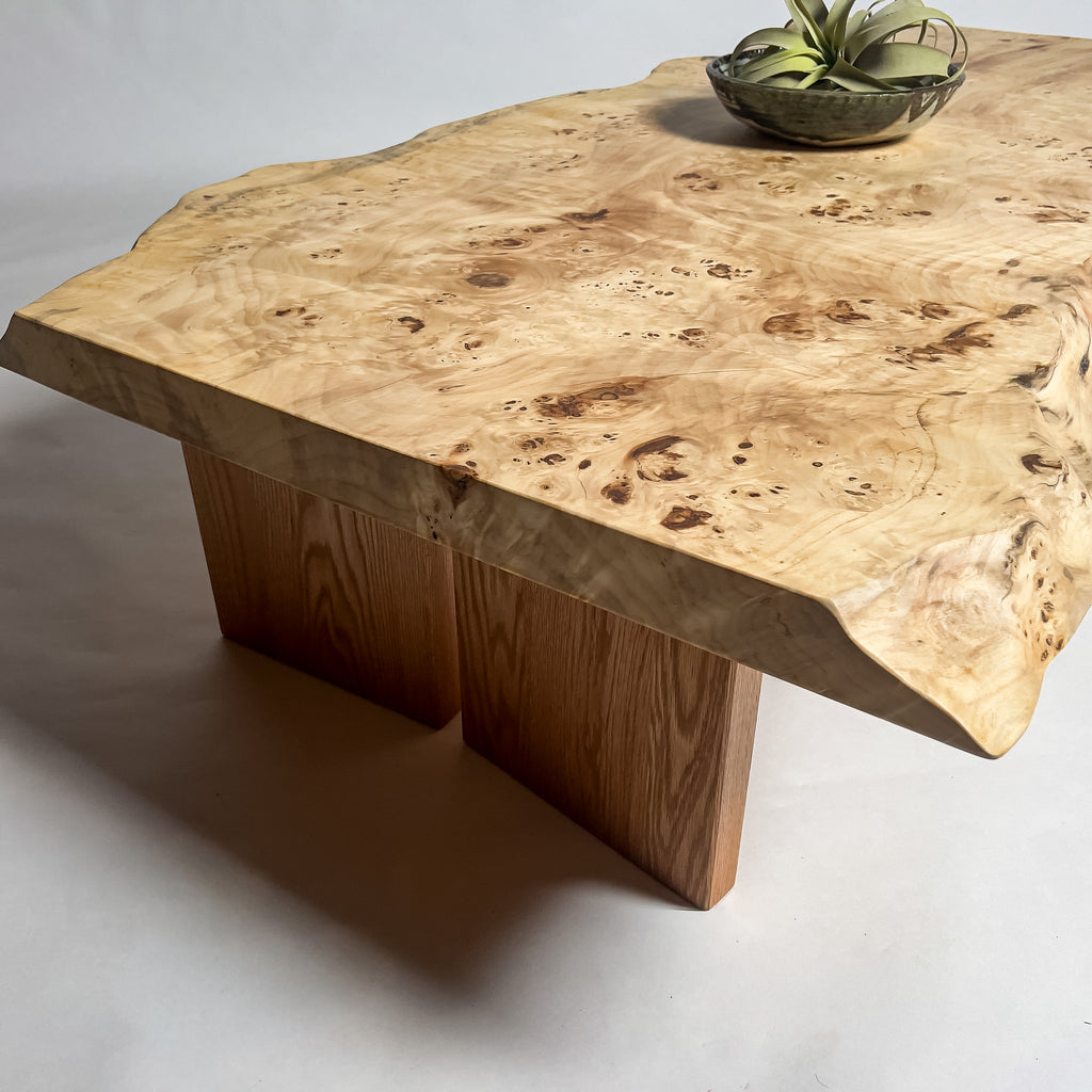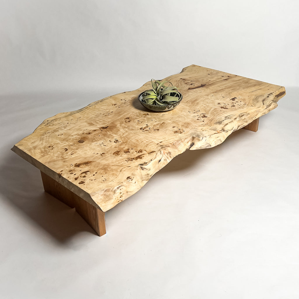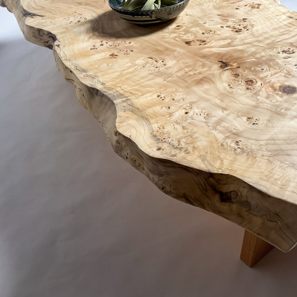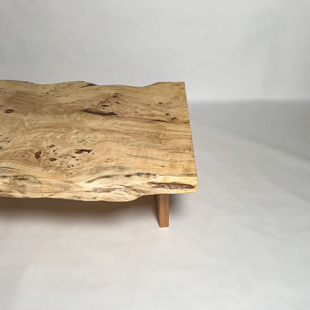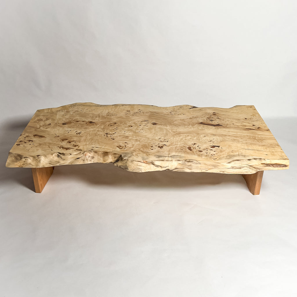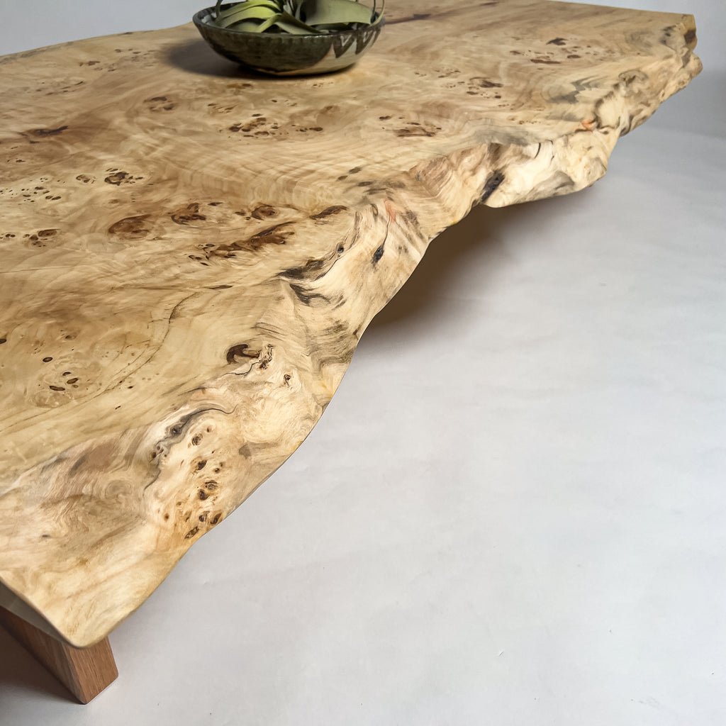 高級感漂う瘤杢(こぶもく)を持ち、荒々しく躍動的な形も魅力的なポプラ。立体感と光沢感ある杢目と雰囲気が魅力的でお部屋を上質で高級な印象に。白く煌びやかに輝き、一際異彩を放つ一枚板。
