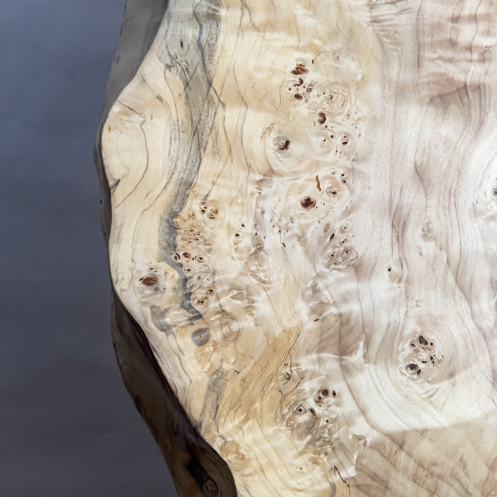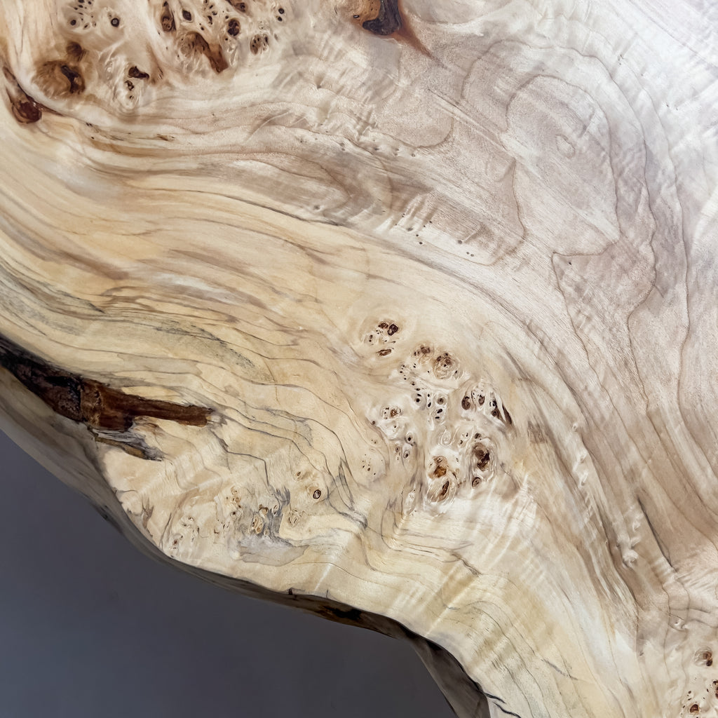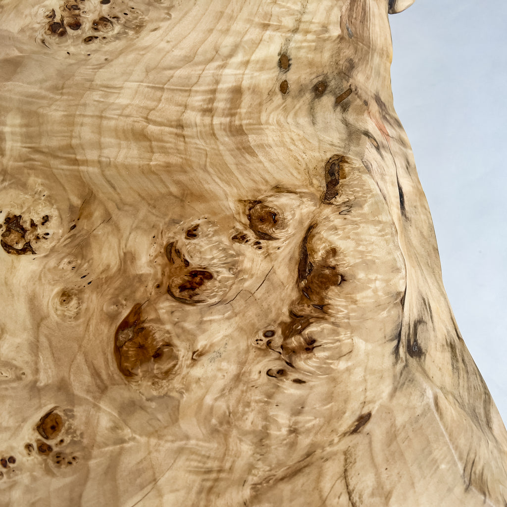 ポプラ特有の瘤杢が立体的に浮かび上がり、風雨に育まれた模様が淡い木肌に広がります。自然の曲線を上品に残した仕上げが柔らかな景色をつくり、毎日の食卓に穏やかなぬくもりを添え、心地よい時間を育みます。