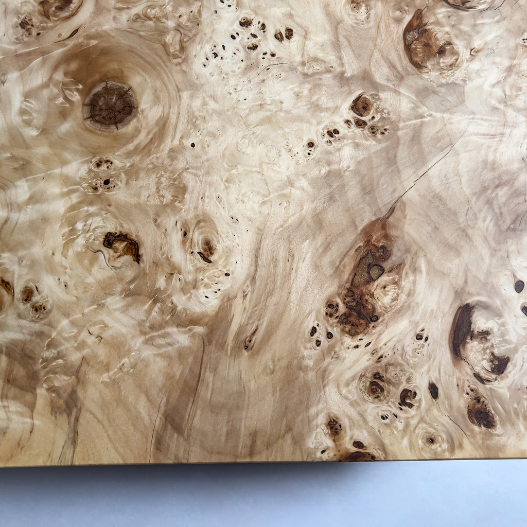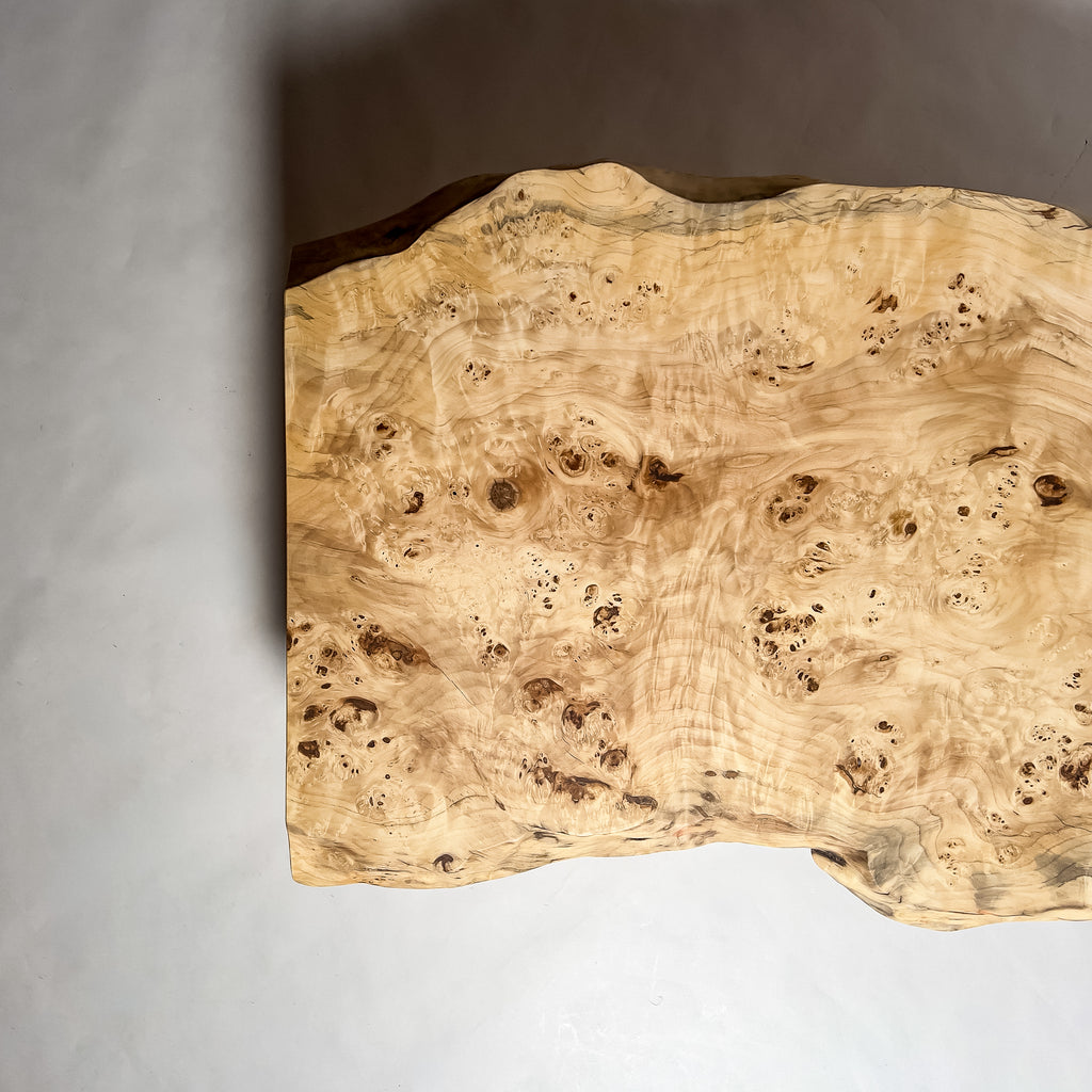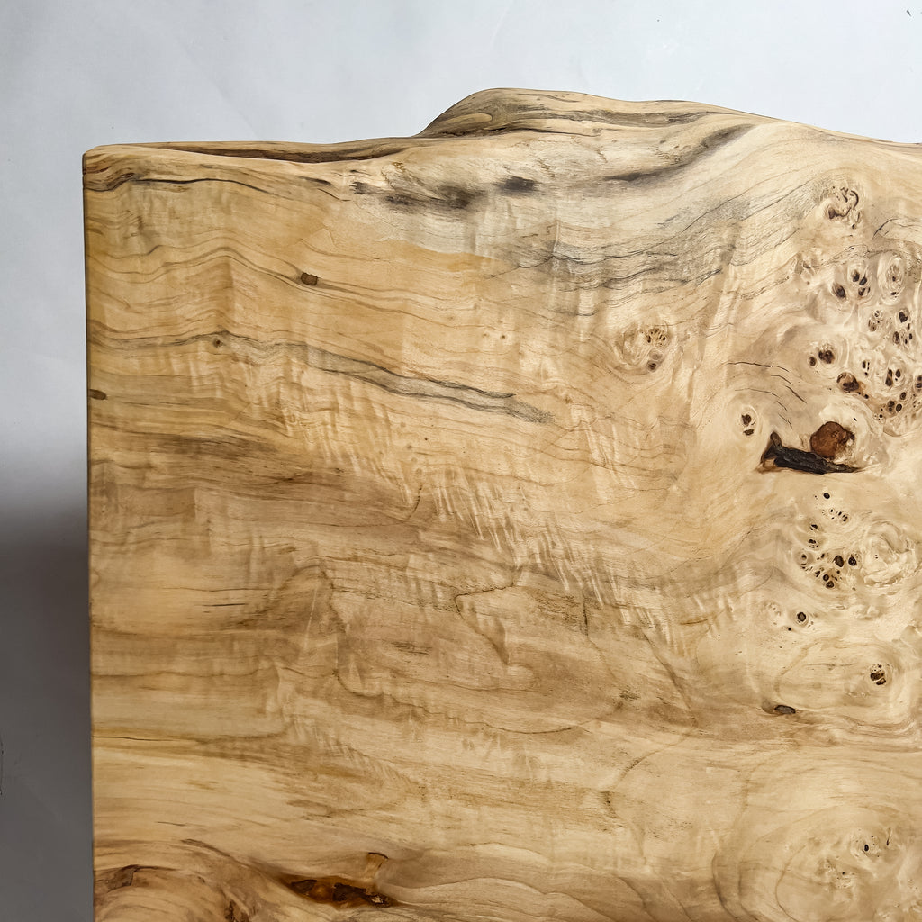 ポプラ特有の瘤杢が立体的に浮かび上がり、風雨に育まれた模様が淡い木肌に広がります。自然の曲線を上品に残した仕上げが柔らかな景色をつくり、毎日の食卓に穏やかなぬくもりを添え、心地よい時間を育みます。