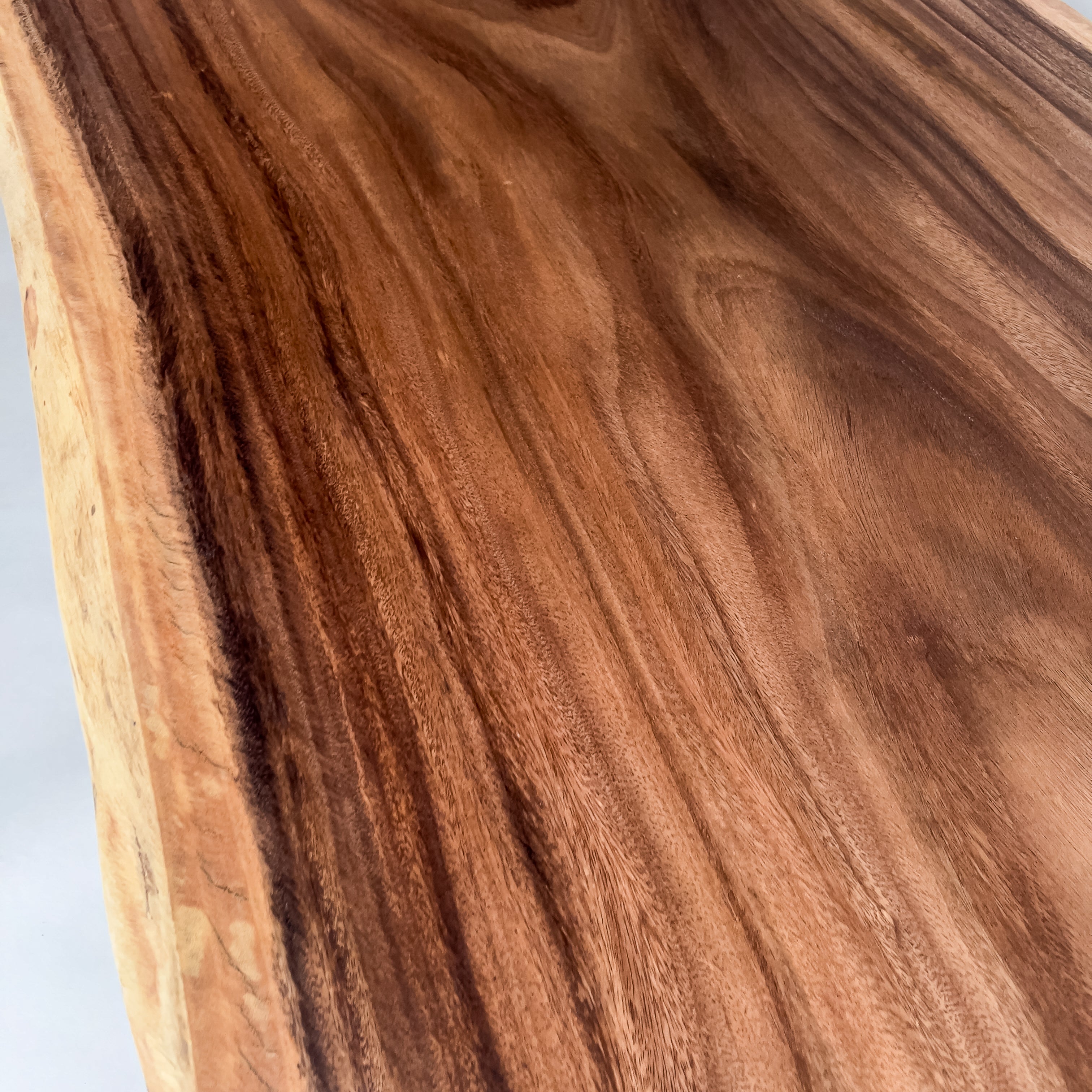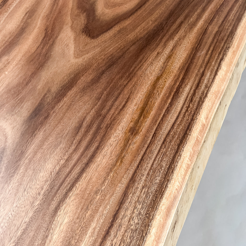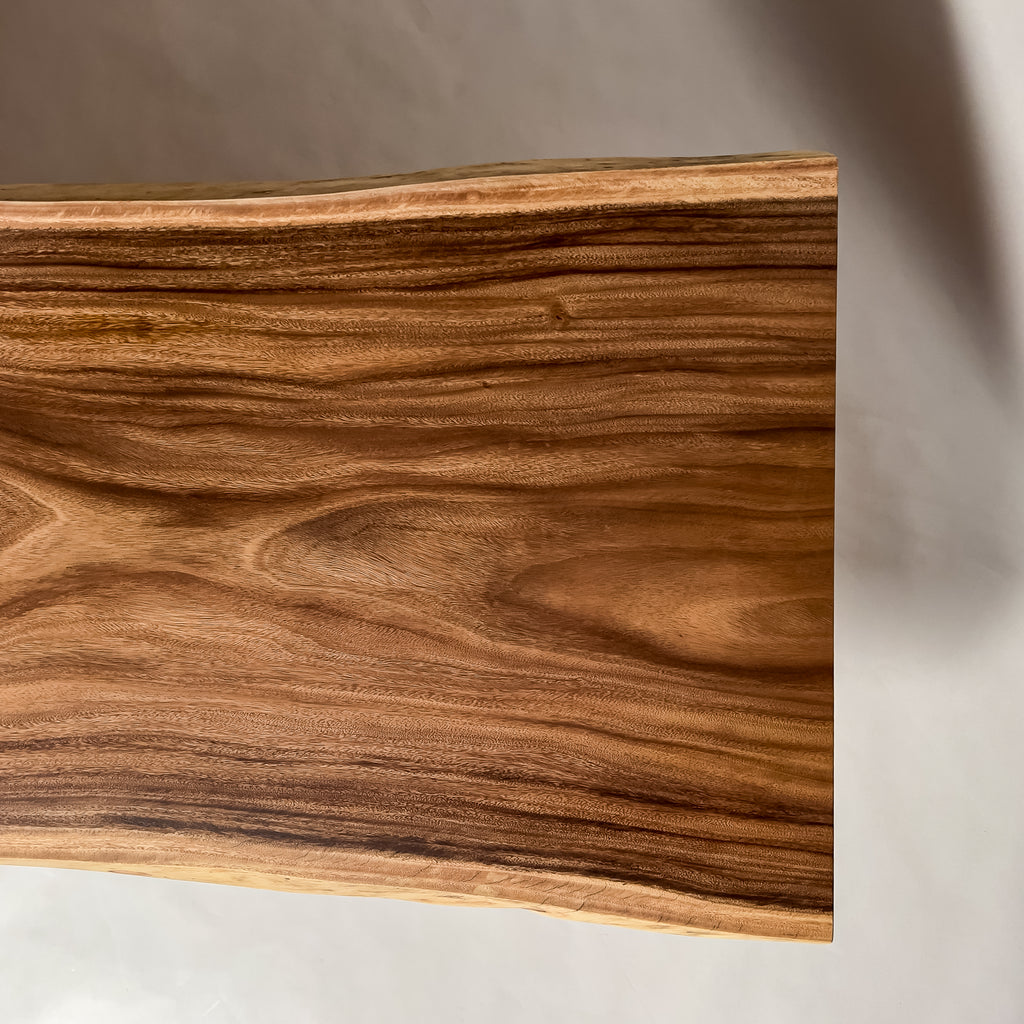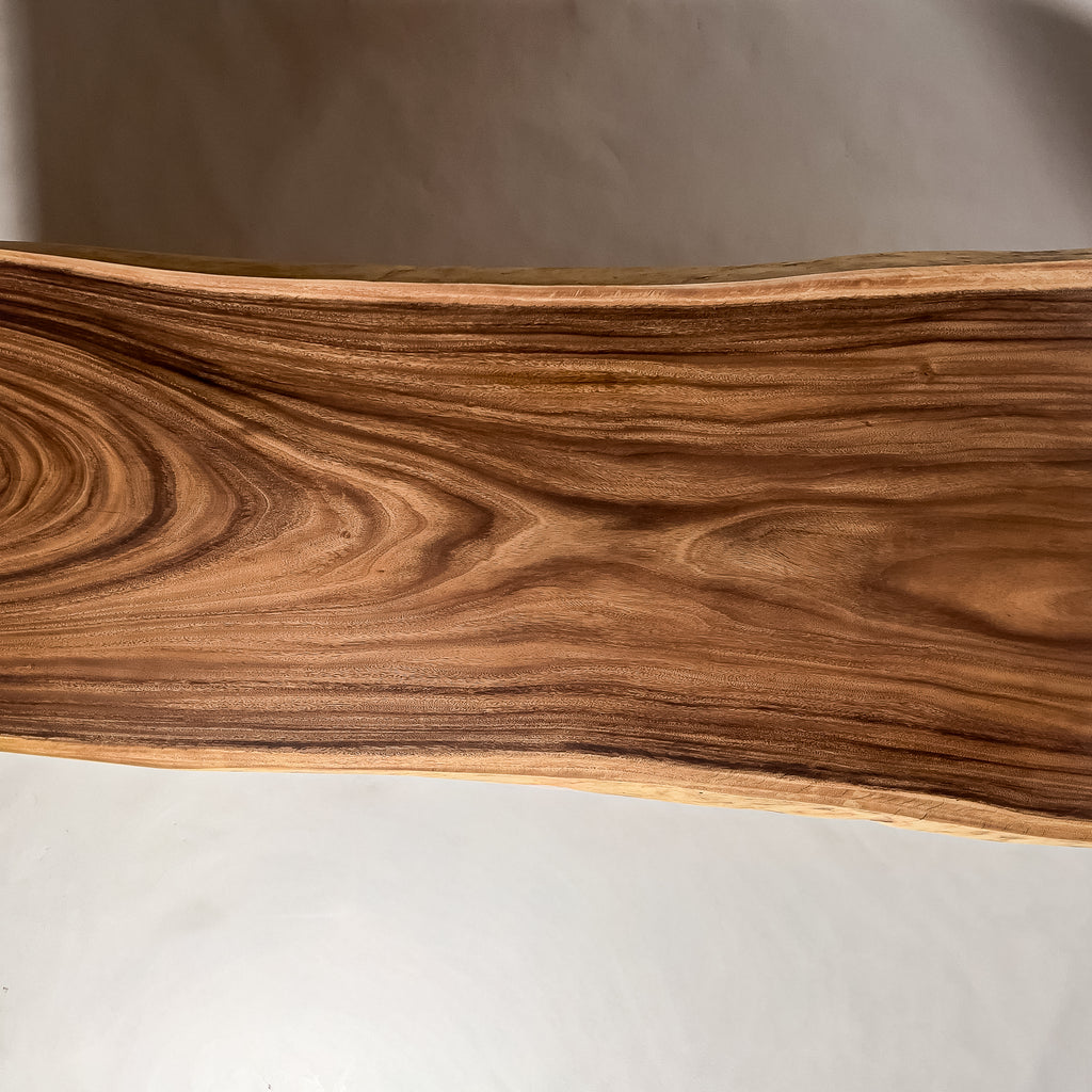 木材の中心部分の心材は濃いダーク色を持ち、耳・皮の部分となる辺材は白い色味が特徴的。綺麗ではっきりと異なるコントラストが美しいモンキーポッド。一枚板の最大の特徴である躍動感も強く感じることができ、お部屋のアクセントとしても活躍する一枚板です。