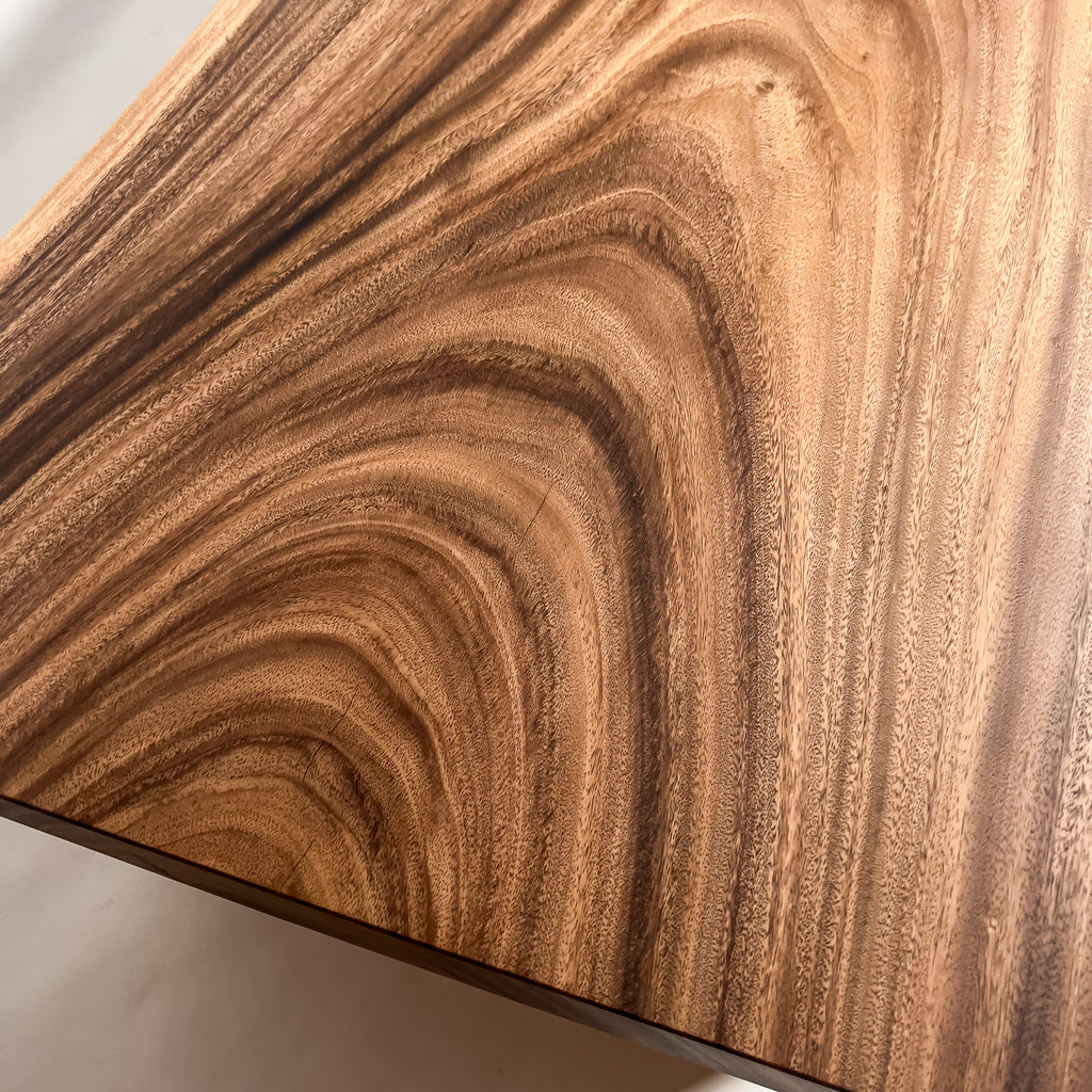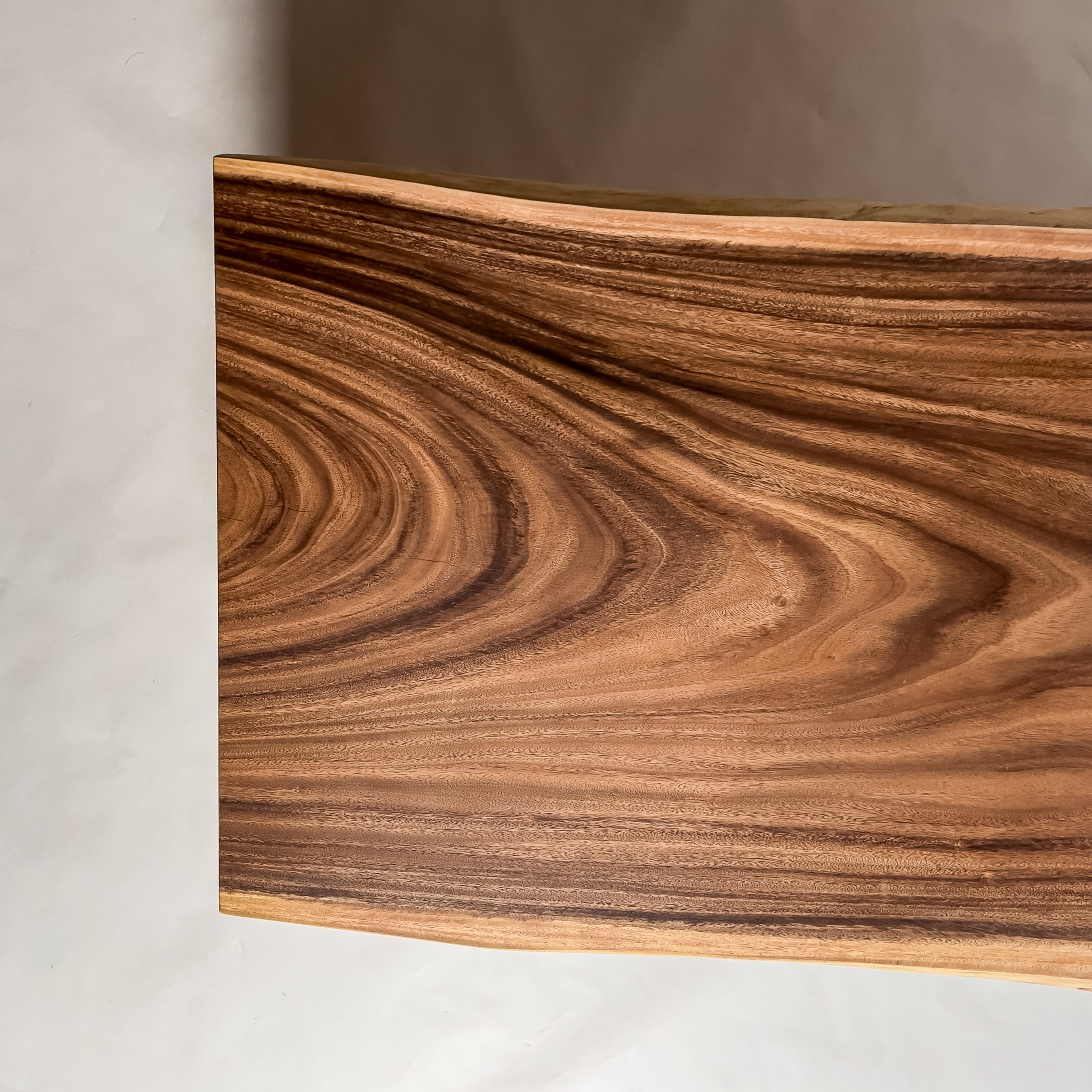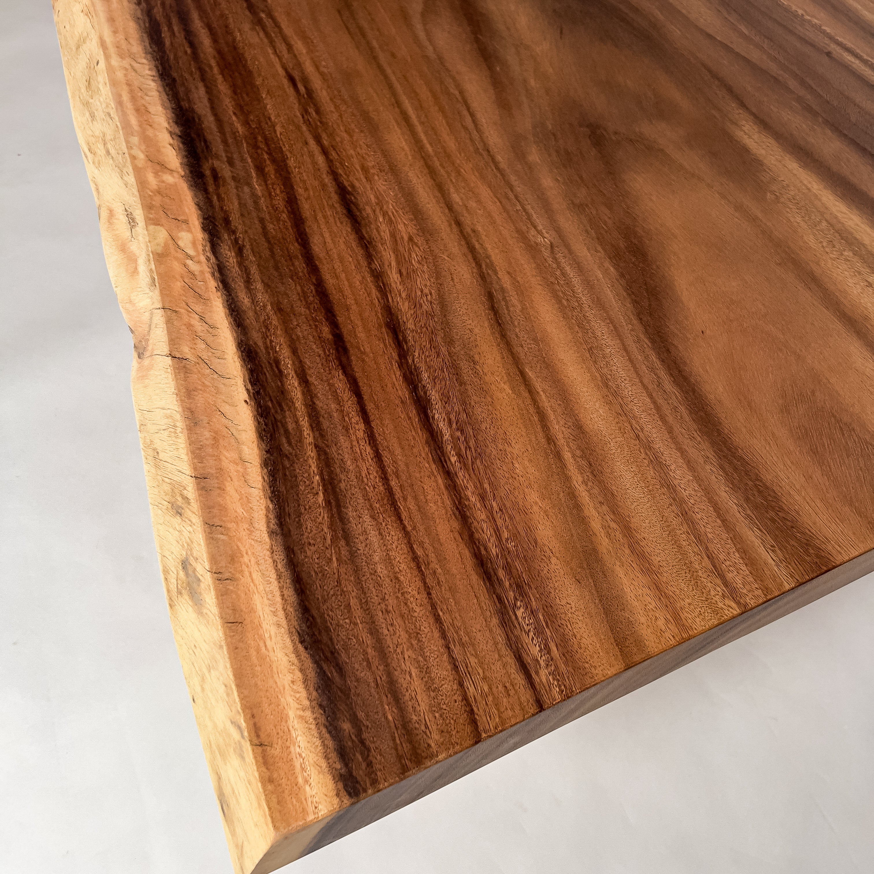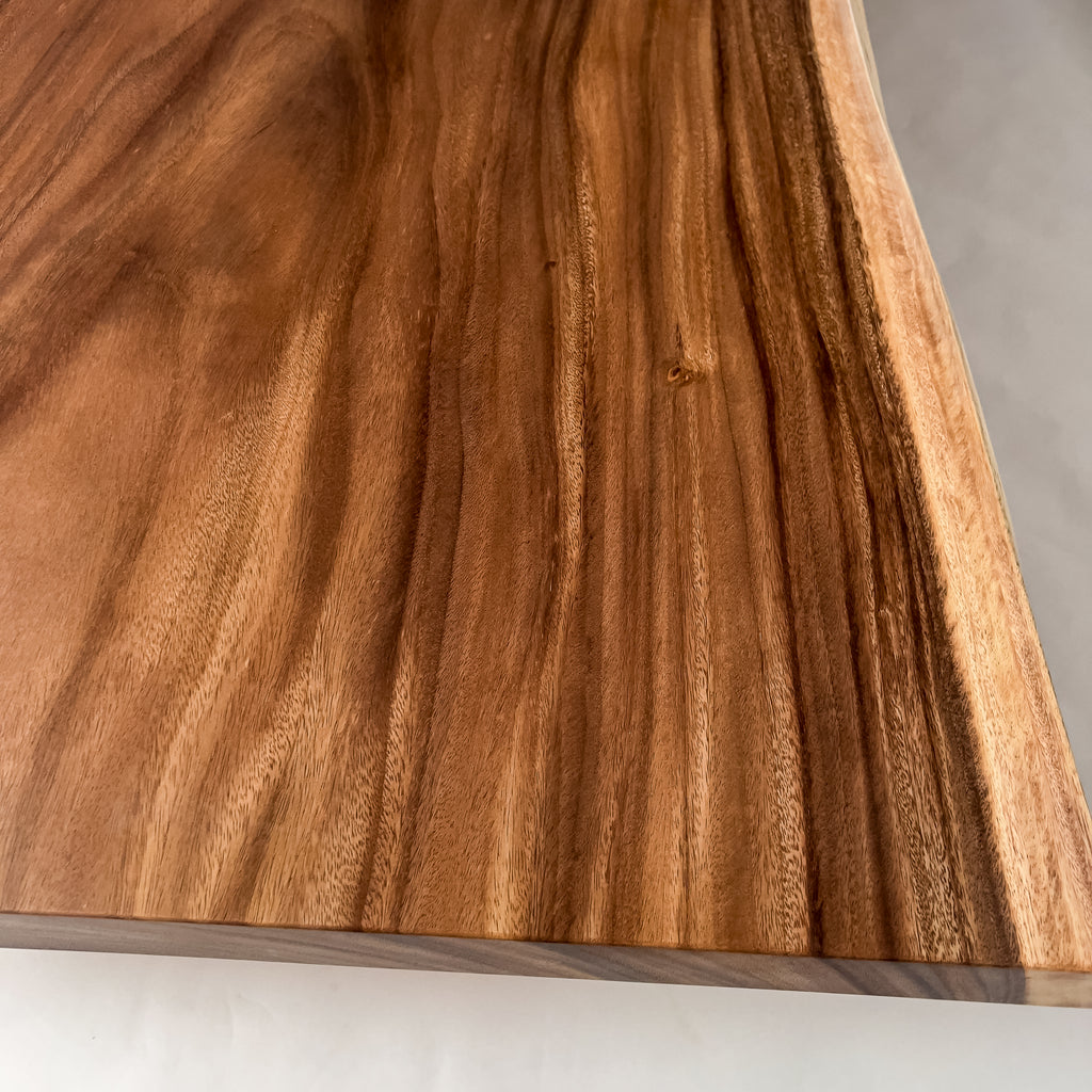 木材の中心部分の心材は濃いダーク色を持ち、耳・皮の部分となる辺材は白い色味が特徴的。綺麗ではっきりと異なるコントラストが美しいモンキーポッド。一枚板の最大の特徴である躍動感も強く感じることができ、お部屋のアクセントとしても活躍する一枚板です。