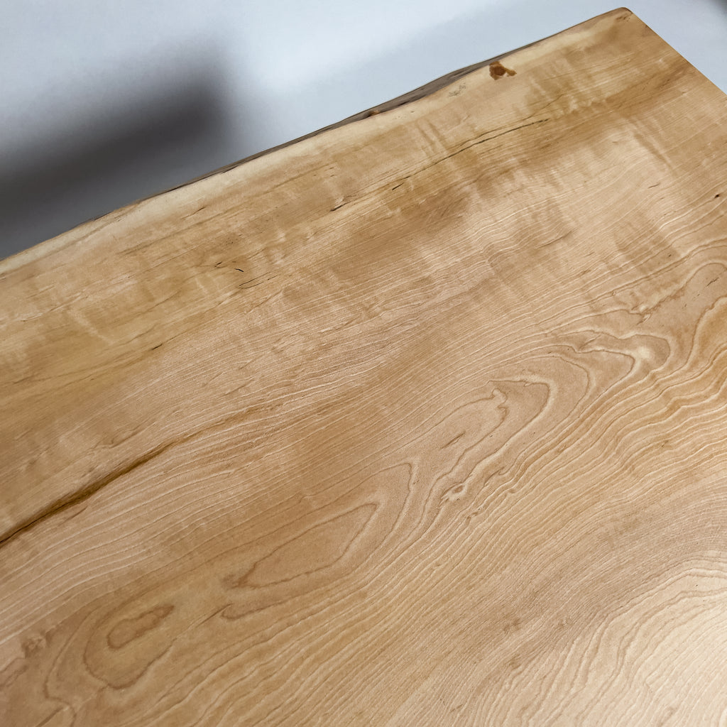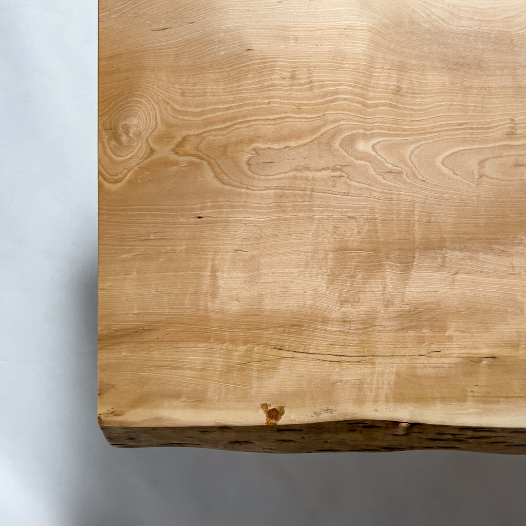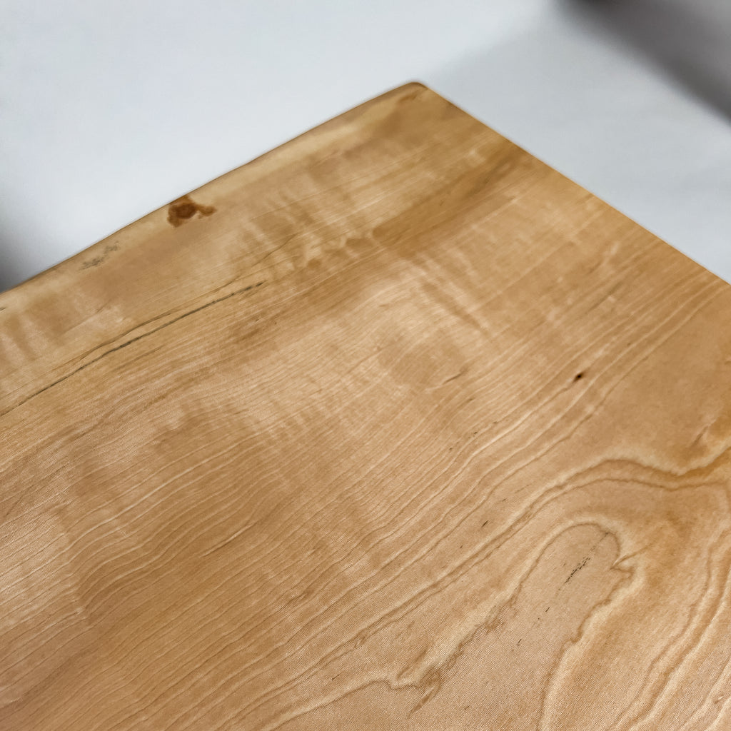 栃ならではの淡い黄金色に、ゆるやかに広がる“玉杢”がやさしい景色を描きます。山の陽を浴び育った流れがそのまま現れ、ほのかな揺らぎを宿す表情が心地よい時間をつくります。自然の輪郭を生かした上品な仕上げの一枚。