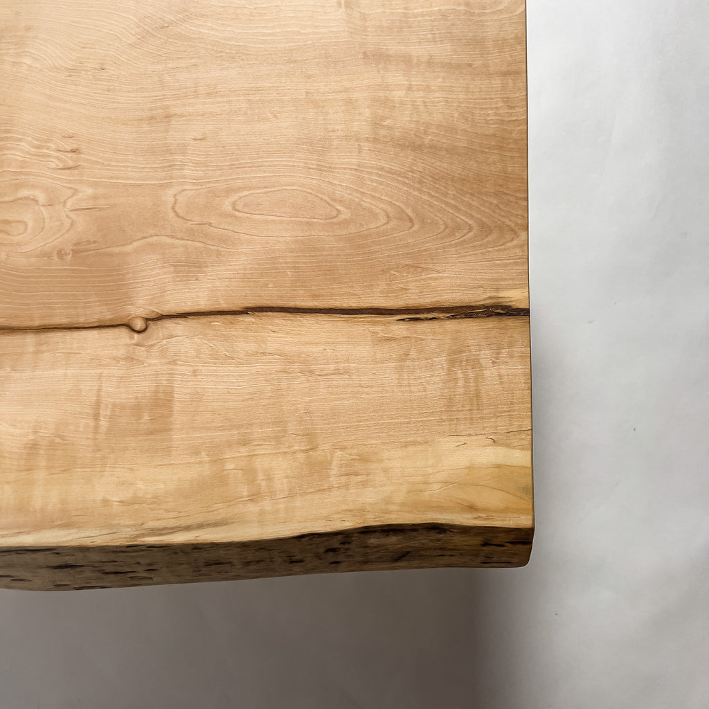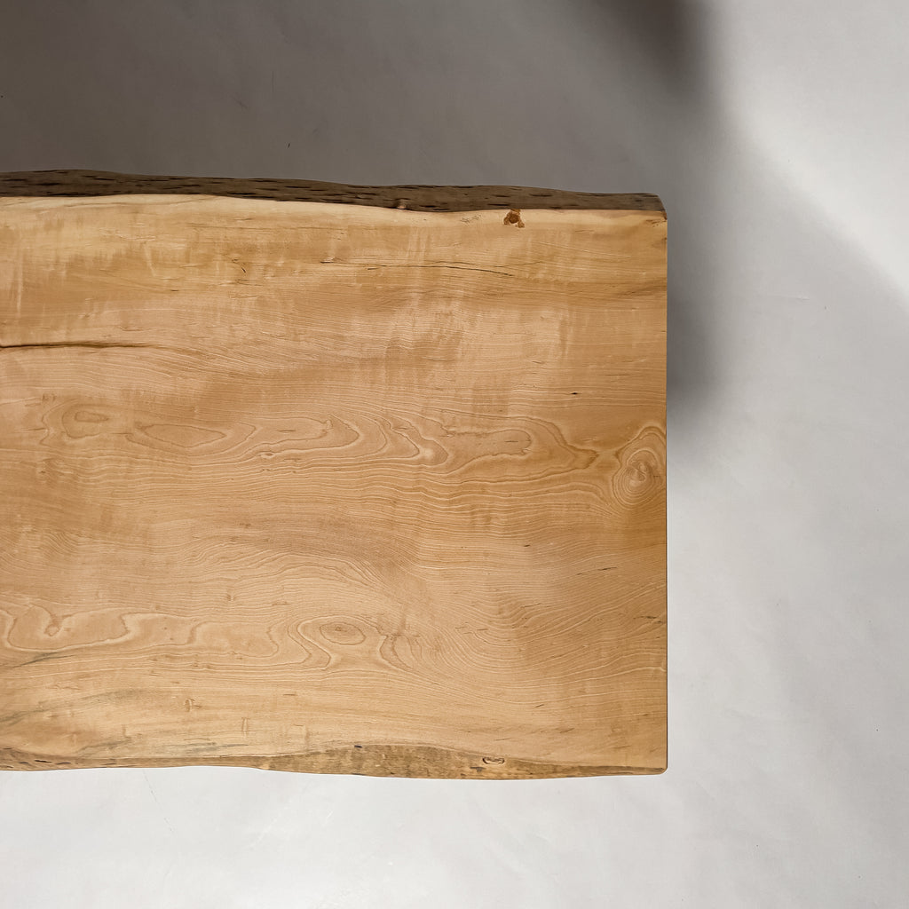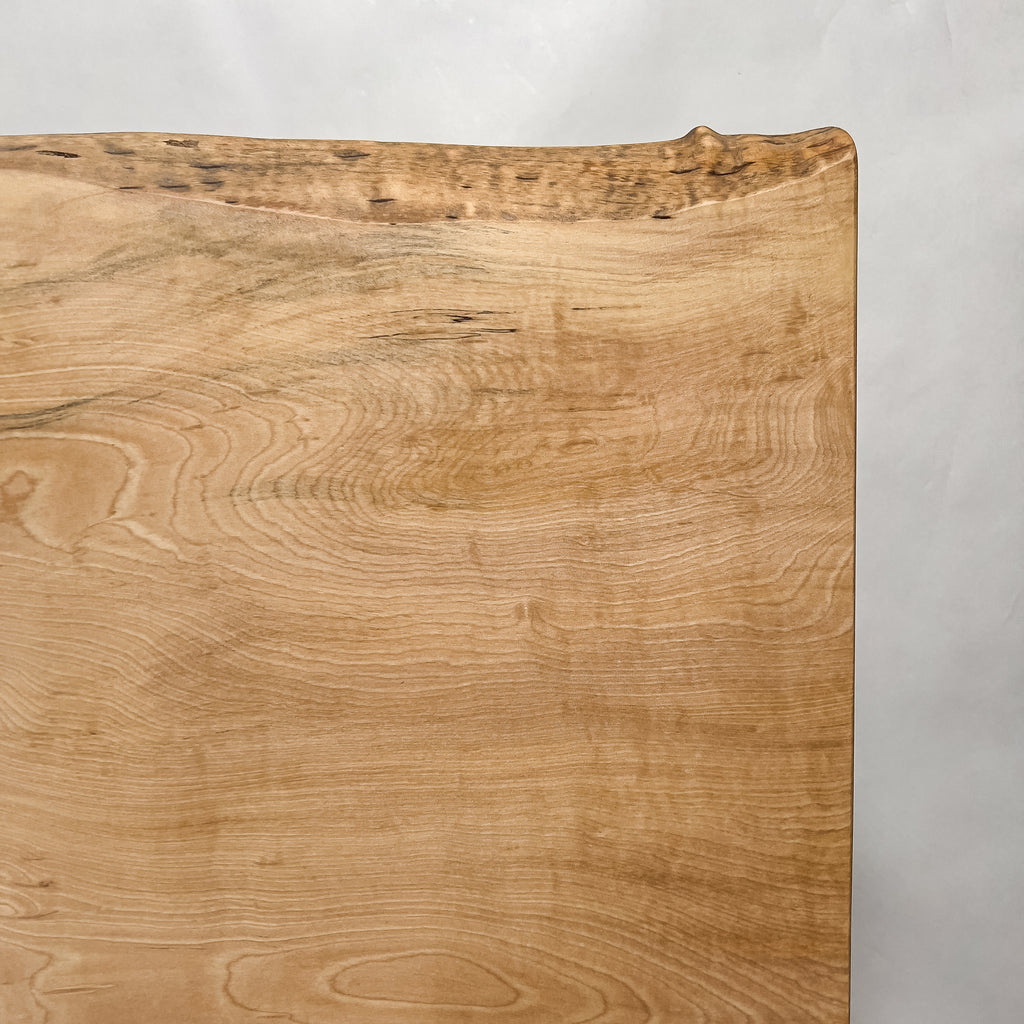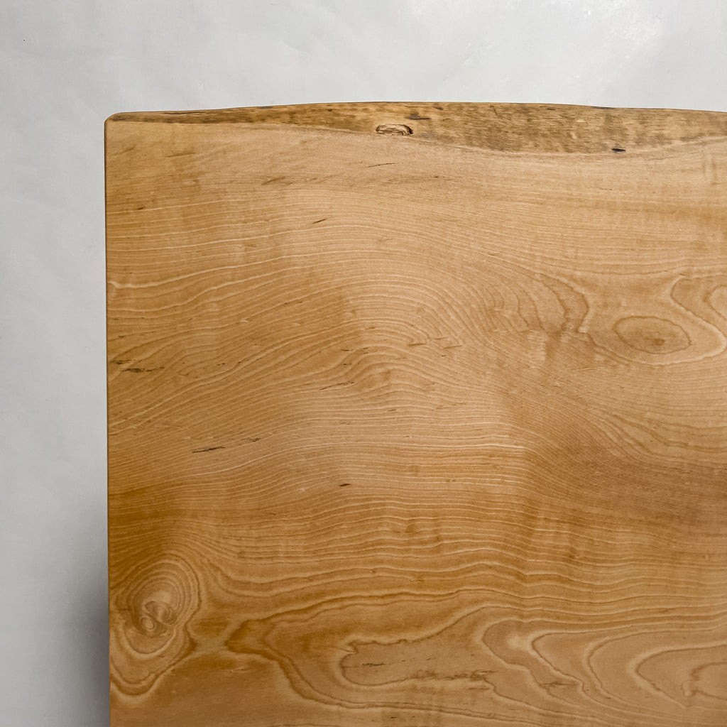 栃ならではの淡い黄金色に、ゆるやかに広がる“玉杢”がやさしい景色を描きます。山の陽を浴び育った流れがそのまま現れ、ほのかな揺らぎを宿す表情が心地よい時間をつくります。自然の輪郭を生かした上品な仕上げの一枚。